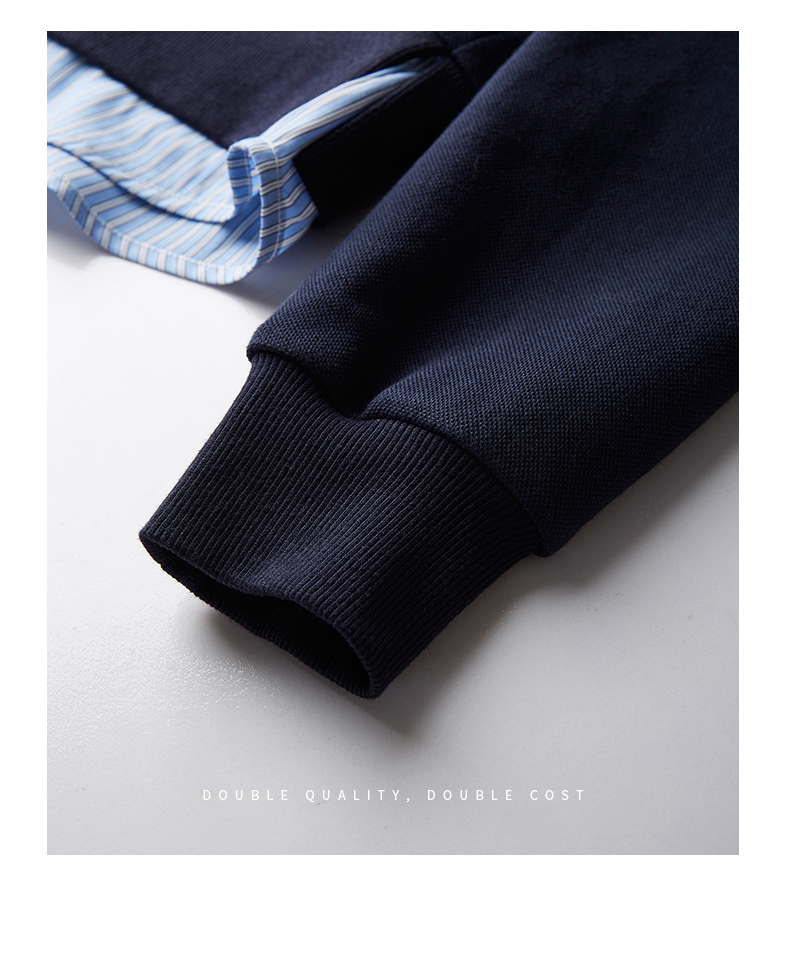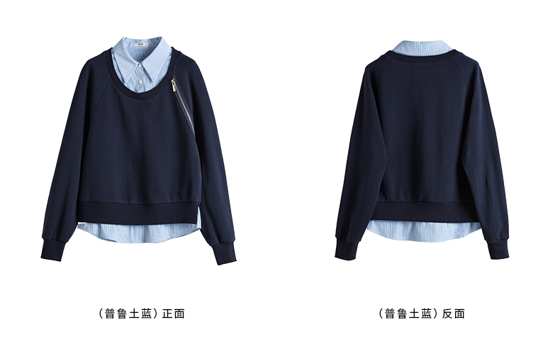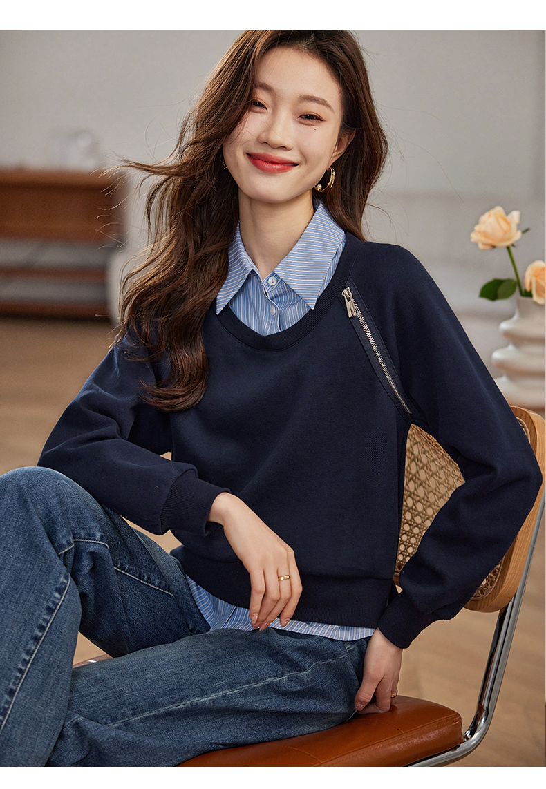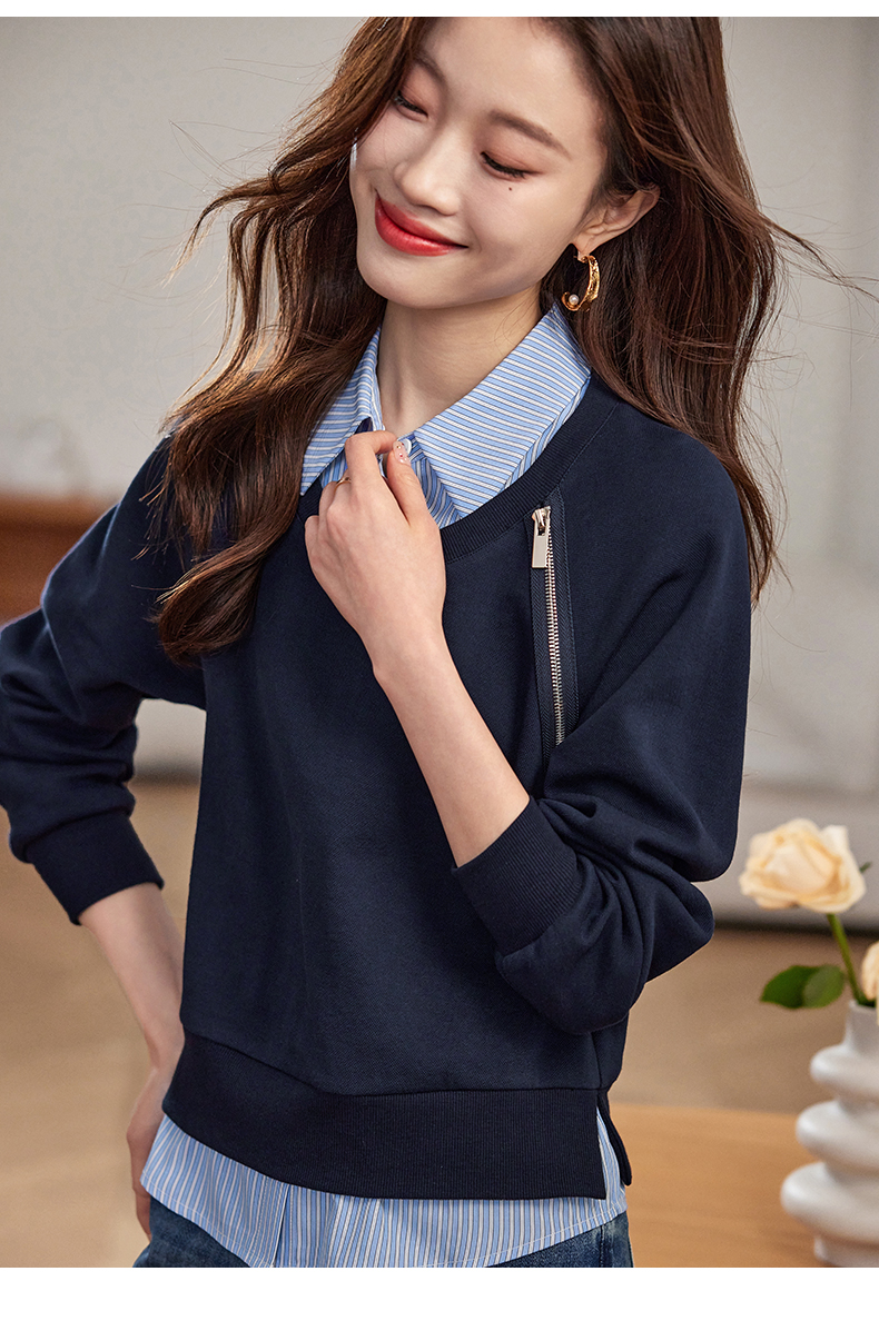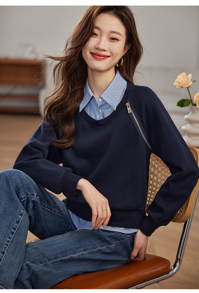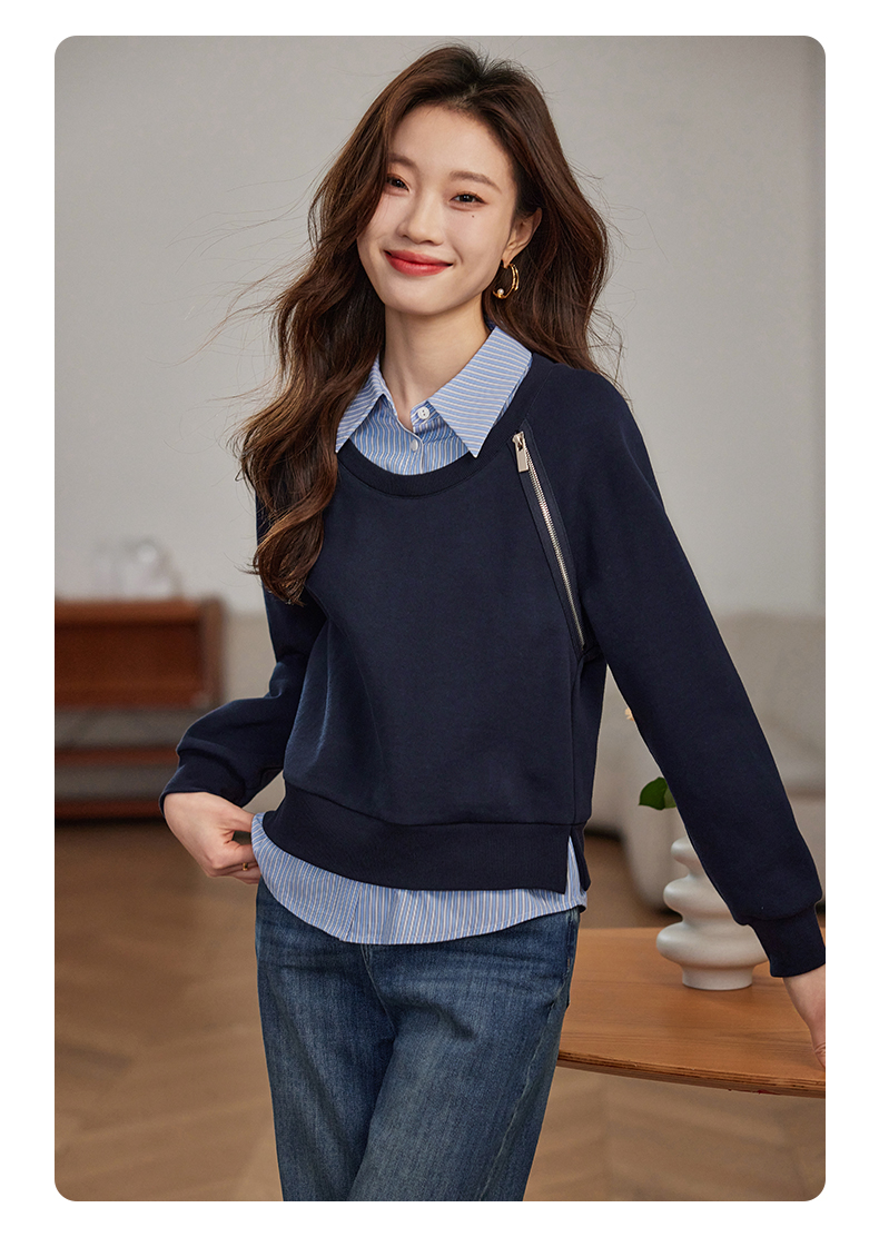 【年终特卖】熙世界设计感斜拉链假两件卫衣女时尚洋气衬衫领拼接上衣2025秋