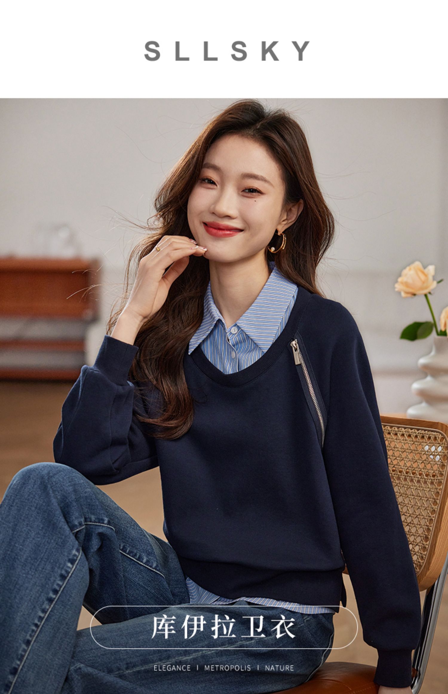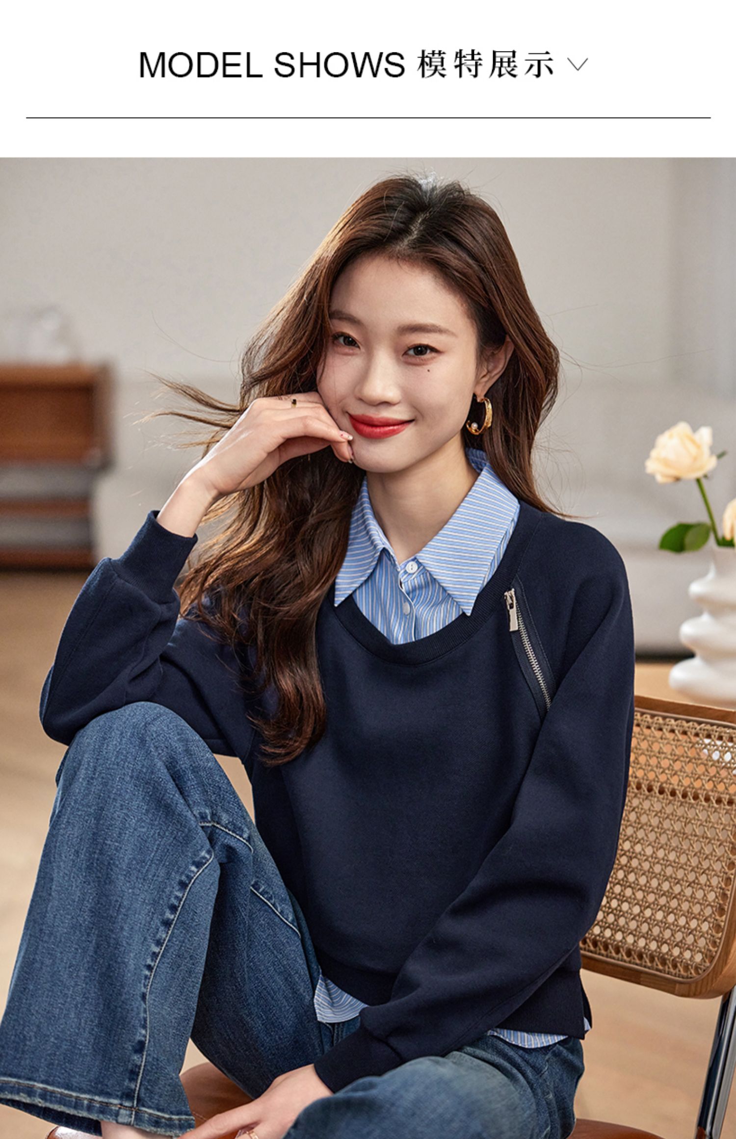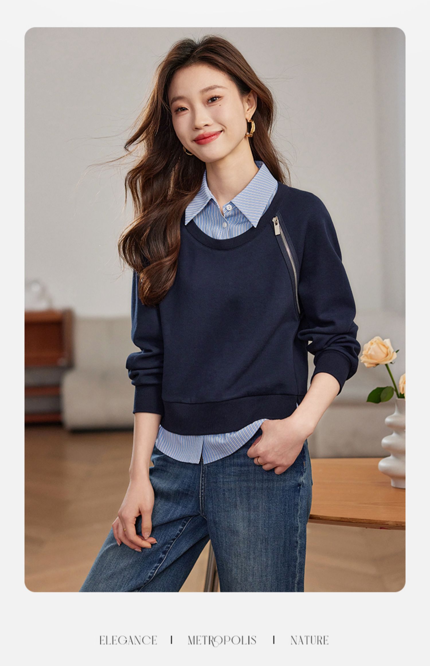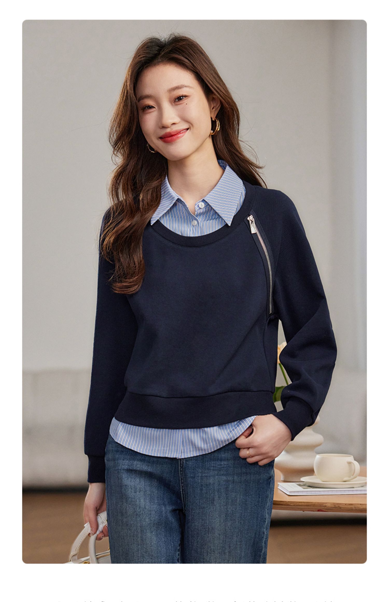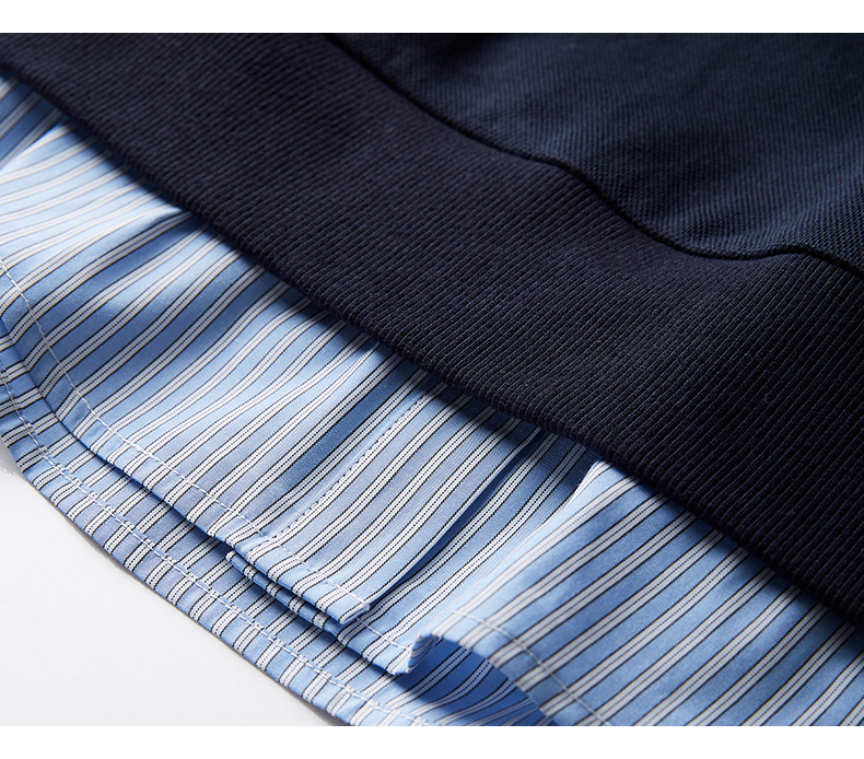 【年终特卖】熙世界设计感斜拉链假两件卫衣女时尚洋气衬衫领拼接上衣2025秋