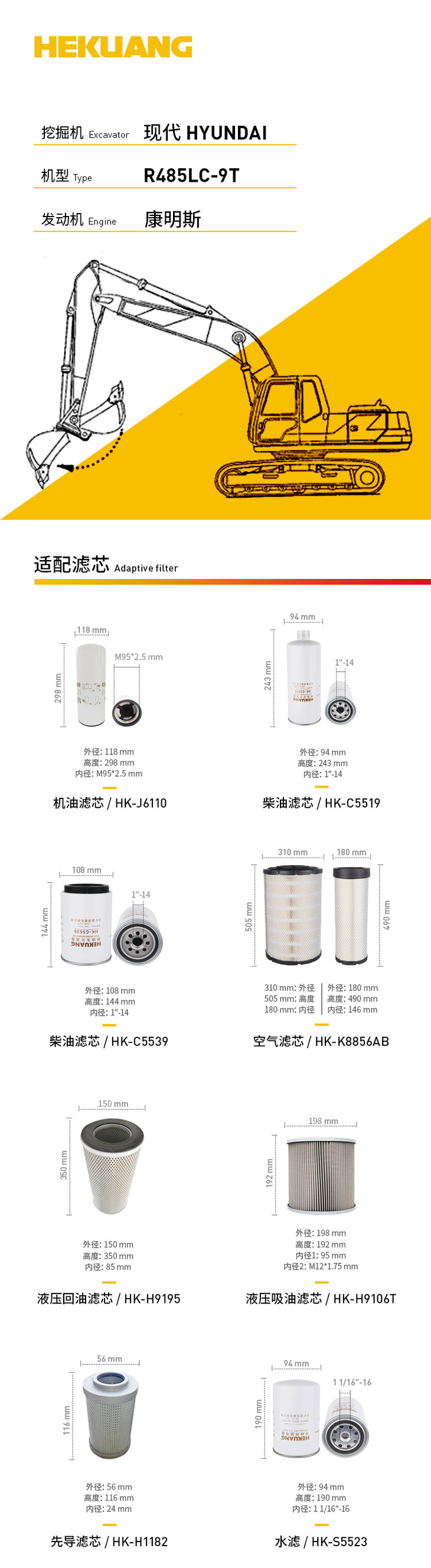 现代R485LC-9T(康明斯)挖掘机滤芯 机油柴油空气滤芯 液压油先导滤芯