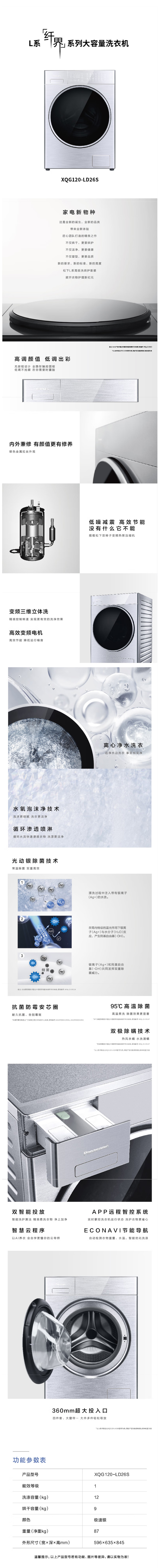 松下 洗衣机 XQG120-LD26S 12KG洗+9KG烘 滚筒 变频 一级能效 前开式 LED显示 冷凝烘干 银色系 不锈钢内筒 全自动