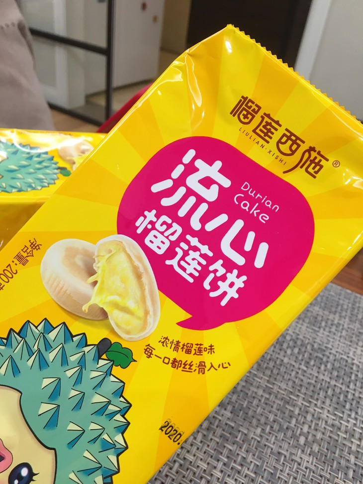 网红美食~~马来西亚猫山王流心榴莲饼~ 打开包装就可以闻到浓郁的榴莲味哦!外层是酥酥的,里面软软的榴莲馅儿超级香甜!小米超级爱吃~~喜欢榴莲的吃货们应该都会无法抗拒 ! 一包里面有独立包装的4个,一个吃下肚,就很有满足感啦 !老米优品
