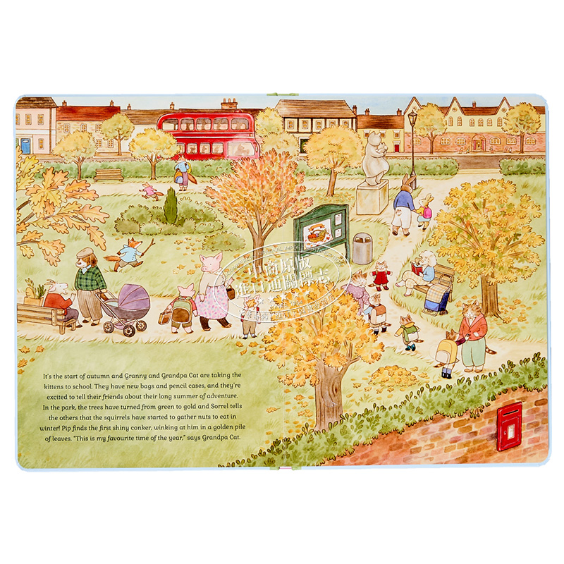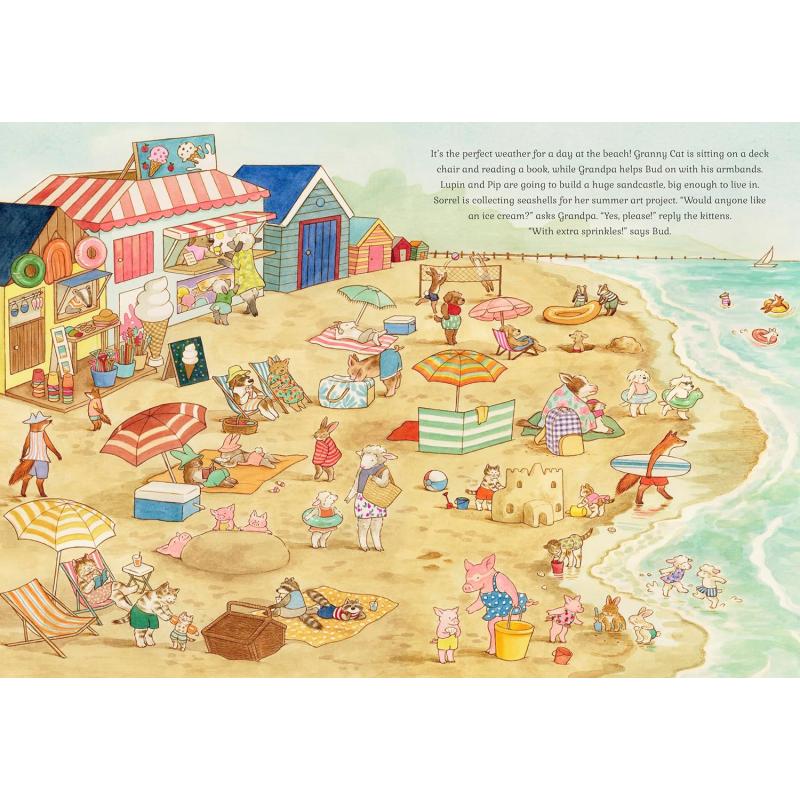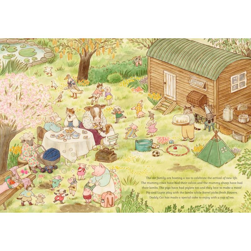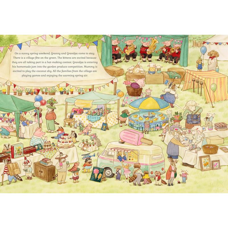 In spring, follow the cats as they help Grandma and Grandpa Cat in the garden, celebrate new beginnings and visit the village fete. In summer, join the kittens as they build sandcastles on the beach, go on a camping holiday in the countryside and take a train ride to visit their grandparents. In autumn, come along on a nature walk, carve pumpkins for Halloween and harvest fruit and vegetables. In winter, enjoy a snowy day building snowcats, celebrate Christmas and ring in the New Year.