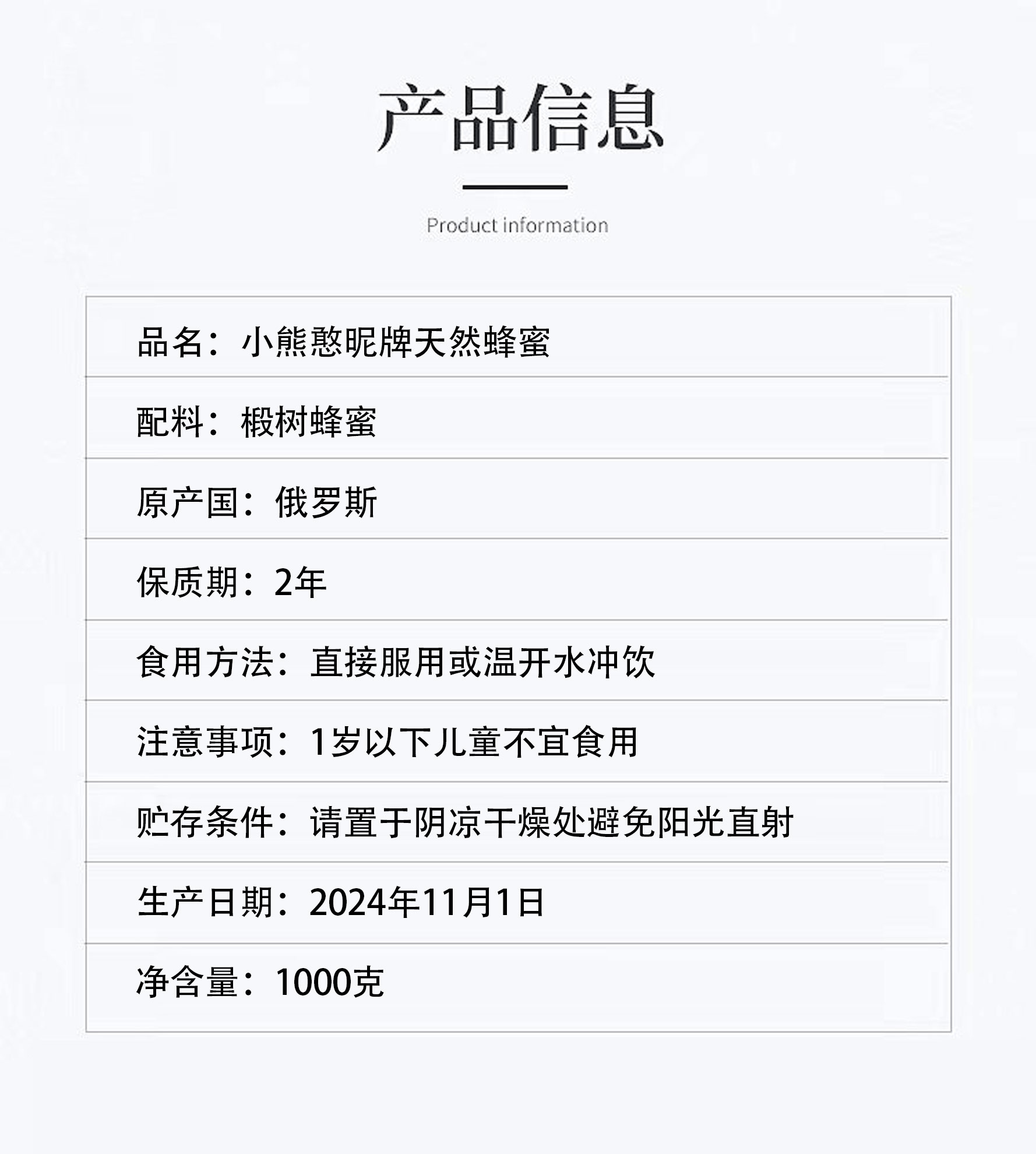 因为蜂蜜是俄罗斯原瓶进口,由于俄罗斯椴树蜜采蜜时间段有限 (每年仅6—9月为采蜜期) ,加上从国外报关和运输到国内需2个月左右时间,目前在售的蜂蜜全部为:2024年11月1号左右在俄罗斯境 内生产,入关进口日期为2024年12月2号左右,保质期为2年(注:纯天然蜂蜜在密封良好且储存于阴凉干燥环境可保存3-5年不影响品质和口感)介者勿拍!