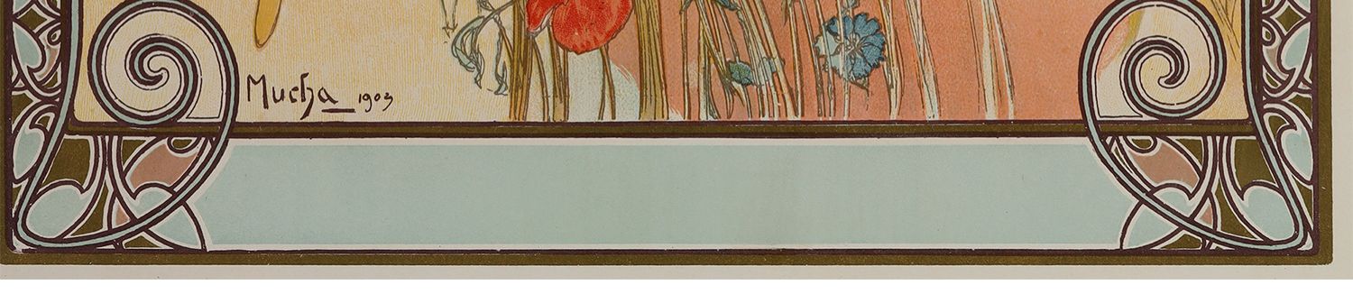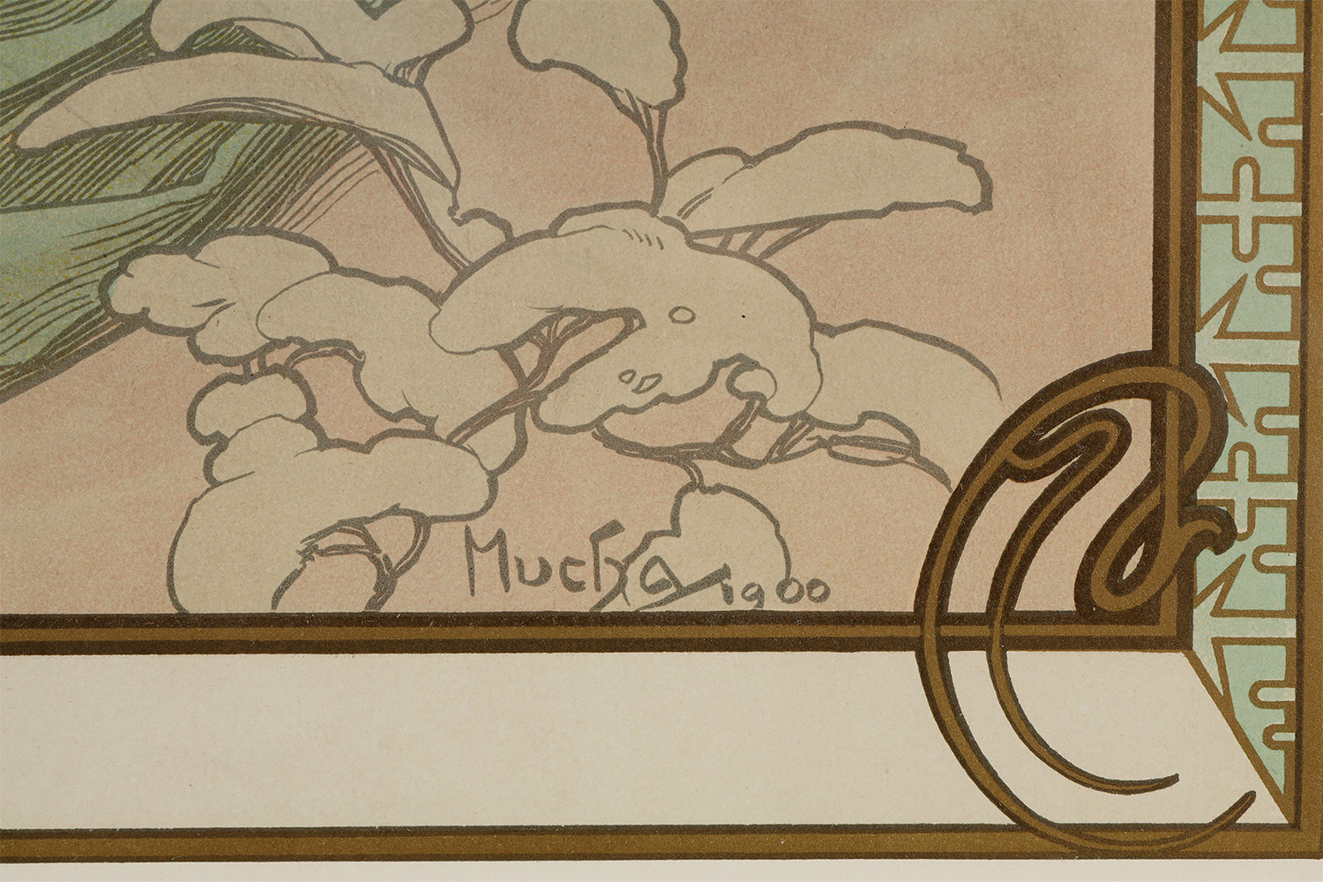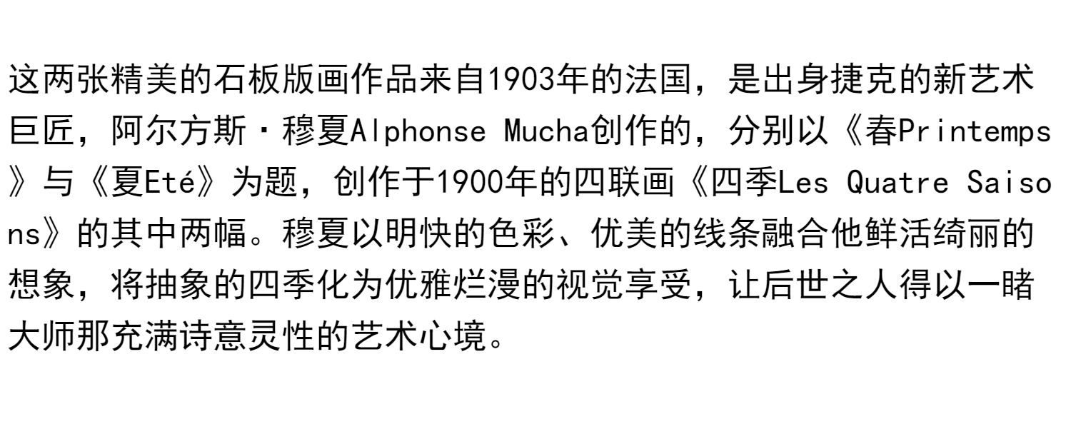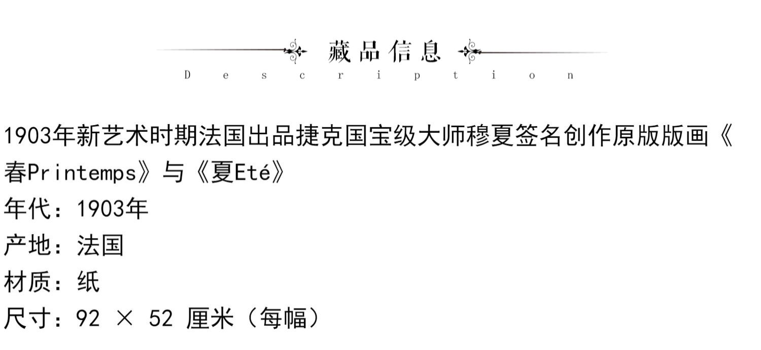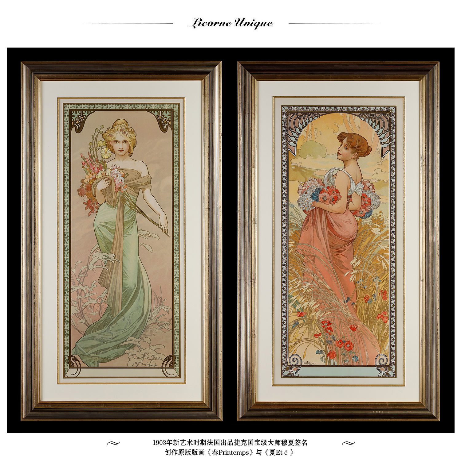 独角鹿西洋古董新艺术时期穆夏签名原版版画春Printemps与夏Eté