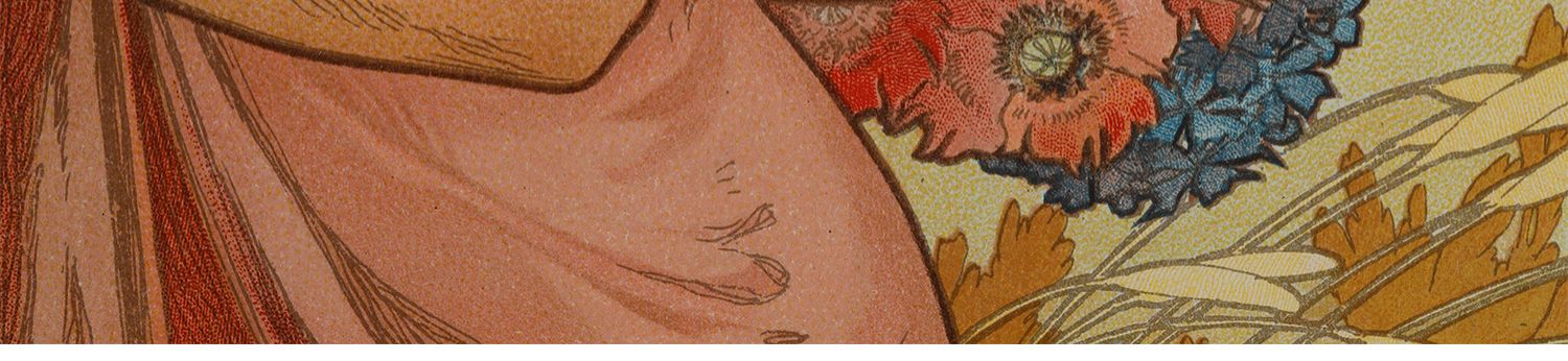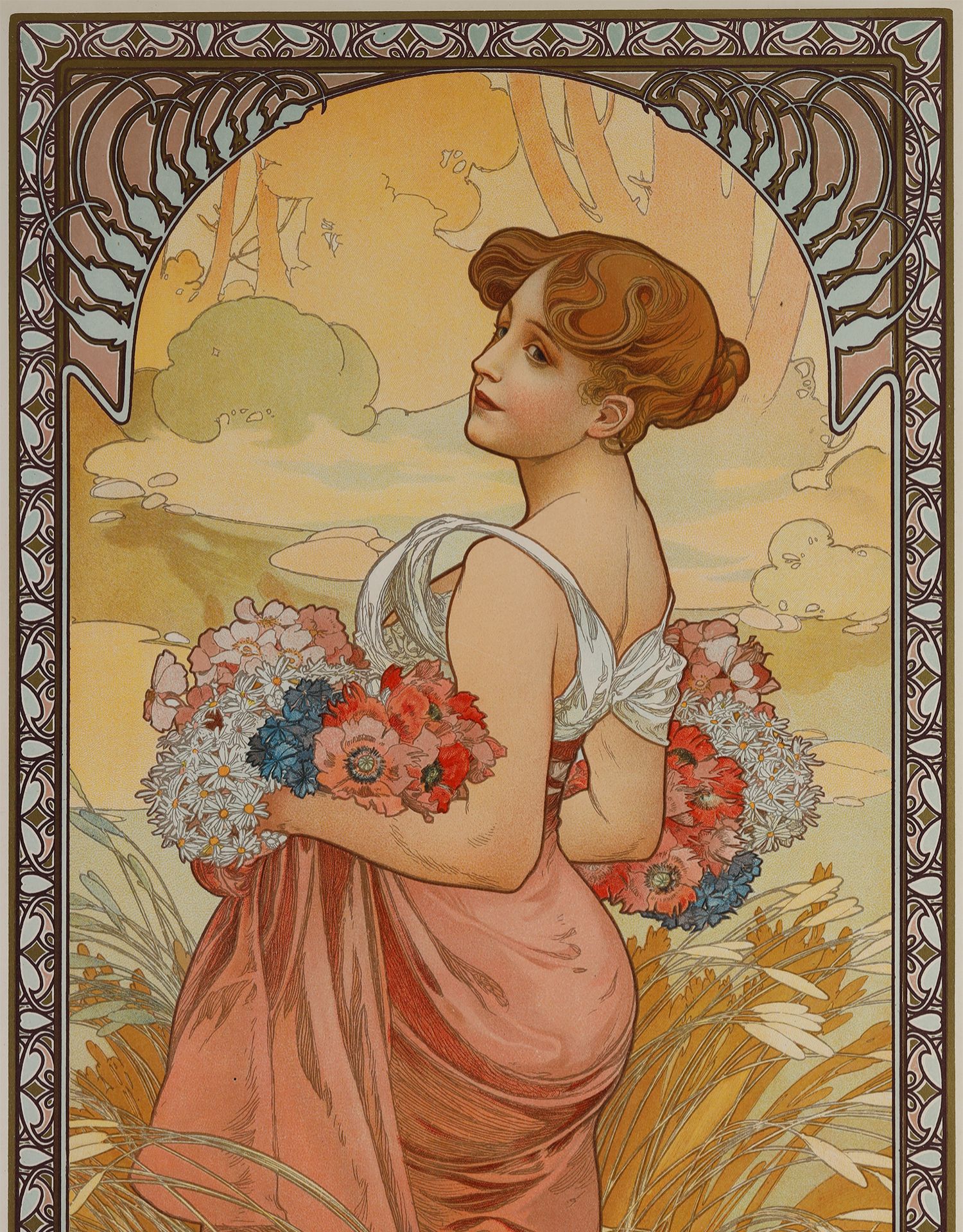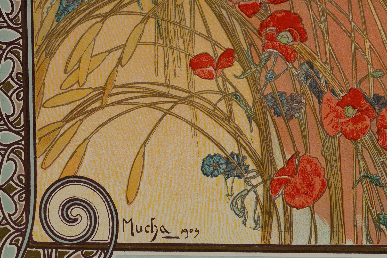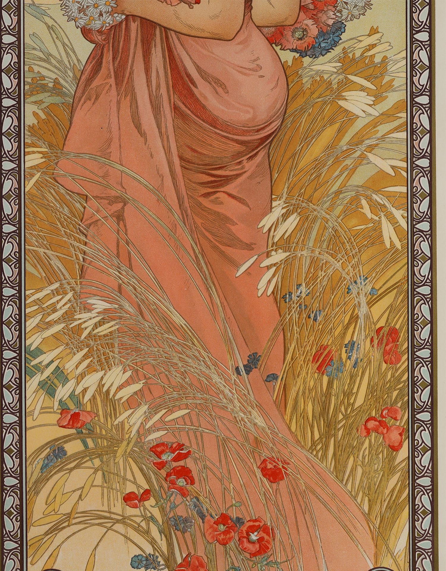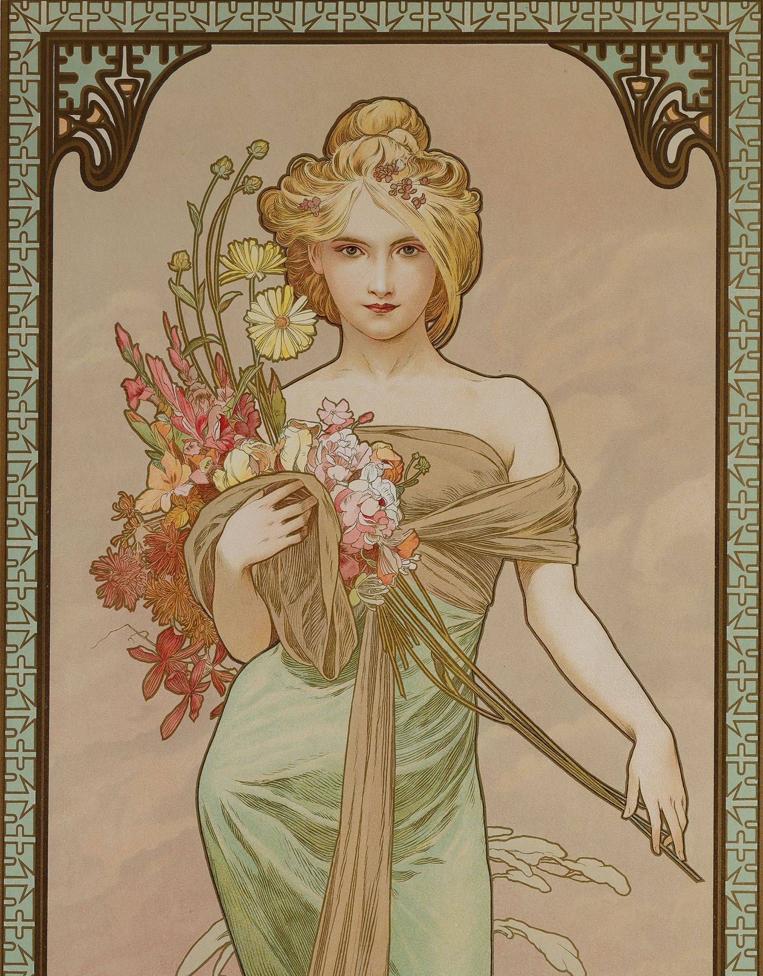独角鹿西洋古董新艺术时期穆夏签名原版版画春Printemps与夏Eté