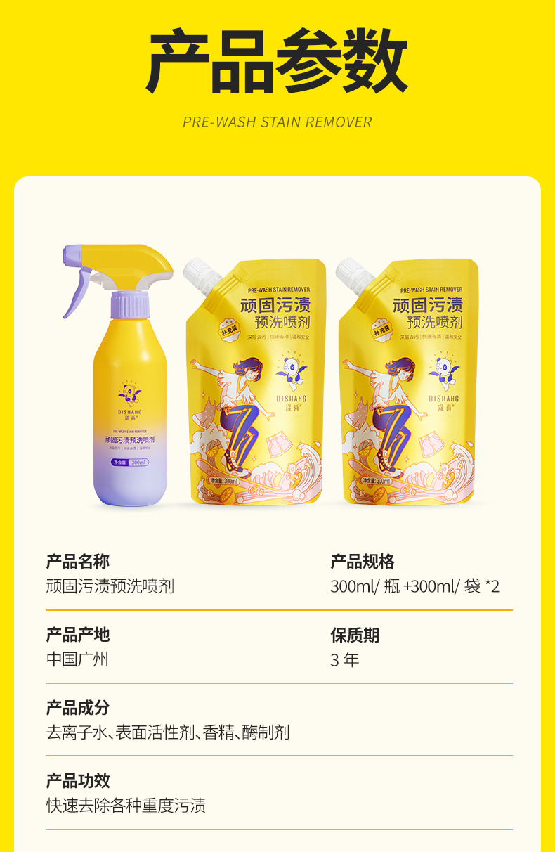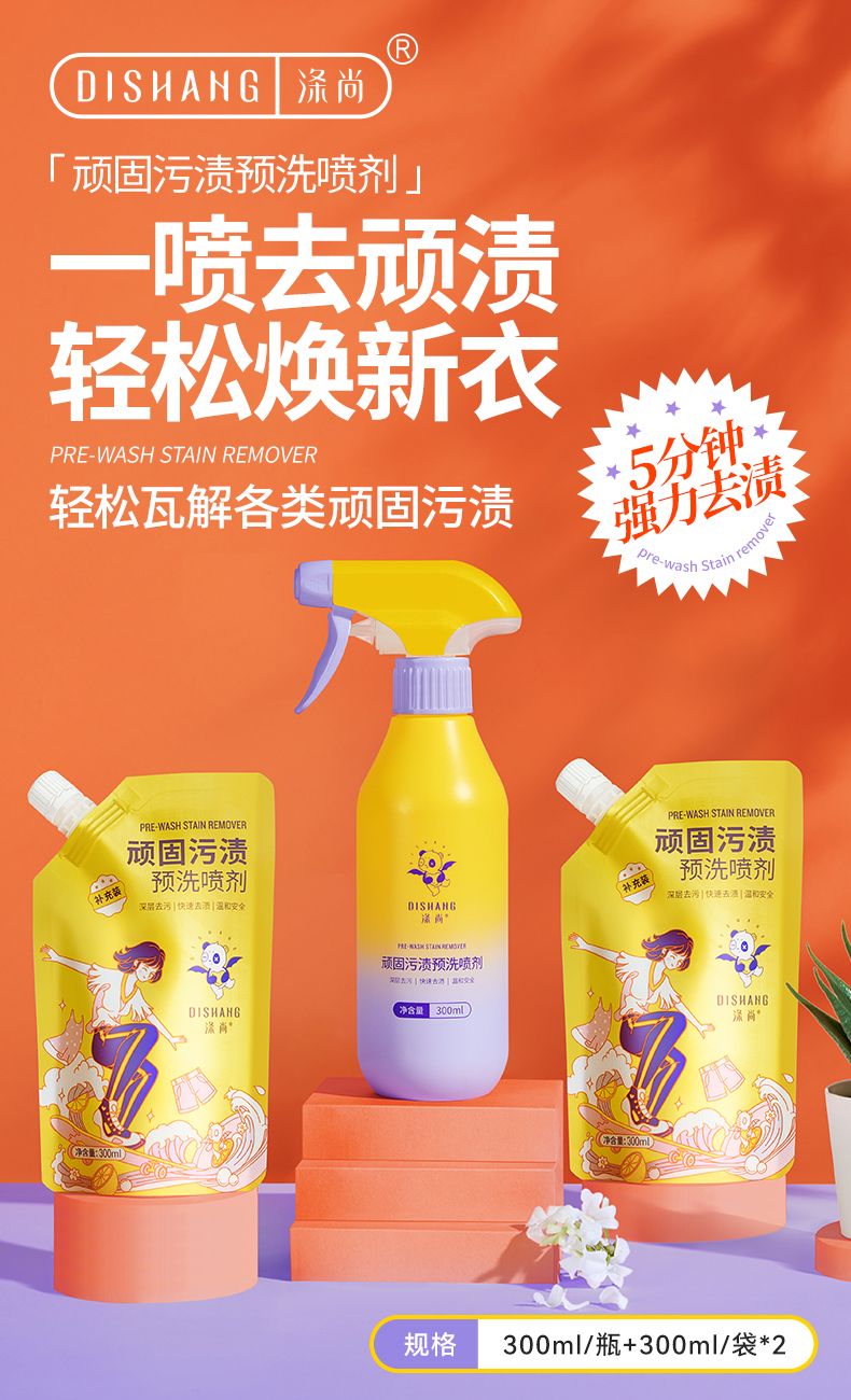 【26号首日59到手5件 =1瓶+4袋】涤尚顽固污渍预洗喷剂组合300ml/瓶+300ml/袋*2 5分钟轻松去污-FF
