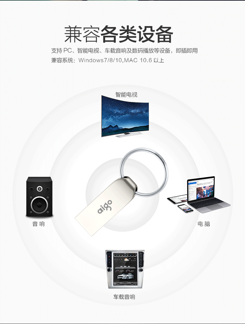 爱国者(aigo)8GB USB2.0 U盘 U268迷你款 银色 金属车载U盘