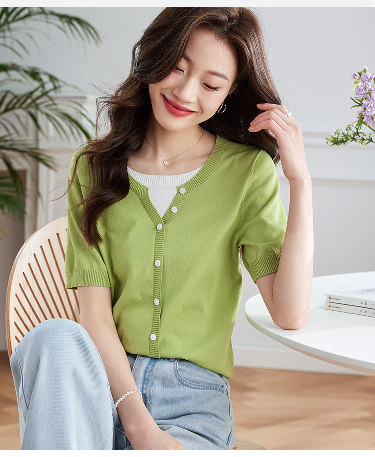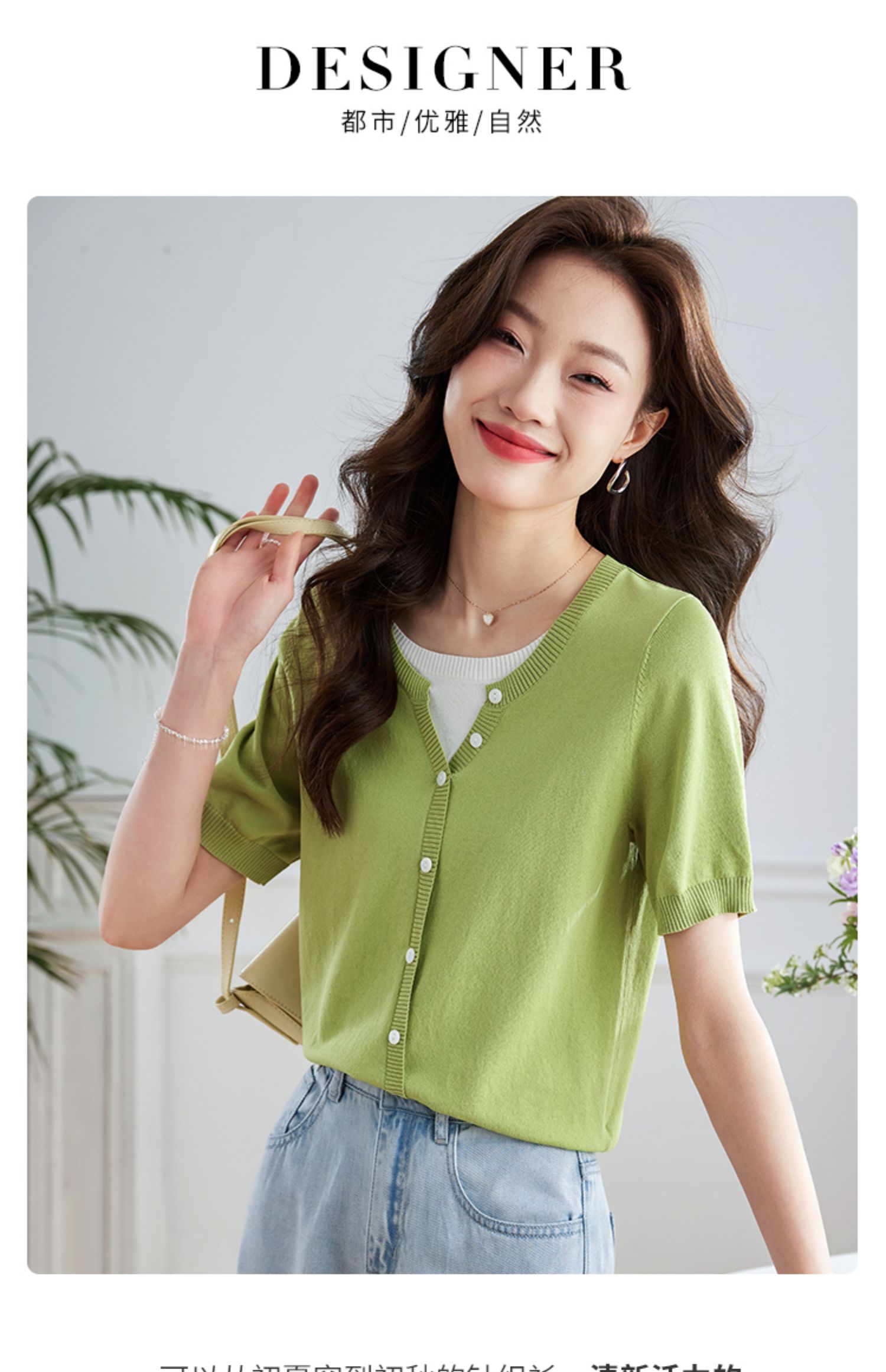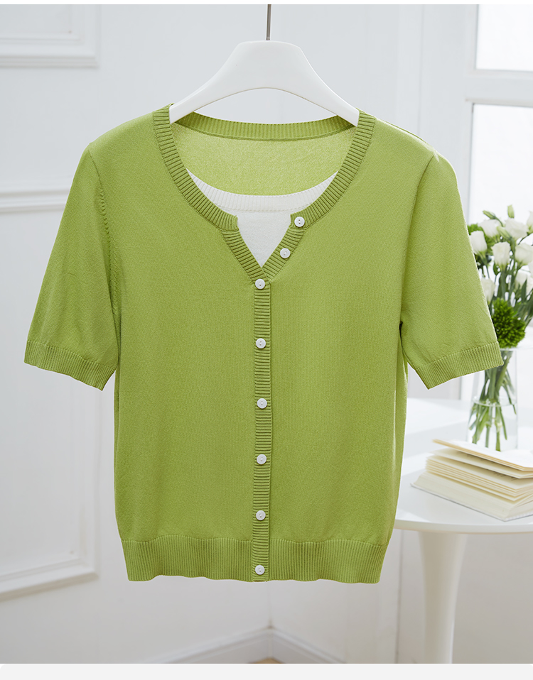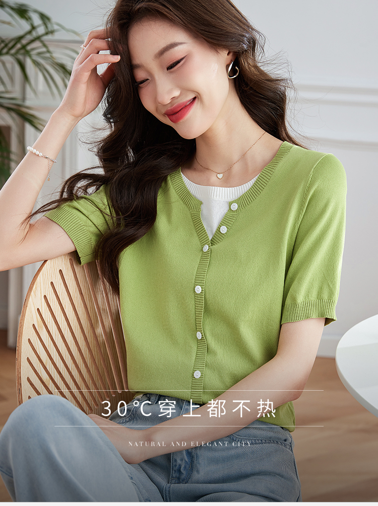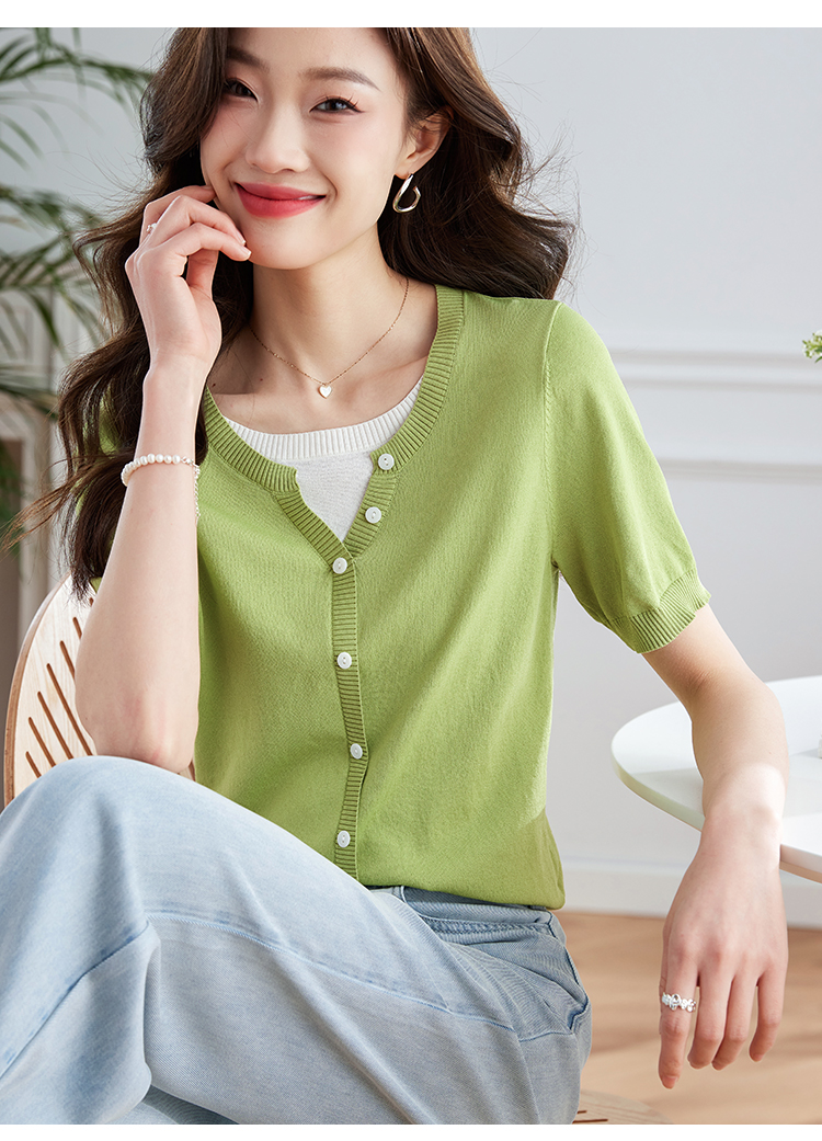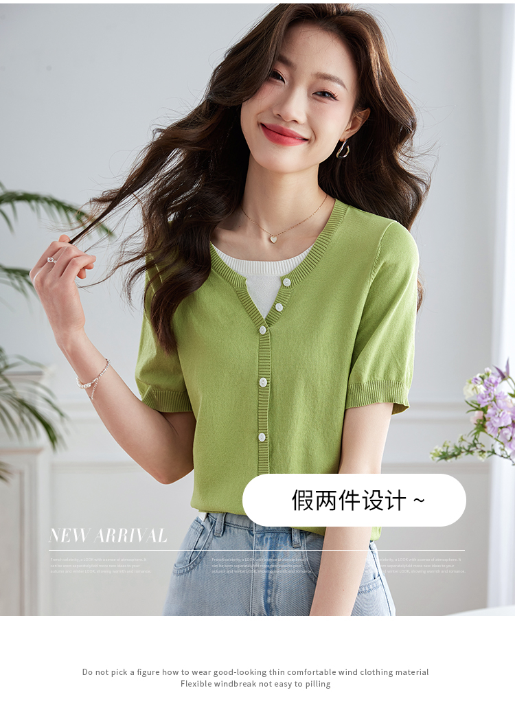 【专属特价】熙世界假两件短袖针织衫女薄款2025春夏新款别致冰丝上衣