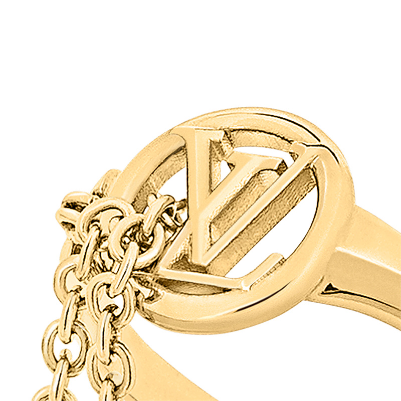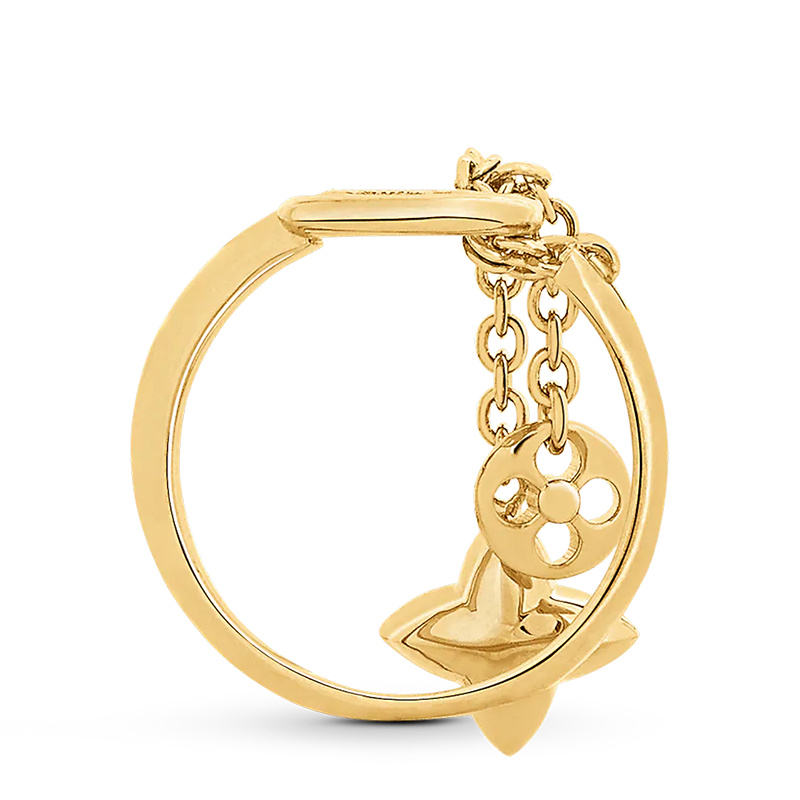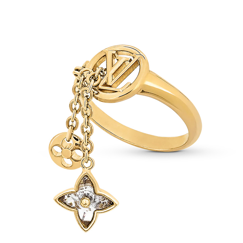 My Blooming Strass 戒指瞩目焕新经典 LV Circle 标识,将 Monogram 花卉从其中穿过后悬挂,宛如瀑布般在指间舞动。透明人造钻石闪耀璀璨光芒。