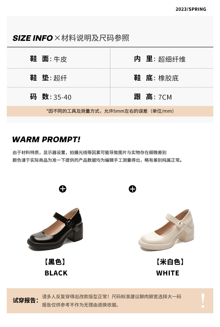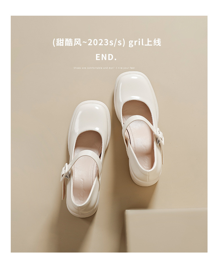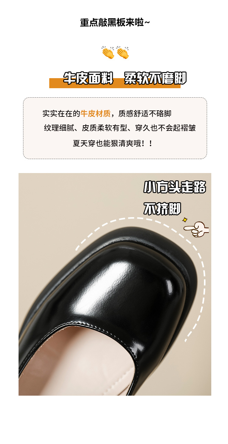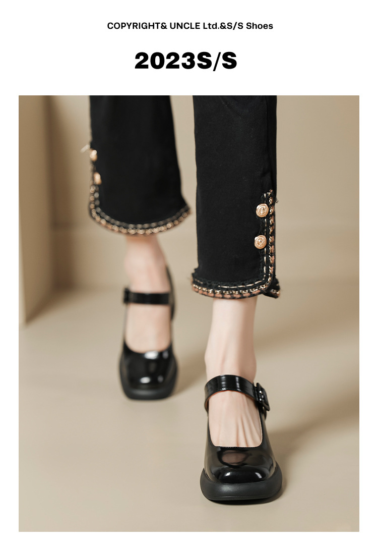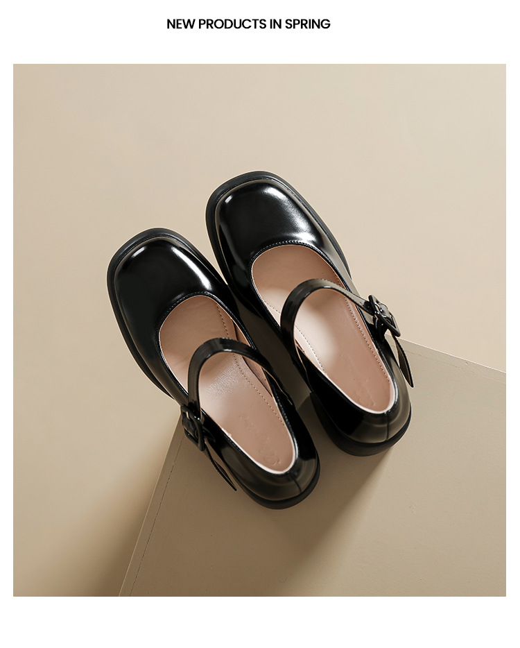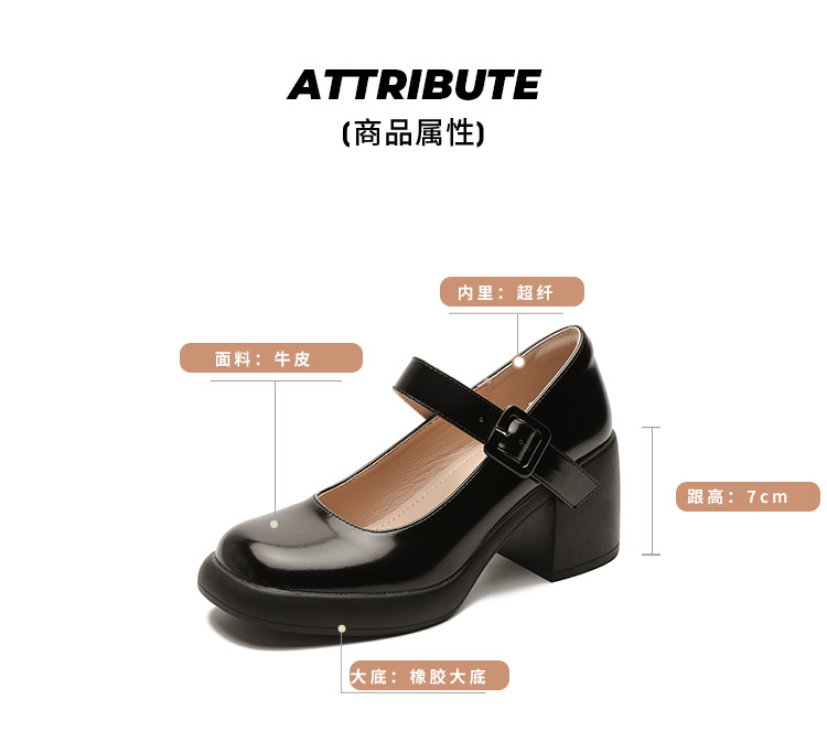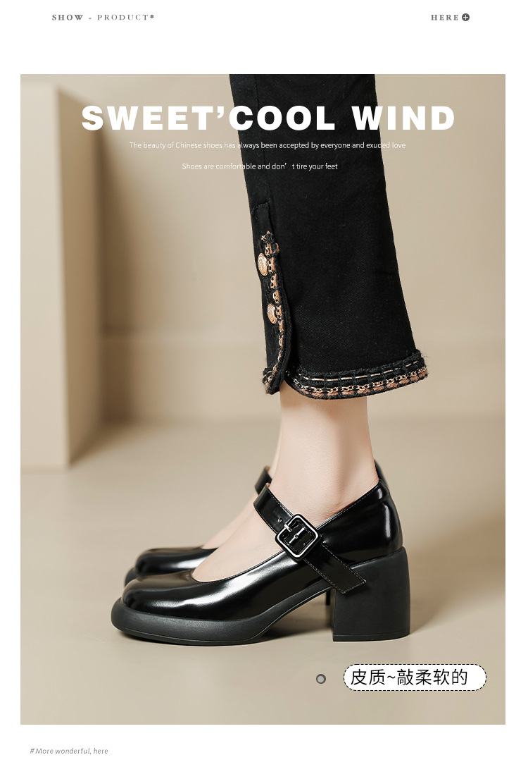 2023春季真皮玛丽珍粗跟单鞋女法式复古高跟鞋一字带浅口仙女鞋