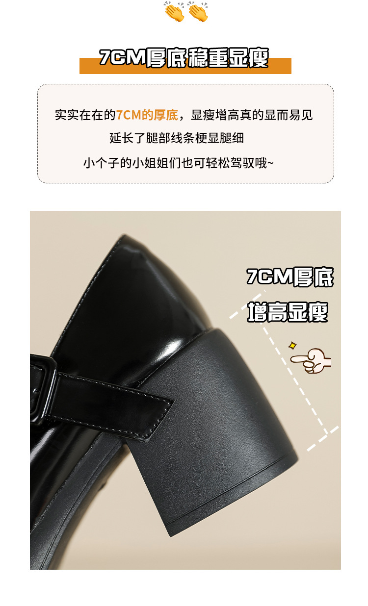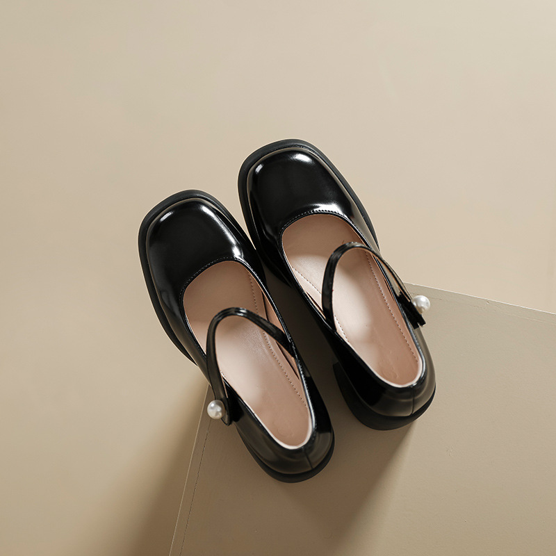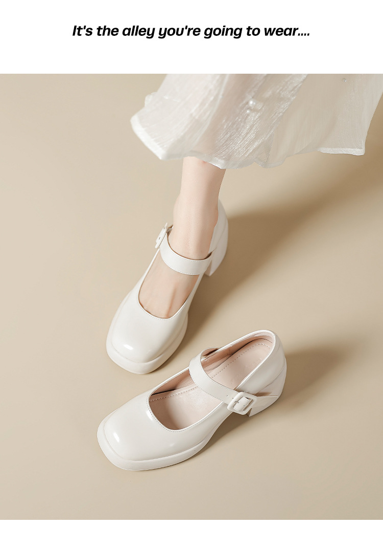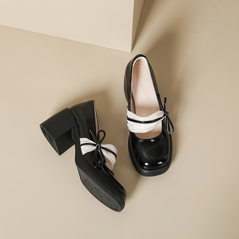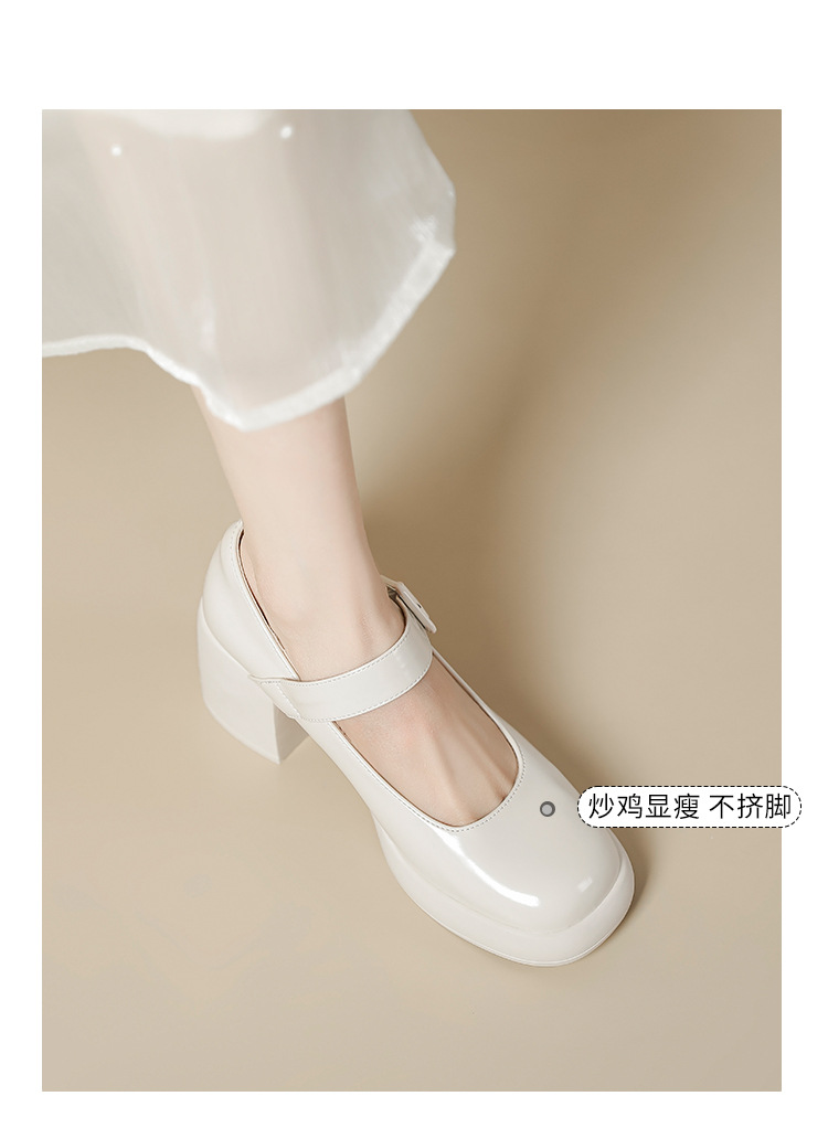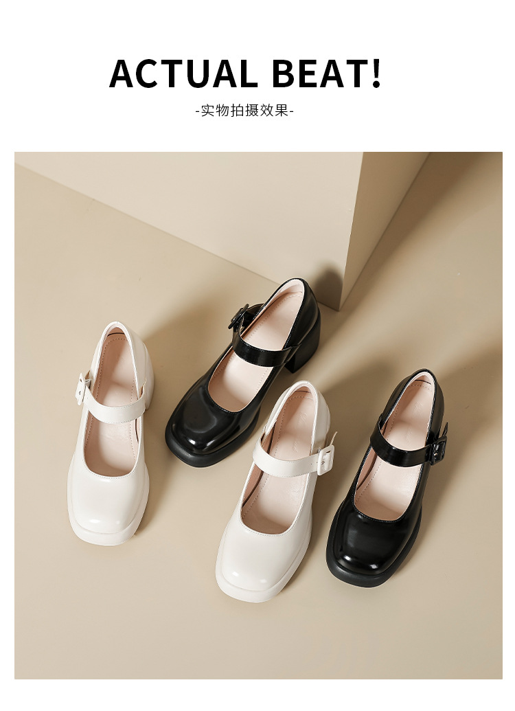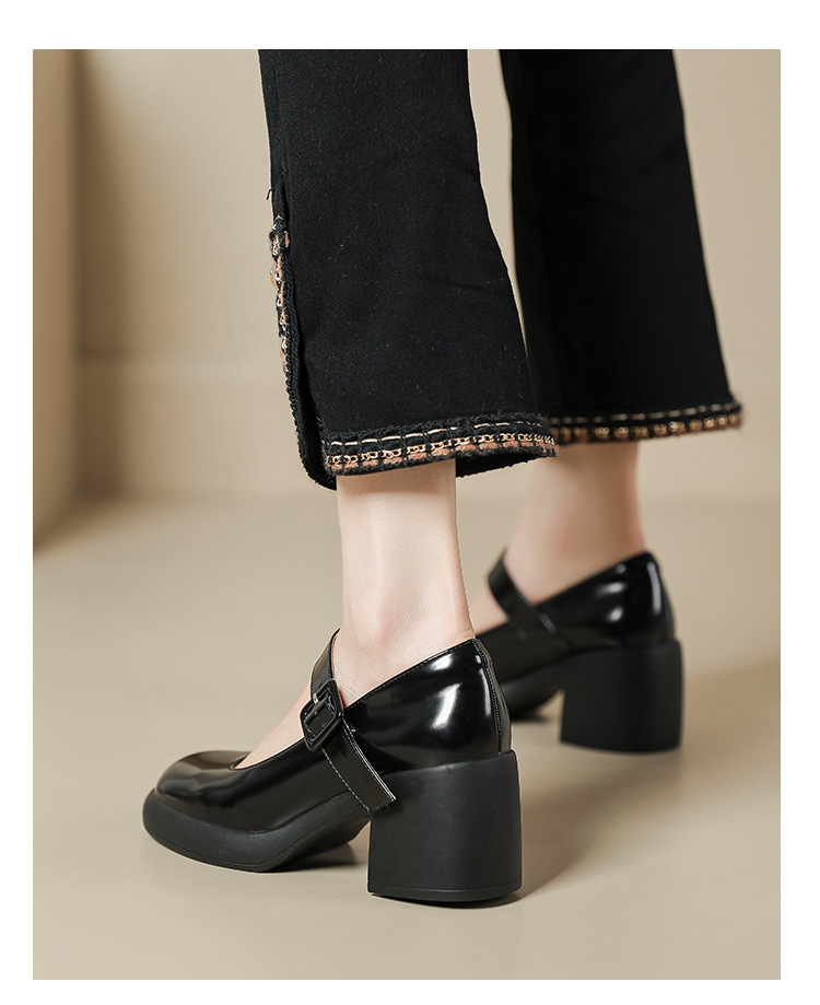 2023春季真皮玛丽珍粗跟单鞋女法式复古高跟鞋一字带浅口仙女鞋