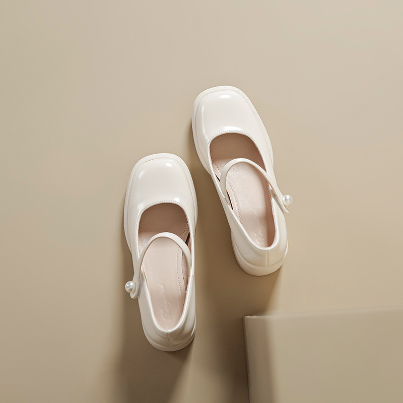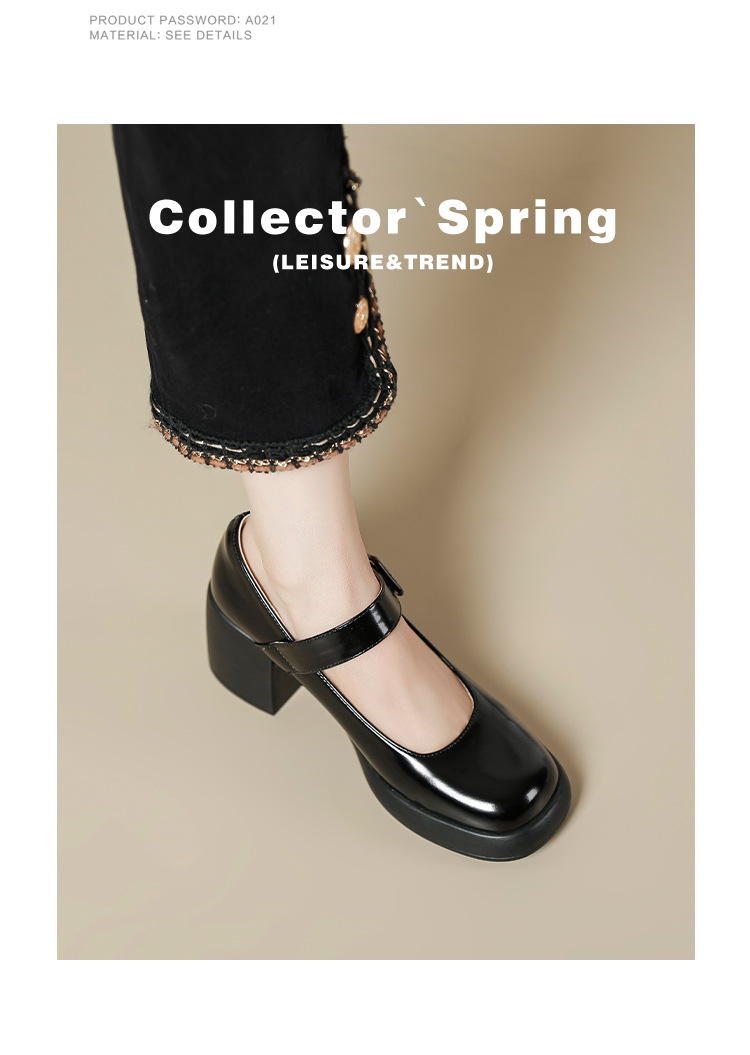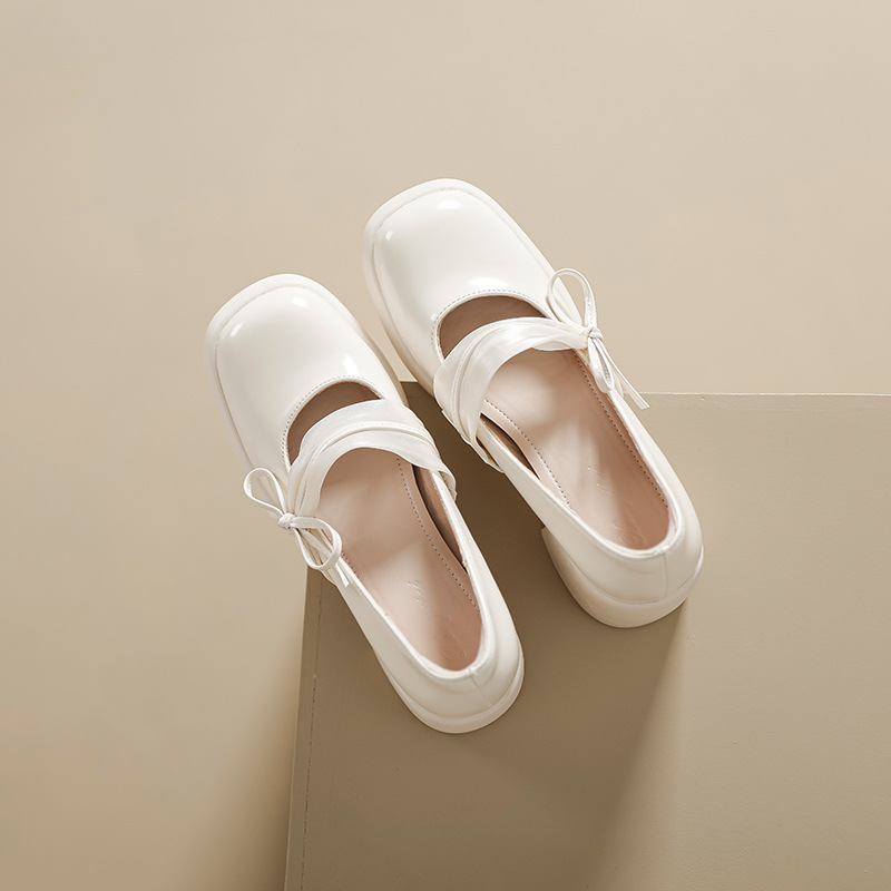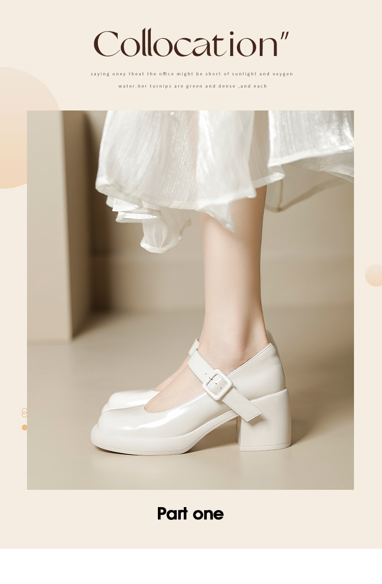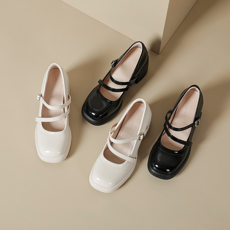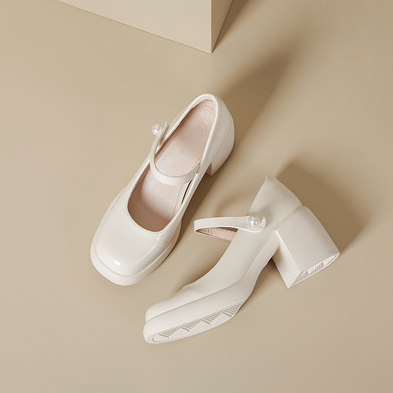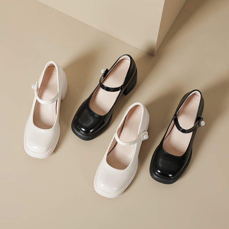2023春季真皮玛丽珍粗跟单鞋女法式复古高跟鞋一字带浅口仙女鞋