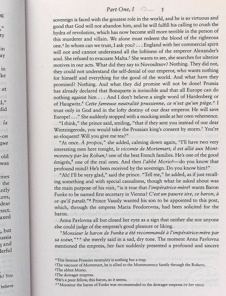 由《安娜·卡列尼娜》和《卡拉马佐夫兄弟》两位获奖的翻译家推出了托尔斯泰这部杰作的新译本。《和平》主要讲述的是拿破仑1812年入侵俄国的故事,讲述了文学中最著名的三个人物的故事:皮埃尔·别祖霍夫,一个伯爵的私生子,他为自己的继承权而战,渴望精神上的满足;安德烈·博尔孔斯基公爵,他撇下家眷,参加了反对拿破仑的战争;还有娜塔莎·罗斯托夫,她是一个贵族的年轻美貌的女儿,与两个人都有私情。当拿破仑的军队入侵时,托尔斯泰出色地刻画了来自不同背景的人物——农民和贵族,平民和士兵,他们与他们的时代、他们的历史和他们的文化所特有的问题作斗争。随着小说的发展,这些角色超越了自身的特殊性,成为世界文学中最感人、最具人情味的人物。”
