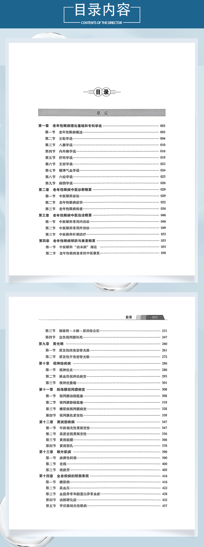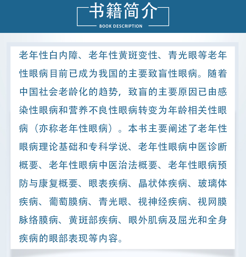 老年性白内障、老年性黄斑变性、青光眼等老年性眼病目前已成为我国的主要致盲性眼病。随着中国社会老龄化的趋势,致盲的主要原因已由感染性眼病和营养不良性眼病转变为年龄相关性眼病(亦称老年性眼病)。本书主要阐述了老年性眼病理论基础和专科学说、老年性眼病中医诊断概要、老年性眼病中医治法概要、老年性眼病预防与康复概要、眼表疾病、晶状体疾病、玻璃体疾病、葡萄膜病、青光眼、视神经疾病、视网膜脉络膜病、黄斑部疾病、眼外肌病及屈光和全身疾病的眼部表现等内容。