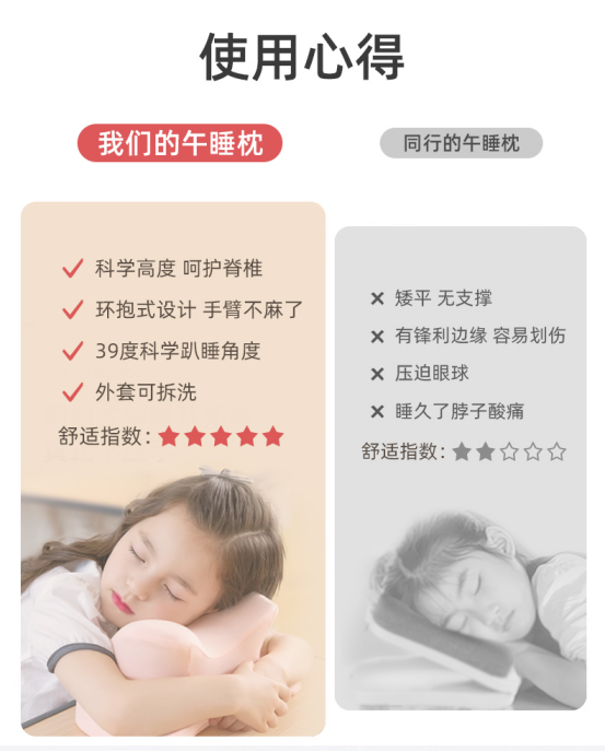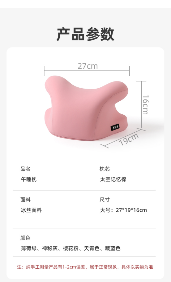 最新升级款第三代设计 拥抱式午睡,让人更能放松,更有安全感! 内里填充记忆棉,柔软有支撑,久用不塌陷 透气针织面料,一点也不会闷热 增高护脊趴睡,预防脊椎变形 内凹曲面设计,不压眼球不压脸 记忆绵柔韧支撑,足够的柔软