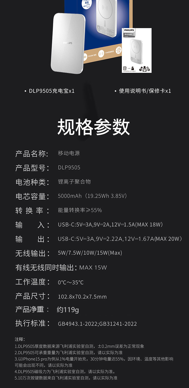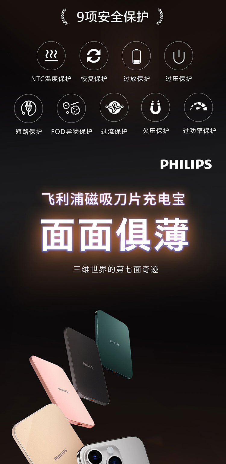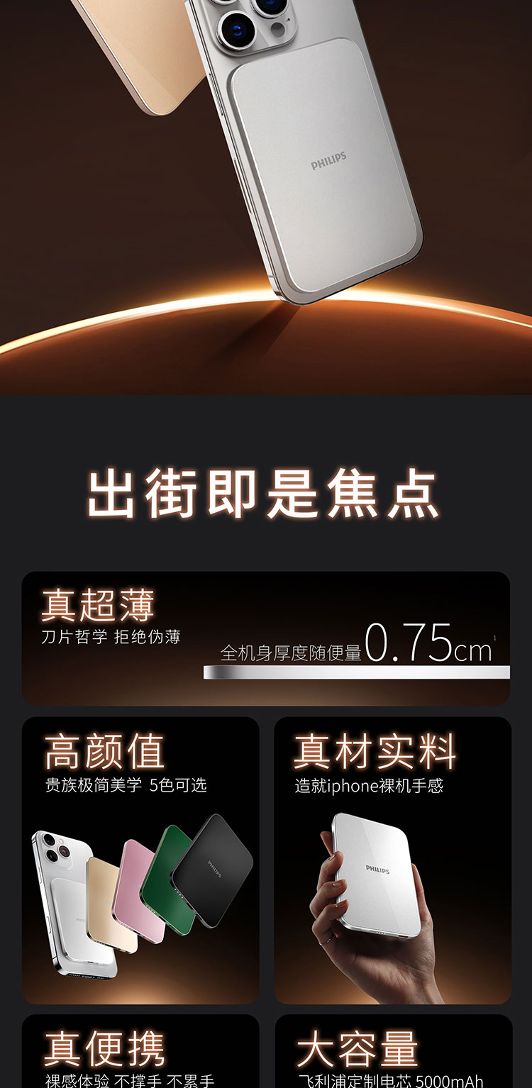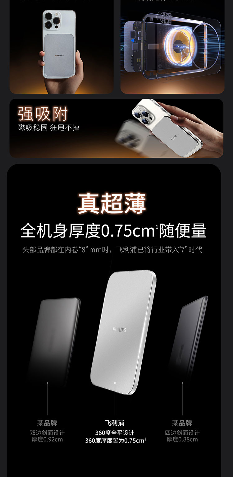 飞利浦(PHILIPS)磁吸充电宝可携带上飞机 3C认证 充电宝超薄5000毫安超轻薄充电宝超级快充无线快充迷你小巧便携 DLP9505 【0.75cm超薄磁吸】