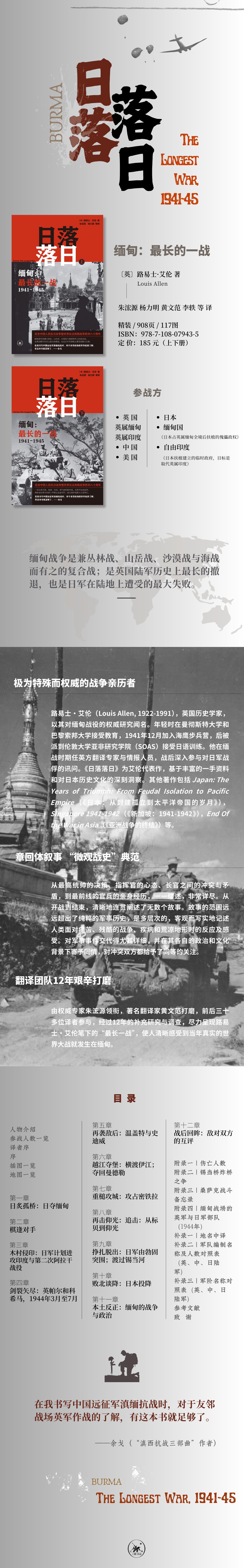 路易士·艾伦为缅甸战争期间英方的翻译与情报专家,战后深入参与对日军战俘的讯问。他以亲历者与观察者的双重视角,结合珍稀一手史料,历时四十年呕心沥血写成此书。本书被誉为“关于缅甸战场最详细和权威的著作之一”,中译以“日落落日”为题,象征着日不落的英国与太阳旗国日本在战争中的兴衰更迭,试图传达这部力作的史诗气质。