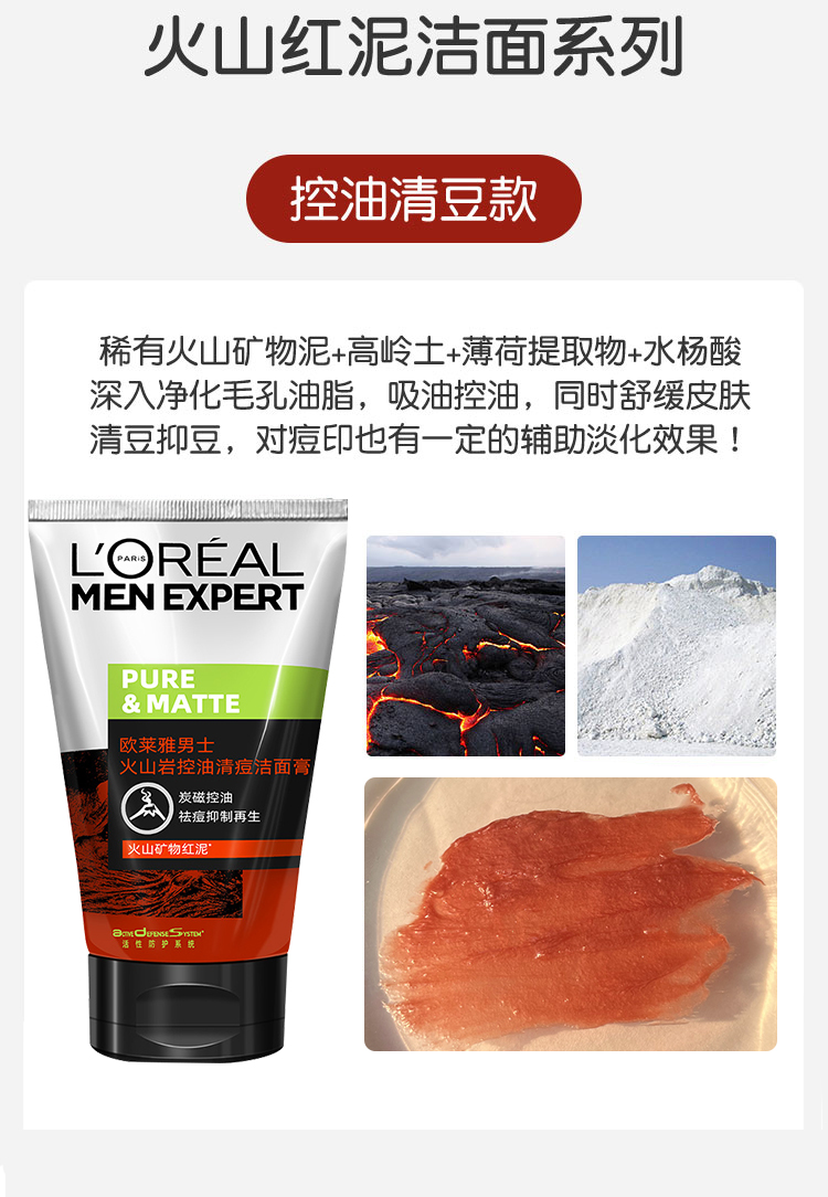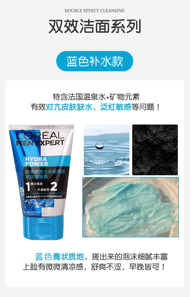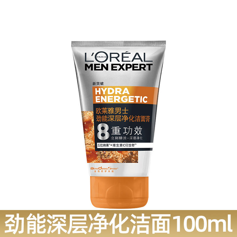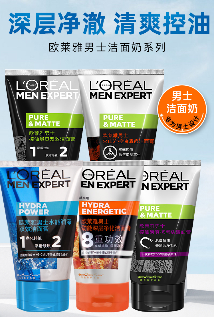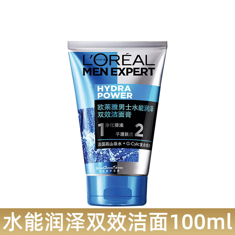 L'ORÉAL欧莱雅男士洁面膏100ml多款任选水能润泽双效火山岩清痘洁面膏洗面奶
