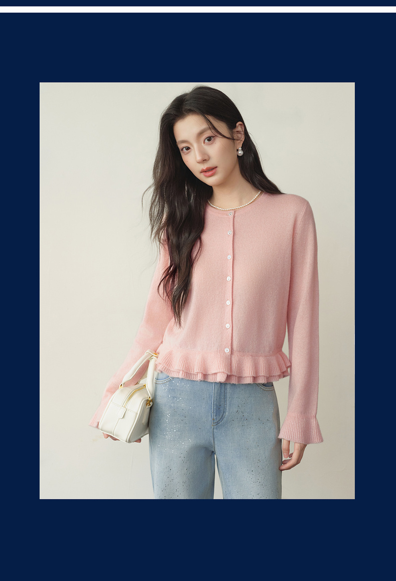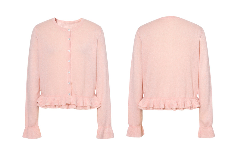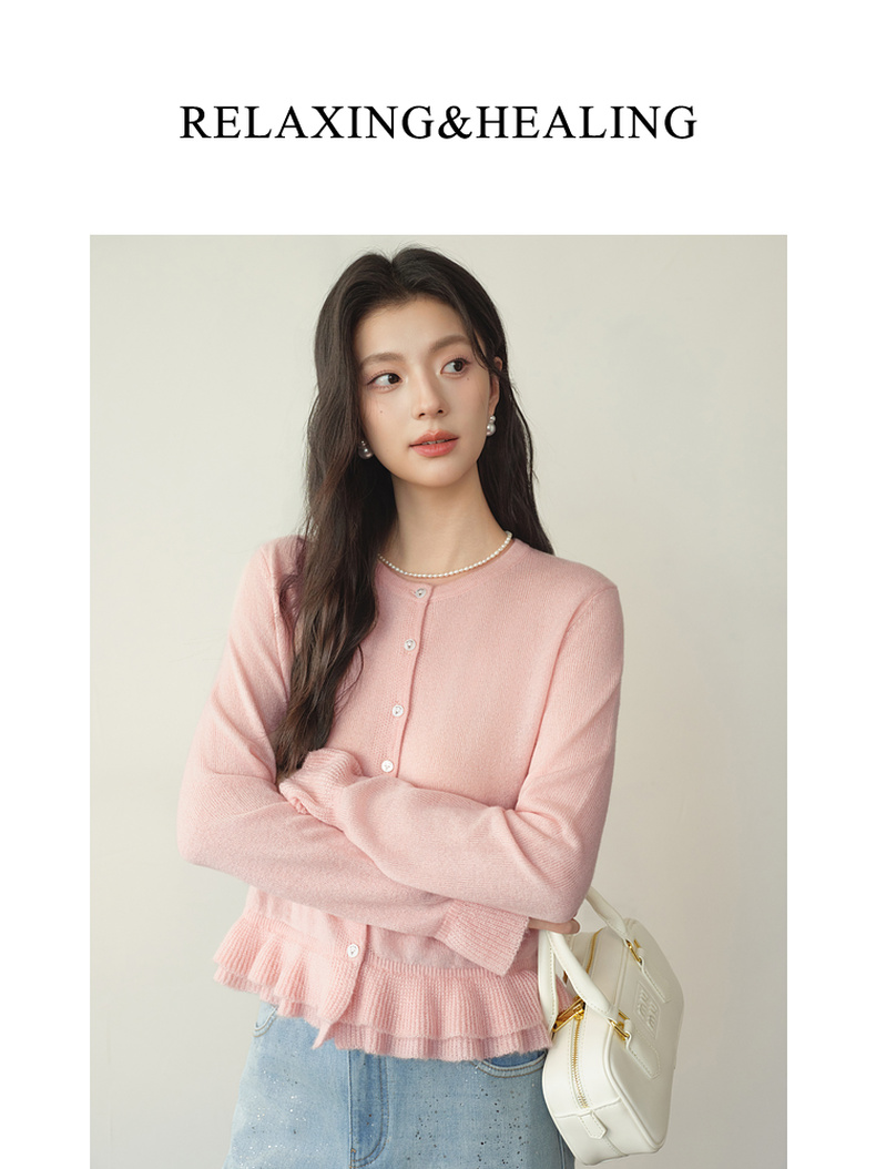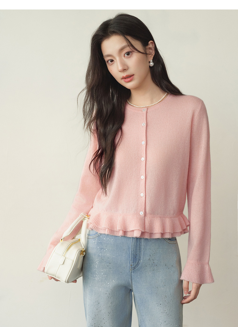 【严选】诗凡黎莱赛尔木耳边针织开衫2026春新款粉色温柔氛围感长袖上衣女7H2230391