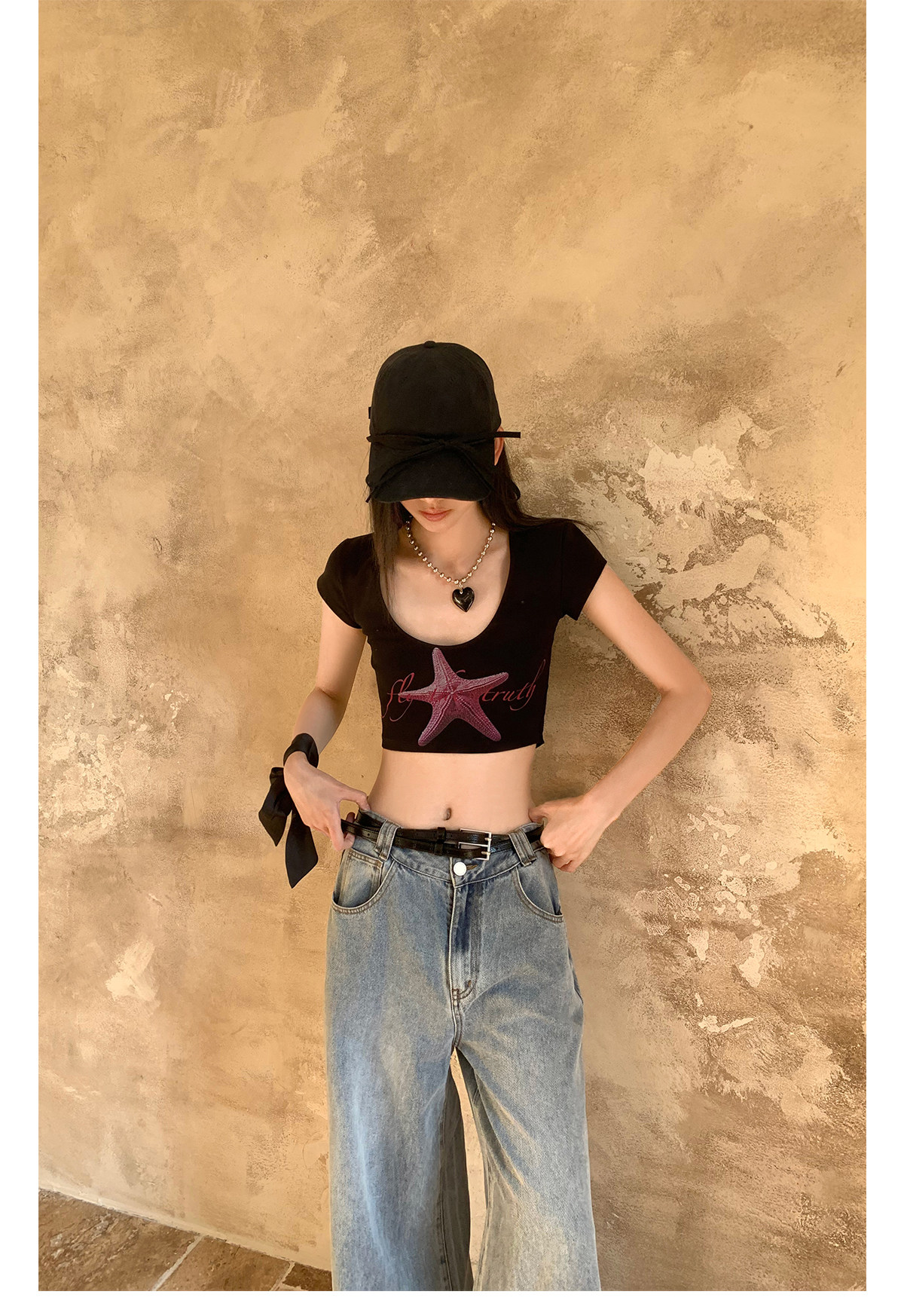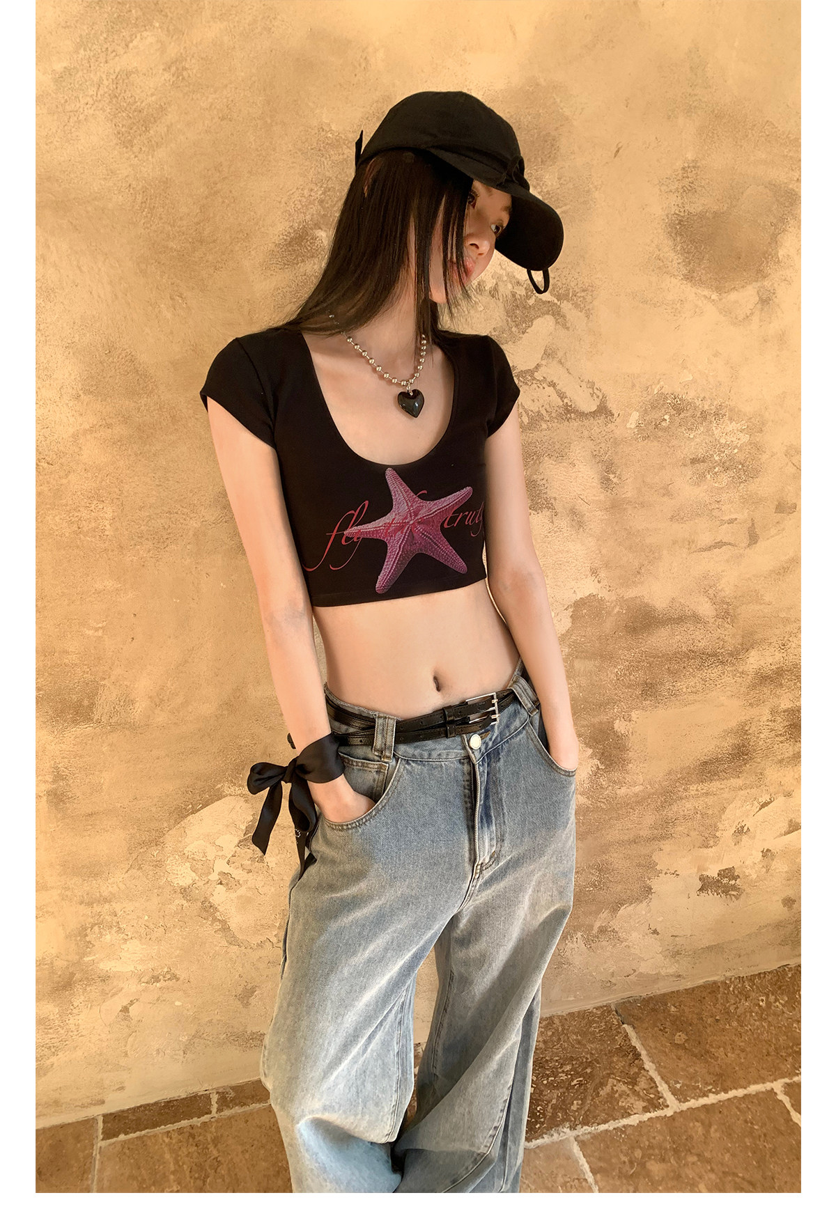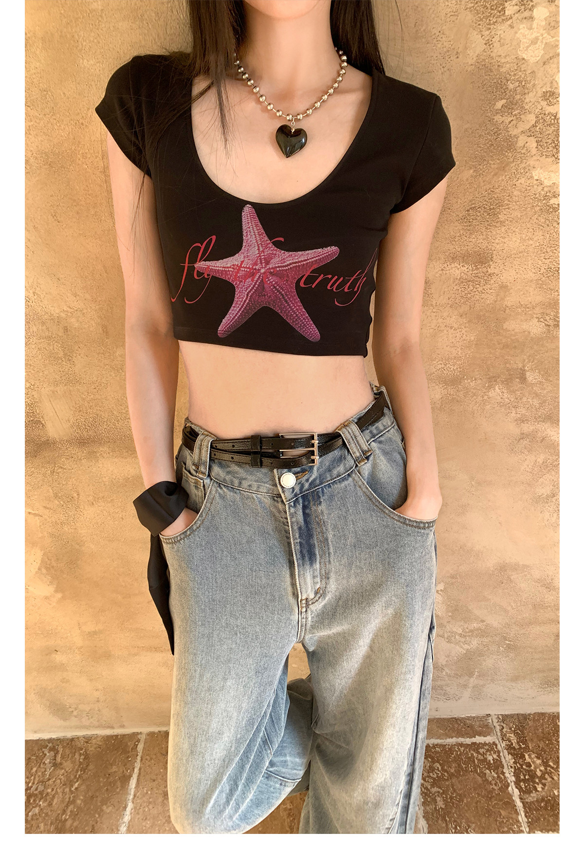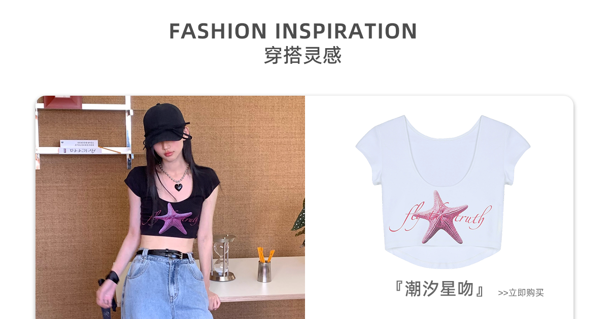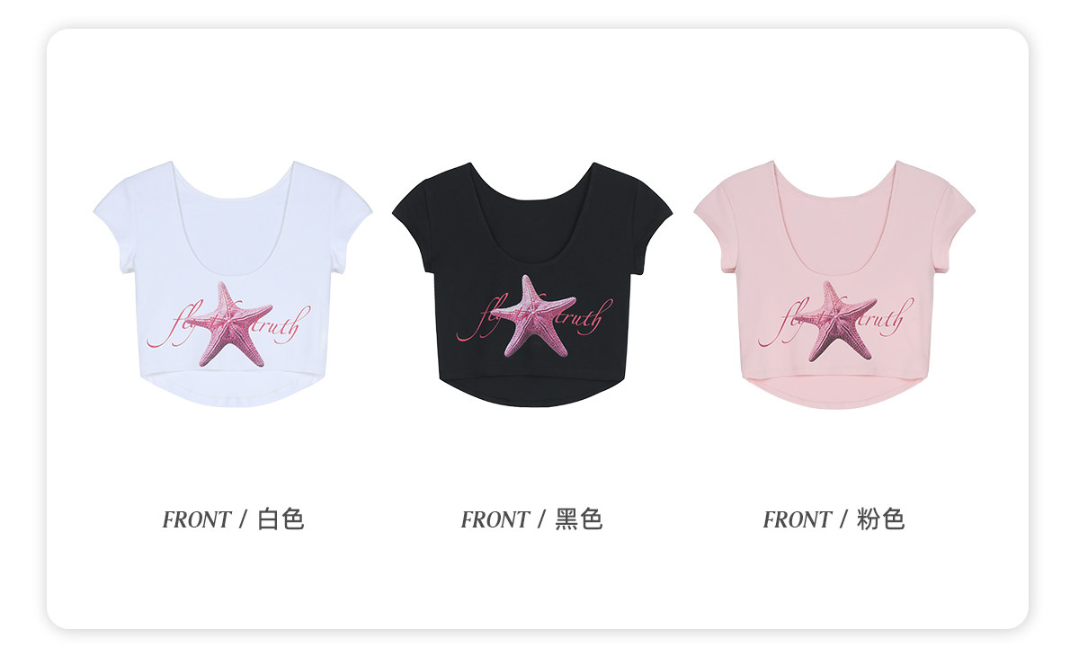 FTT FlyTheTruth『潮汐星吻』复古海星印花短袖T恤女夏修身短上衣
