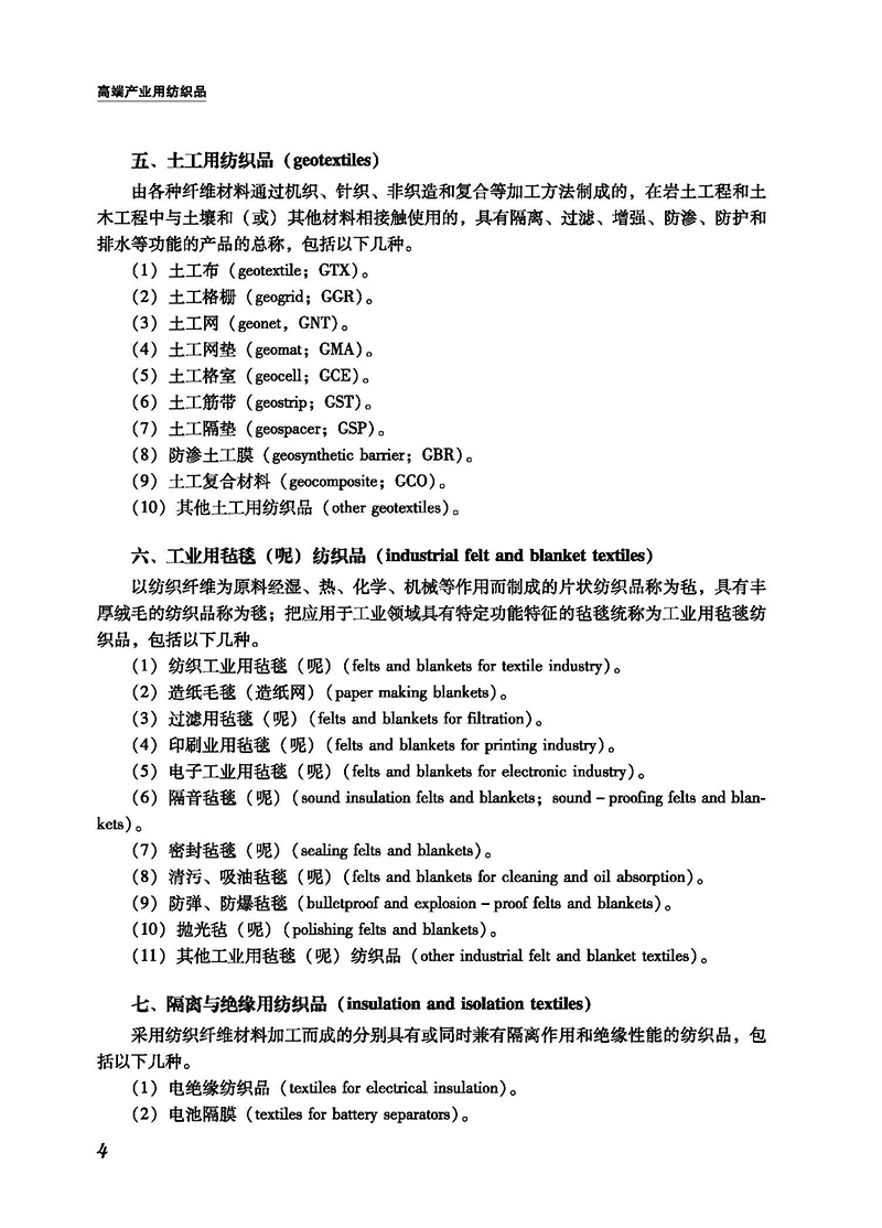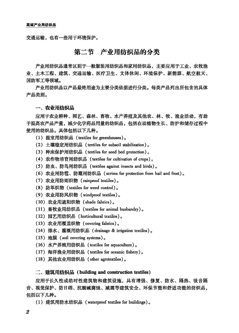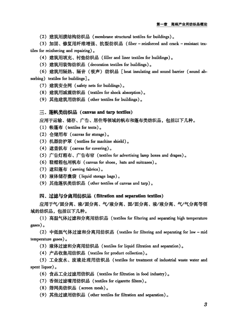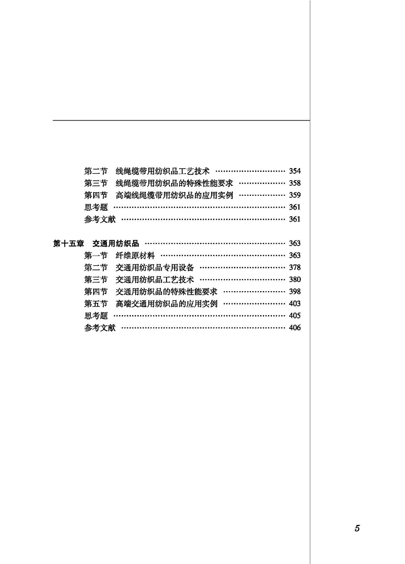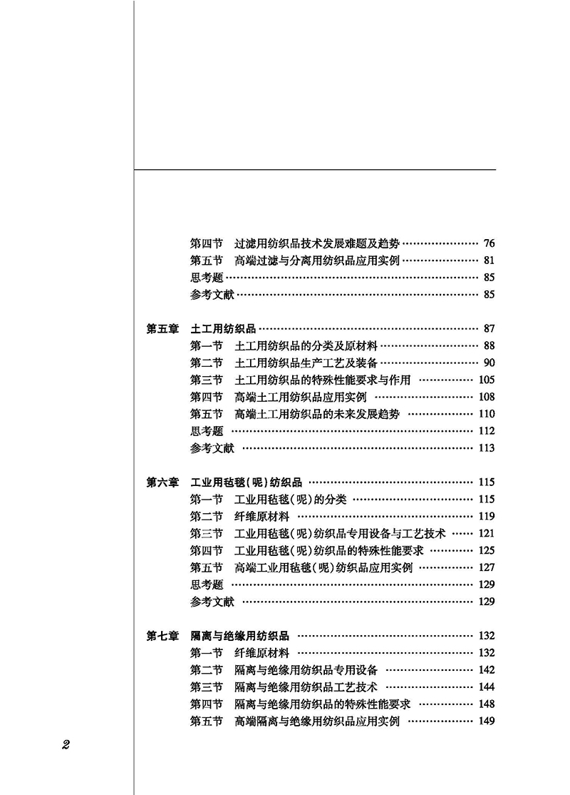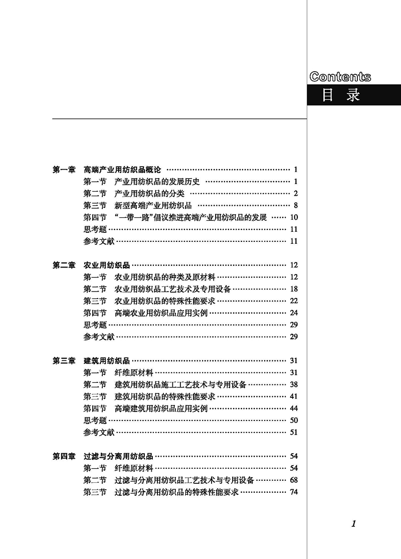 《高端产业用纺织品》是“十三五”普通高等教育部委级规划教材中的一种,更是纺织类高等院校工程专业学位研究生*部“高端产业用纺织品”教材,内容主要括:《产业用纺织品分类标准》中明确的16大类产业用纺织品理论知识、结构设计及前沿应用的系统介绍;特别是*终用途对各类产业用纺织品的特殊性能要求、各类产业用纺织品使用的纤维材料、专用设备及工艺技术、高端应用实例及发展趋势。体现了知识结构的多样性、系统性、整体性、科学性、严谨性、时代性,更彰显了产业用纺织品的材料、科学、技术、应用研究的*进展。