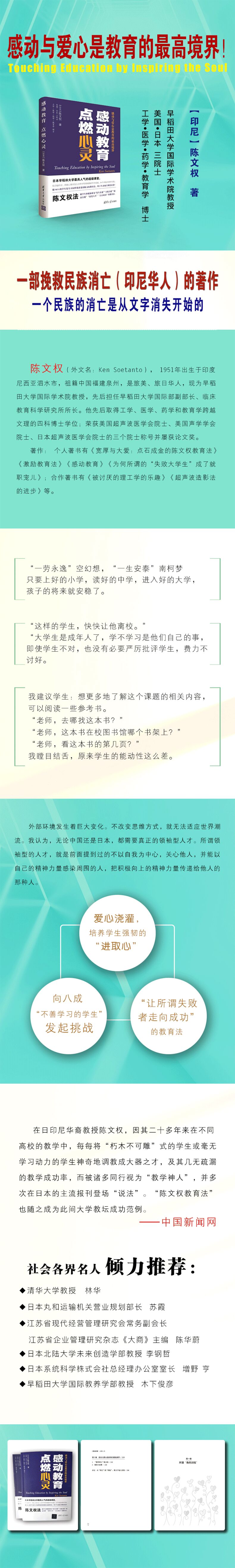 《感动教育 点燃心灵》不同于以往的“学习靠学生主动,老师只是引导”的教学观点,是基于作者30多年在美国、日本、欧州教学的经验和研究,提出了"教育″这两个字是包含着"教"与″育″合起来的是教书育人,“教师不仅仅教书而已,还需要育人“,”教育需要教师主动唤醒学生对学习的热爱”等观点,呼吁用爱来感动学生,让他们重新热爱学习,这也是教师的责任。全书分为两大部分:感动教育和教学反馈。