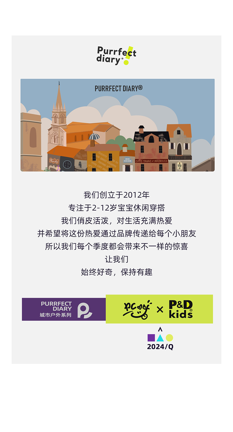 Purrfect-Diary专注于贴近自然随性的穿着概念,轻奢平价的童装文化传播,在产品设计上更加注重婴童穿着的舒适性、安全性、更出众的国际化品牌,将欧美的育婴文化在中国进行深入的传播与推广。