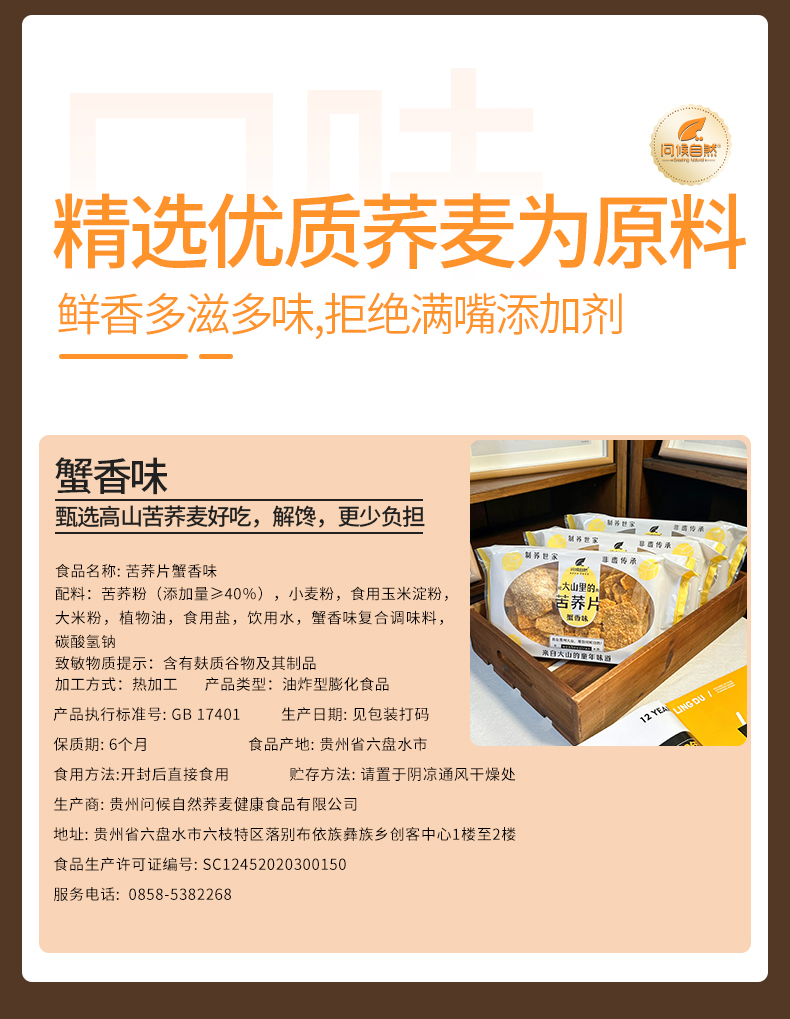 品名:苦荞片 发货地/产地:贵州/贵州保质期:6个月,建议收到后尽快食用。包装方式:盒装物流信息:四通一达或其它普通快递随机,不接受指定快递。不发货区域:港澳台及疫情管控区。 |