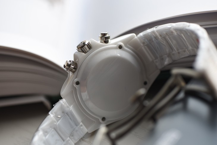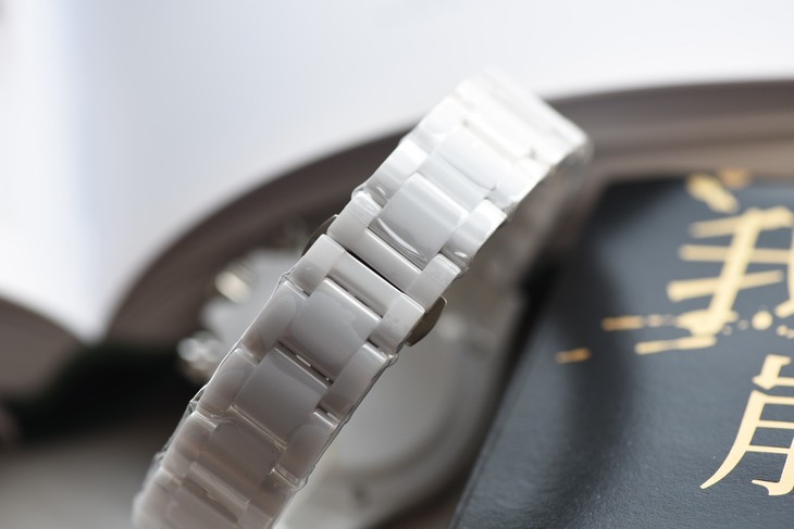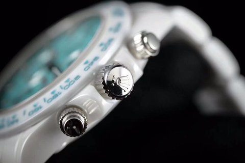 这款蓝白陶瓷壳套迪通拿,表壳和表带完全由白色陶瓷打造,是一种十分脆弱且在制造过程中容易开裂的材料,以前很少在腕表采用这种材质,大家比较熟知的还是香奈儿陶瓷J12系列,但这种材料的成品效果却是非常独特,不仅看起来简洁纯净,还拥有温润如玉的佩戴感,并且十分耐划。