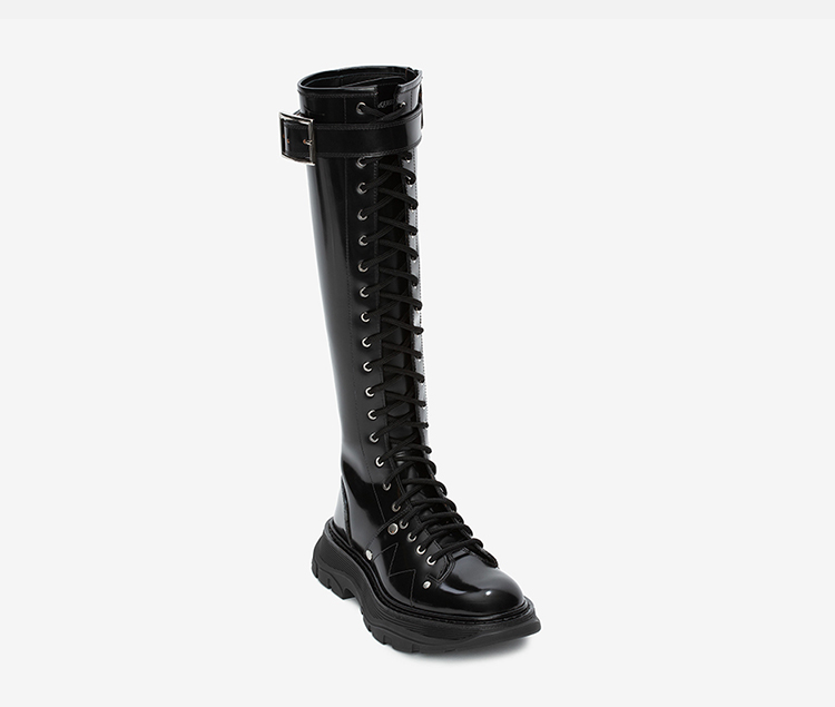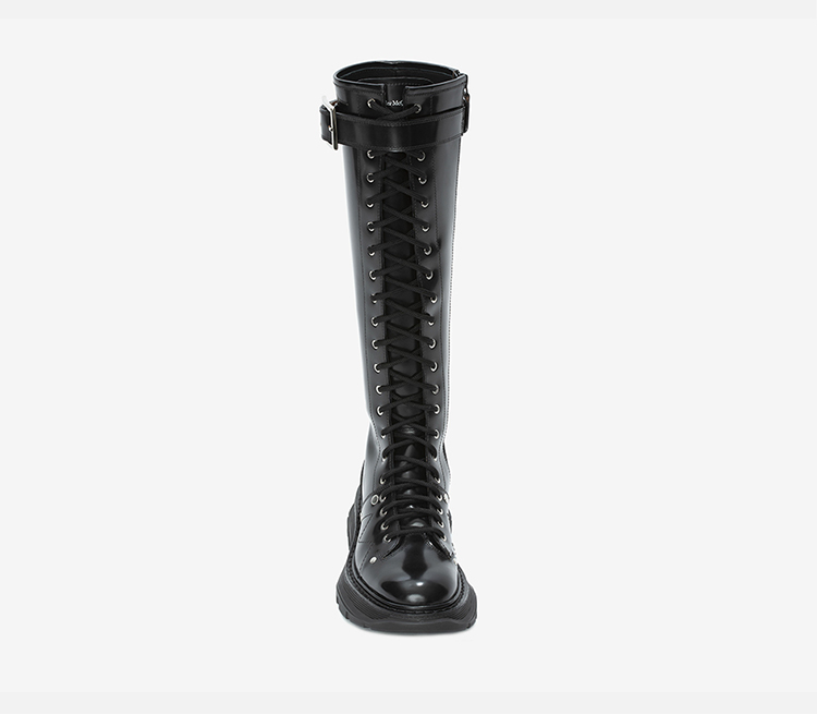 ALEXANDER MCQUEEN 亚历山大麦昆 女士皮革异形鞋底系带长靴高筒靴 黑色 595466 WHZ81 1081