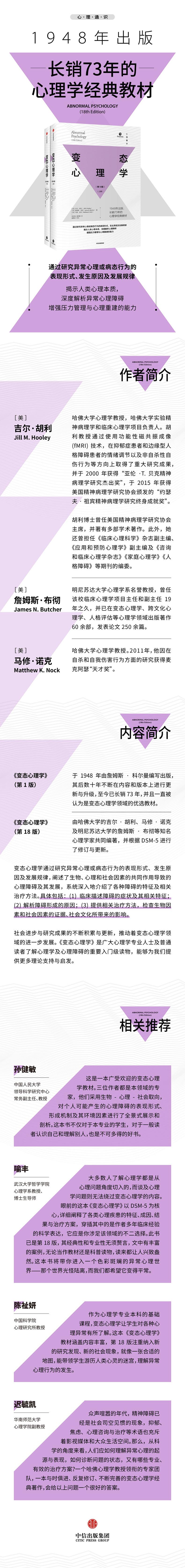《变态心理学》(第1版)于1948年由詹姆斯·科尔曼编写出版,其后数十年不断在内容和版本上进行更新与升级,至今已长销73年,并且一直被认为是变态心理学领域的优选教材。《变态心理学》(第18版)由哈佛大学的吉尔·胡利、马修·诺克及明尼苏达大学的詹姆斯·布彻等知名心理学家共同编著,并根据DSM-5进行了修订与更新。变态心理学通过研究异常心理或病态行为的表现形式、发生原因及发展规律,阐述了生物、心理和社会因素的共同作用导致的心理障碍及其发展,系统深入地介绍了各种障碍的特征及相关治疗方法。具体包括:(1)临床描述障碍的症状及其相关特征;(2)解析障碍形成的原因;(3)提供相关治疗方法,检查生物因素和社会因素的证据、社会文化所带来的影响。社会进步与研究成果的不断积累与更新,推动着变态心理学领域的进一步发展。《变态心理学》是广大心理学专业人士及普通读者了解心理学及心理障碍的重要入门级读物,能够为我们提......