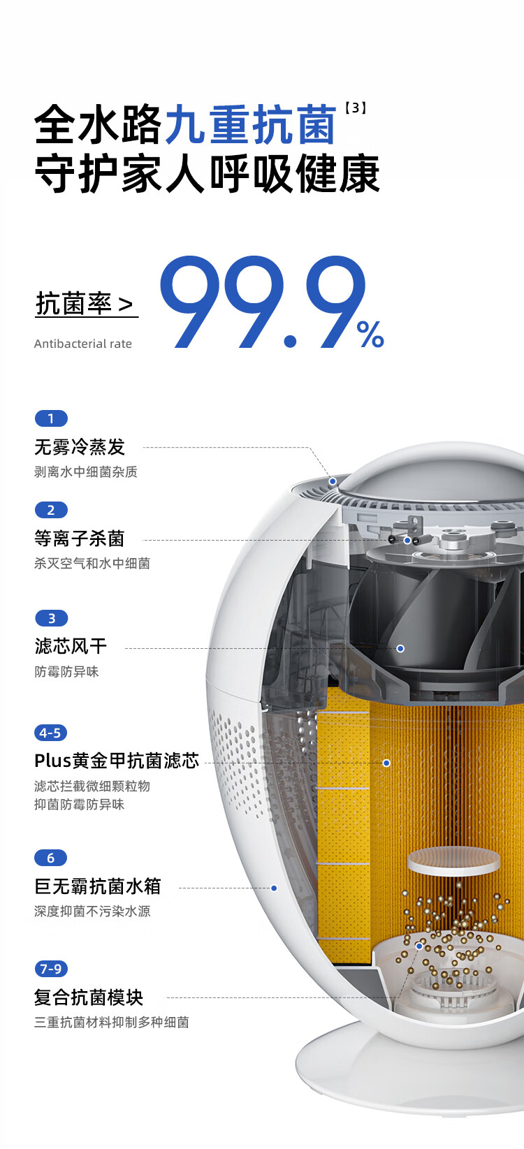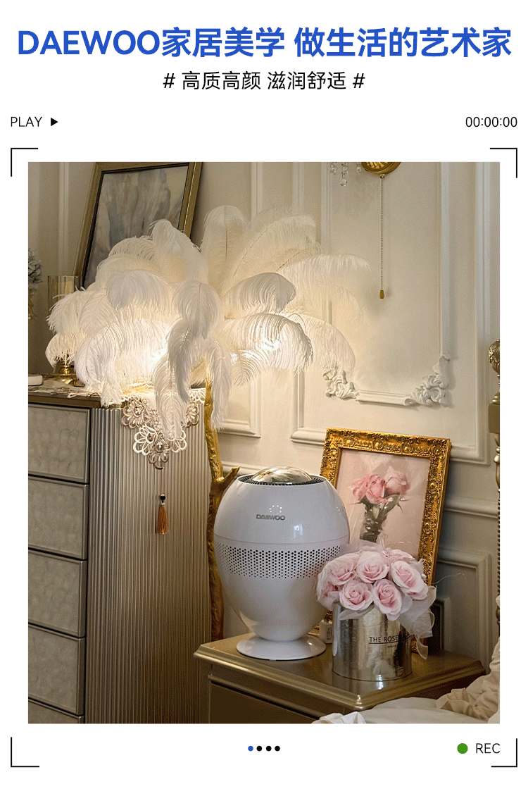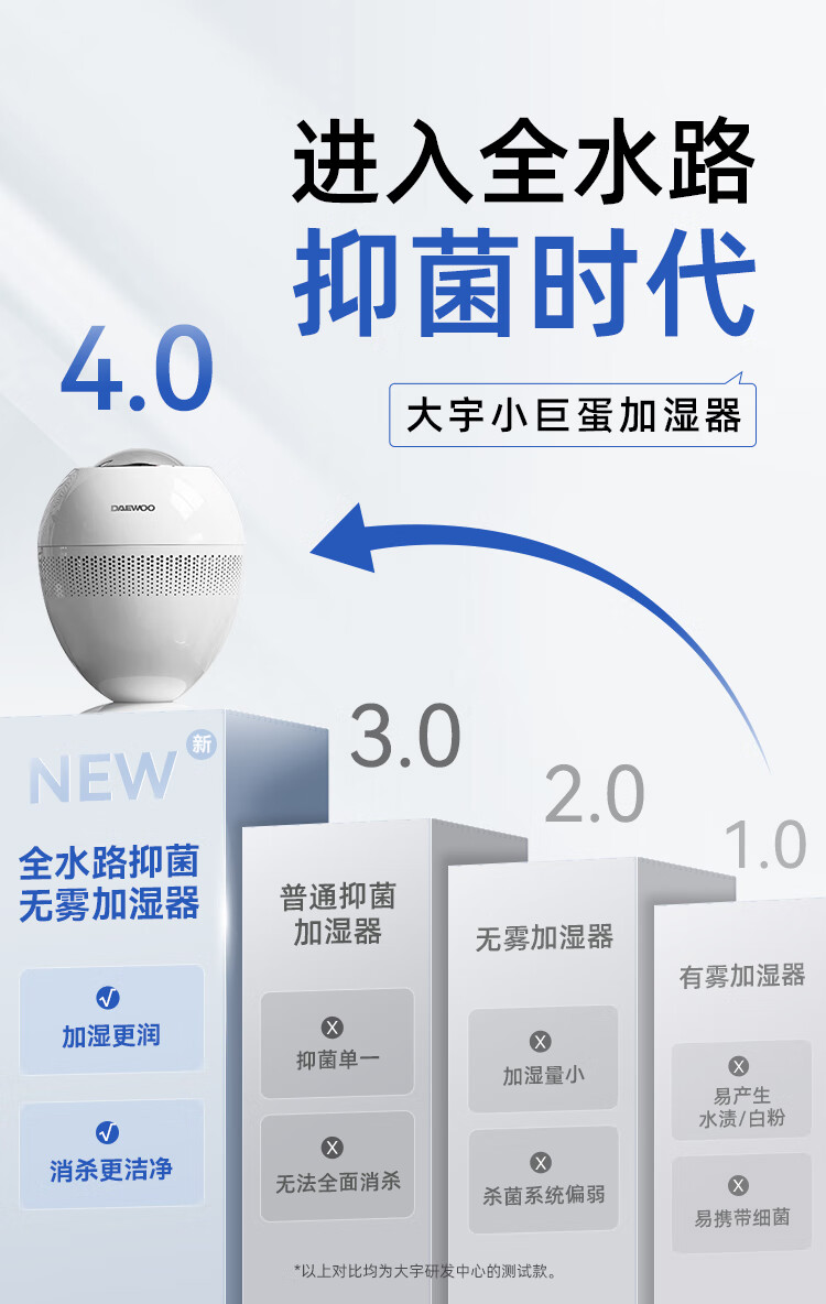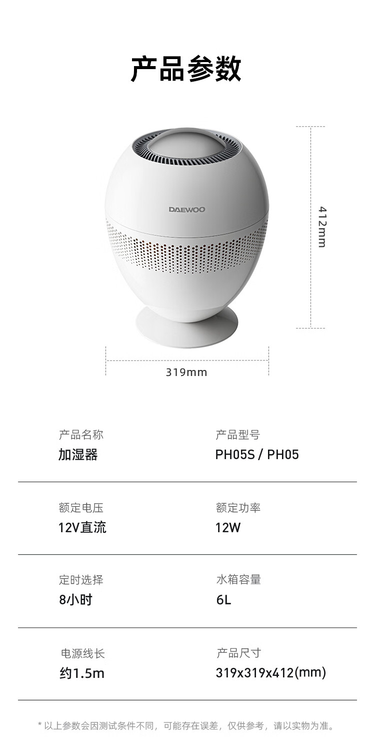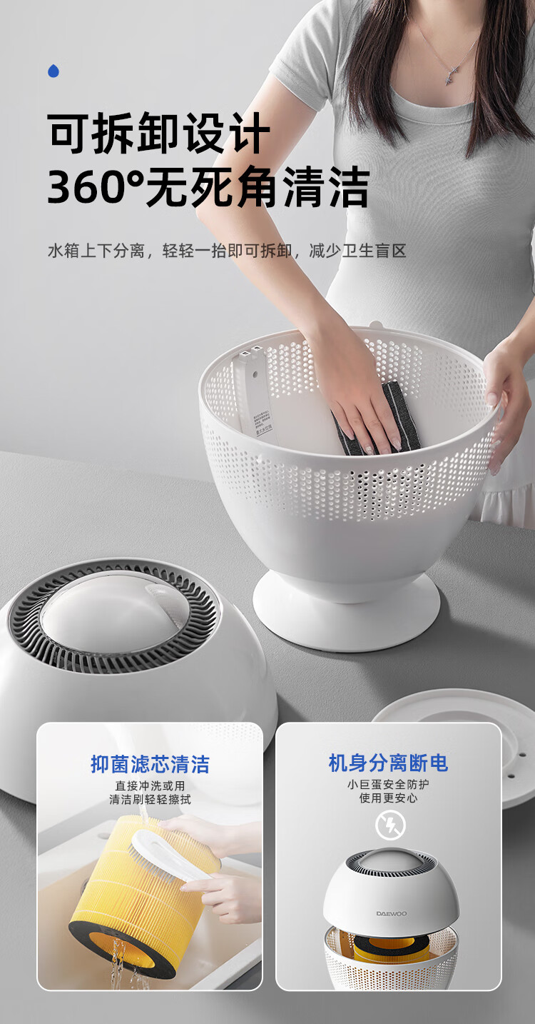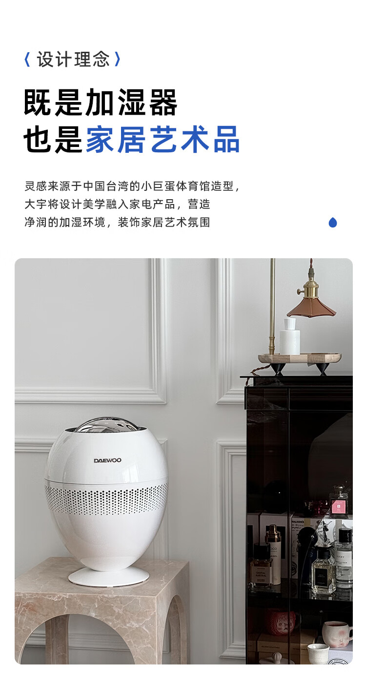 大宇(DAEWOO)加湿器小巨蛋全水路抑菌无雾加湿器卧室婴儿高端智能AI恒湿566ml/h等离子净化除菌 PH05S/PH05