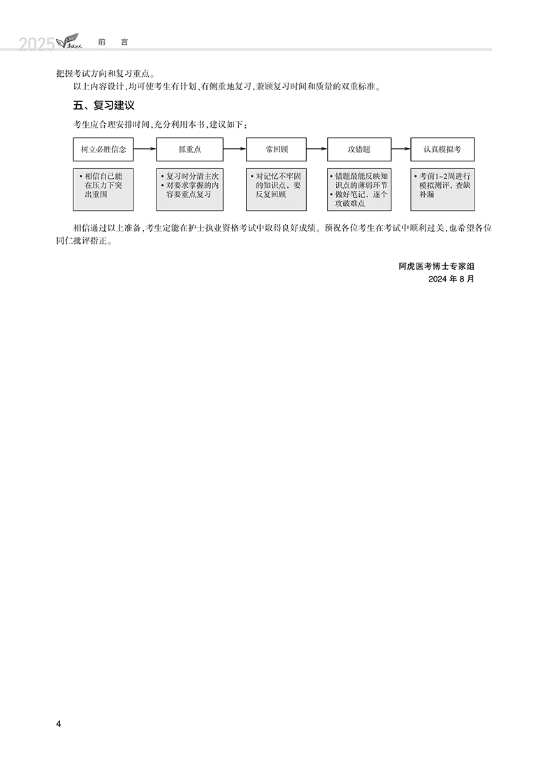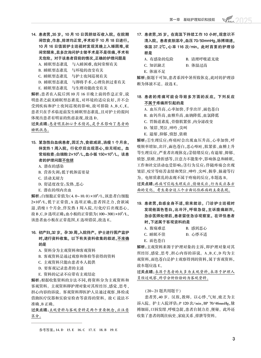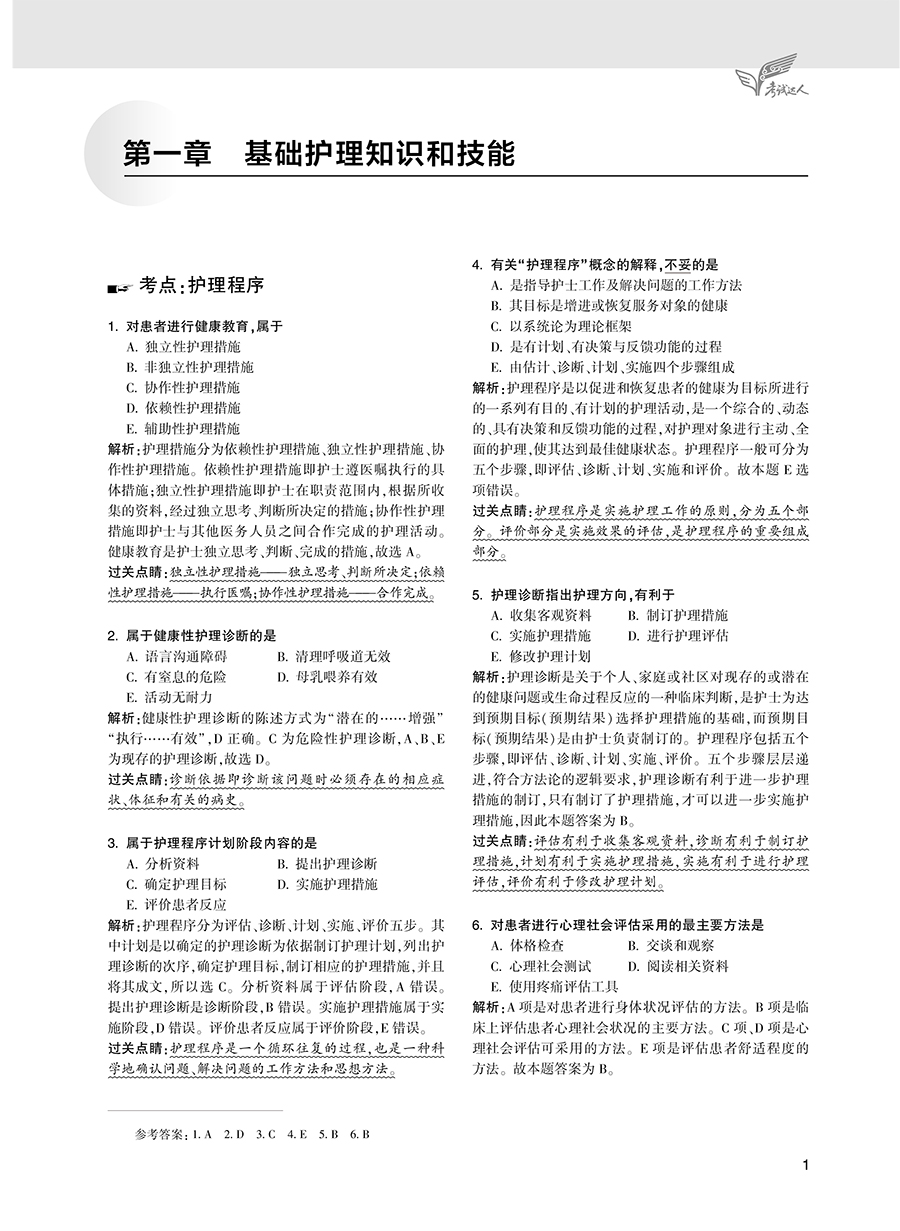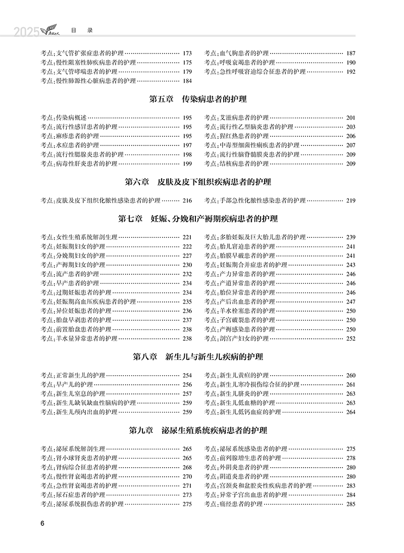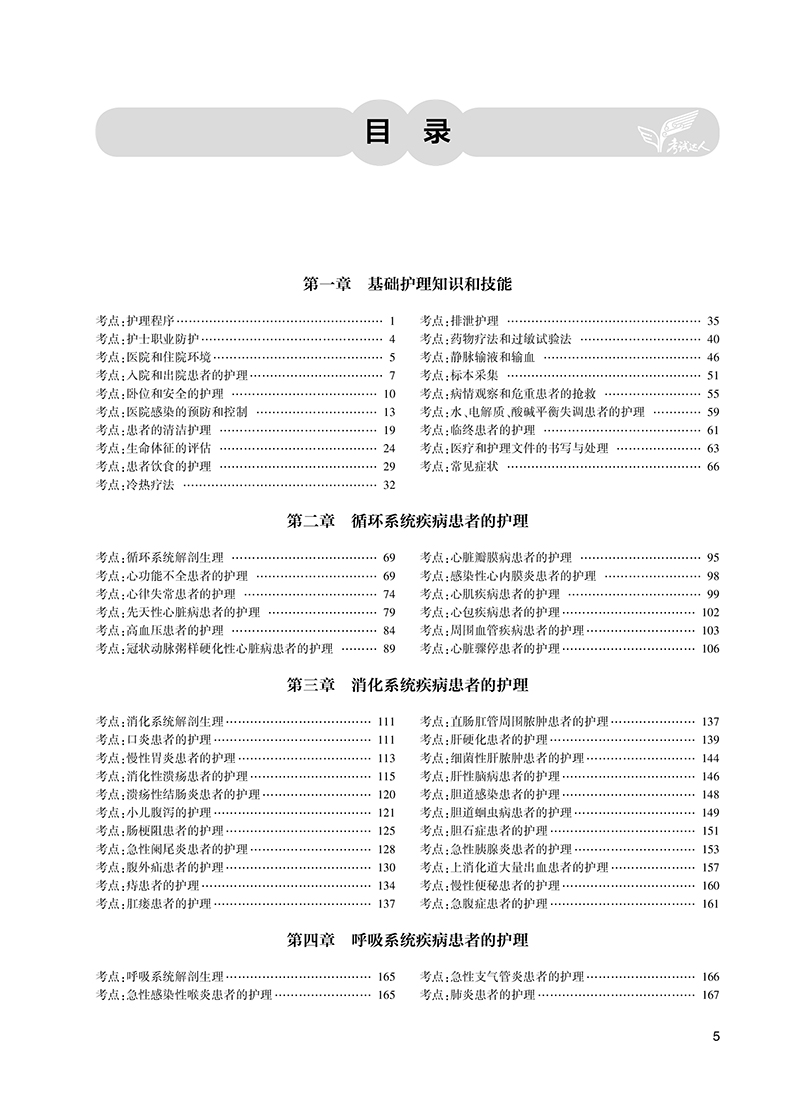 第一章 基础护理知识和技能 考点:护理程序/ 1 考点:护士职业防护/ 4 考点:医院和住院环境/ 5 考点:入院和出院患者的护理/ 7 考点:卧位和安全的护理 / 10 考点:医院感染的预防和控制 / 13 考点:患者的清洁护理 / 19 考点:生命体征的评估 / 24 考点:患者饮食的护理 / 29 考点:冷热疗法 / 32 考点:排泄护理 / 35 考点:药物疗法和过敏试验法 / 40 考点:静脉输液和输血 / 46 考点:标本采集 / 51 考点:病情观察和危重患者的抢救 / 55 考点:水、电解质、酸碱平衡失调患者的护理 / 59 考点:临终患者的护理 / 61 考点:医疗和护理文件的书写与处理 / 63 考点:常见症状 / 66 第二章 循环系统疾病患者的护理 考点:循环系统解剖生理 / 69 考点:心功能不全患者的护理 / 69 考点:心律失常患者的护理 / 74 考点:先天性心脏病患者的护理 / 79 考点:高血压患者的护理 / 84 考点:冠状动脉粥样硬化性心脏病患者的护理 / 89 考点:心脏瓣膜病患者的护理 / 95 考点:感染性心内膜炎患者的护理 / 98 考点:心肌疾病患者的护理 / 99 考点:心包疾病患者的护理/ 102 考点:周围血管疾病患者的护理/ 103 考点:心脏骤停患者的护理/ 106 第三章 消化系统疾病患者的护理 考点:消化系统解剖生理/ 111 考点:口炎患者的护理/ 111 考点:慢性胃炎患者的护理/ 113 考点:消化性溃疡患者的护理/ 115 考点:溃疡性结肠炎患者的护理/ 120 考点:小儿腹泻的护理/ 121 考点:肠梗阻患者的护理/ 125 考点:急性阑尾炎患者的护理/ 128 考点:腹外疝患者的护理/ 130 考点:痔患者的护理/ 134 考点:肛瘘患者的护理/ 137 考点:直肠肛管周围脓肿患者的护理/ 137 考点:肝硬化患者的护理/ 139 考点:细菌性肝脓肿患者的护理/ 144 考点:肝性脑病患者的护理/ 146 考点:胆道感染患者的护理/ 148 考点:胆道蛔虫病患者的护理/ 149 考点:胆石症患者的护理/ 151 考点:急性胰腺炎患者的护理/ 153 考点:上消化道大量出血患者的护理/ 157 考点:慢性便秘患者的护理/ 160 考点:急腹症患者的护理/ 161 第四章 呼吸系统疾病患者的护理 考点:呼吸系统解剖生理/ 165 考点:急性感染性喉炎患者的护理/ 165 考点:急性支气管炎患者的护理/ 166 考点:肺炎患者的护理/ 167 考点:支气管扩张症患者的护理/ 173 考点:慢性阻塞性肺疾病患者的护理/ 175 考点:支气管哮喘患者的护理/ 179 考点:慢性肺源性心脏病患者的护理/ 184 考点:血气胸患者的护理/ 187 考点:呼吸衰竭患者的护理/ 190 考点:急性呼吸窘迫综合征患者的护理/ 192 第五章 传染病患者的护理 考点:传染病概述/ 195 考点:流行性感冒患者的护理/ 195 考点:麻疹患者的护理/ 195 考点:水痘患者的护理/ 197 考点:流行性腮腺炎患者的护理/ 198 考点:病毒性肝炎患者的护理/ 199 考点:艾滋病患者的护理/ 201 考点:流行性乙型脑炎患者的护理/ 203 考点:猩红热患者的护理/ 206 考点:中毒型细菌性痢疾患者的护理/ 207 考点:流行性脑脊髓膜炎患者的护理/ 209 考点:结核病患者的护理/ 209 第六章 皮肤及皮下组织疾病患者的护理 考点:皮肤及皮下组织化脓性感染患者的护理/ 216 考点:手部急性化脓性感染患者的护理/ 219 第七章 妊娠、分娩和产褥期疾病患者的护理 考点:女性生殖系统解剖生理/ 221 考点:妊娠期妇女的护理/ 222 考点:分娩期妇女的护理/ 227 考点:产褥期妇女的护理/ 230 考点:流产患者的护理/ 232 考点:早产患者的护理/ 234 考点:过期妊娠患者的护理/ 234 考点:妊娠期高血压疾病患者的护理/ 235 考点:异位妊娠患者的护理/ 236 考点:胎盘早剥患者的护理/ 237 考点:前置胎盘患者的护理/ 238 考点:羊水量异常患者的护理/ 238 考点:多胎妊娠及巨大胎儿患者的护理/ 239 考点:胎儿窘迫患者的护理/ 241 考点:胎膜早破患者的护理/ 241 考点:妊娠期合并症患者的护理/ 243 考点:产力异常患者的护理/ 246 考点:产道异常患者的护理/ 246 考点:胎位异常患者的护理/ 246 考点:产后出血患者的护理/ 247 考点:羊水栓塞患者的护理/ 250 考点:子宫破裂患者的护理/ 250 考点:产褥感染患者的护理/ 250 考点:剖宫产妇女的护理/ 252 第八章 新生儿与新生儿疾病的护理 考点:正常新生儿的护理/ 254 考点:早产儿的护理/ 256 考点:新生儿窒息的护理/ 257 考点:新生儿缺氧缺血性脑病的护理/ 259 考点:新生儿颅内出血的护理/ 259 考点:新生儿黄疸的护理/ 260 考点:新生儿寒冷损伤综合征的护理/ 261 考点:新生儿脐炎的护理/ 263 考点:新生儿低血糖的护理/ 263 考点:新生儿低钙血症的护理/ 264 第九章 泌尿生殖系统疾病患者的护理 考点:泌尿系统解剖生理/ 265 考点:肾小球肾炎患者的护理/ 265 考点:肾病综合征患者的护理/ 268 考点:慢性肾衰竭患者的护理/ 270 考点:急性肾衰竭患者的护理/ 271 考点:尿石症患者的护理/ 273 考点:泌尿系统损伤患者的护理/ 275 考点:泌尿系统感染患者的护理/ 275 考点:前列腺增生患者的护理/ 278 考点:外阴炎患者的护理/ 280 考点:阴道炎患者的护理/ 280 考点:宫颈炎和盆腔炎性疾病患者的护理/ 283 考点:异常子宫出血患者的护理/ 284 考点:痛经患者的护理/ 285 考点:围绝经期综合征患者的护理/ 285 考点:子宫内膜异位症患者的护理/ 286 考点:子宫脱垂患者的护理/ 287 考点:急性乳腺炎患者的护理/ 288 第十章 精神障碍患者的护理 考点:精神障碍症状学/ 290 考点:精神分裂症患者的护理/ 292 考点:抑郁症患者的护理/ 294 考点:焦虑症患者的护理/ 297 考点:强迫症患者的护理/ 299 考点: