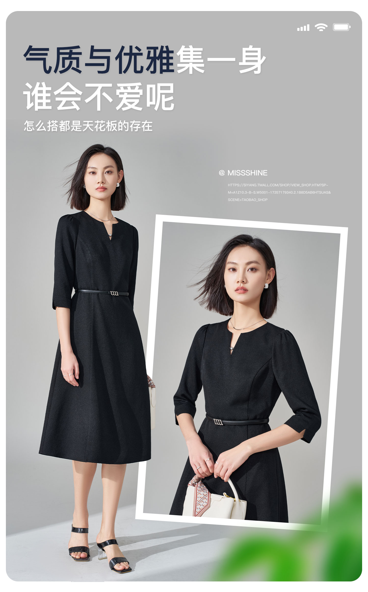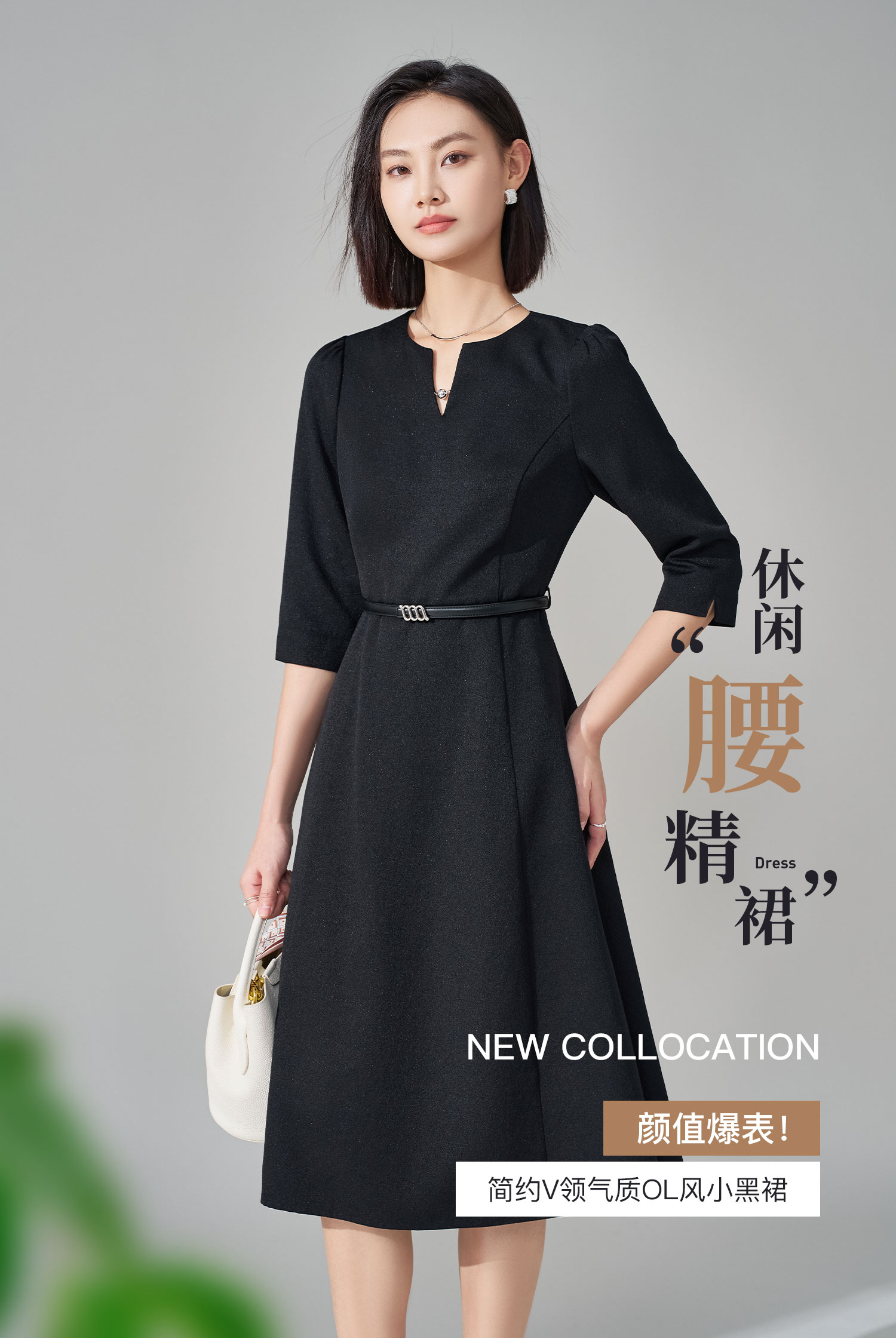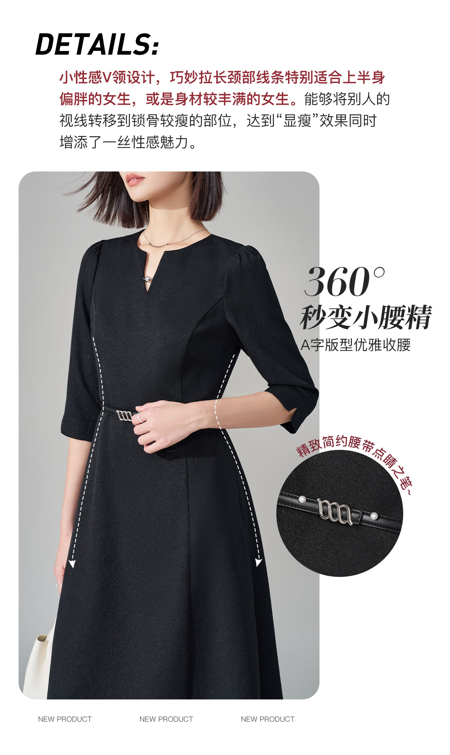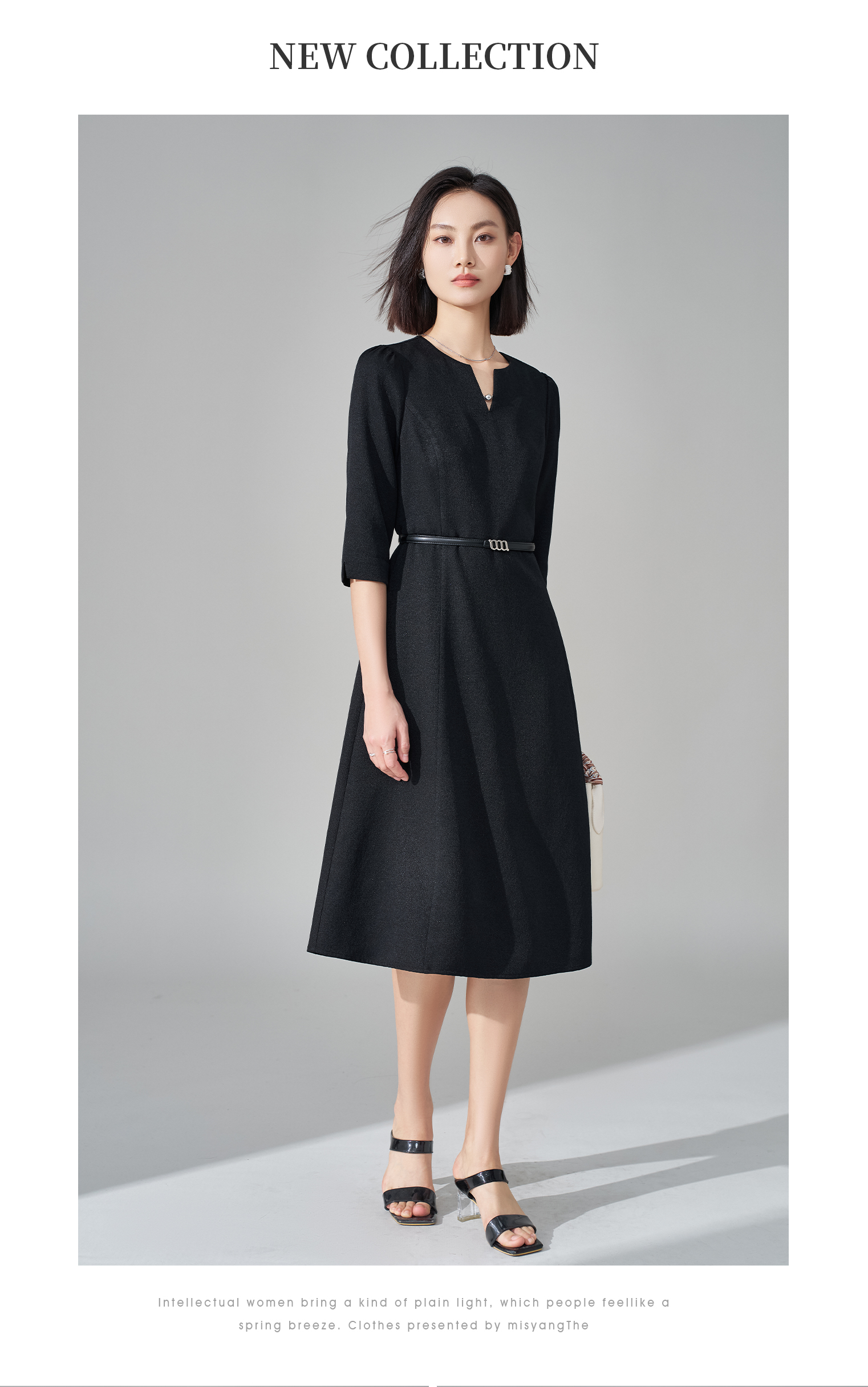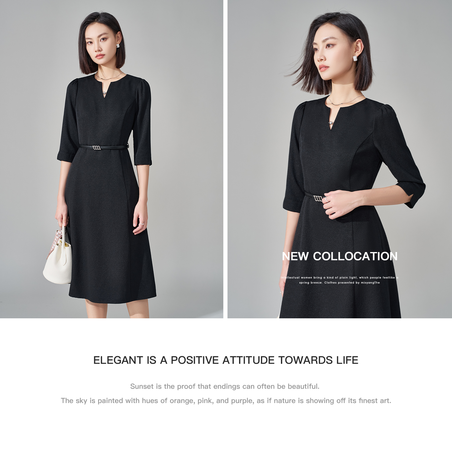 剩S/M/L/XL 米思阳2026春季气质V领七分袖小黑裙收腰显瘦A字连衣裙5058
