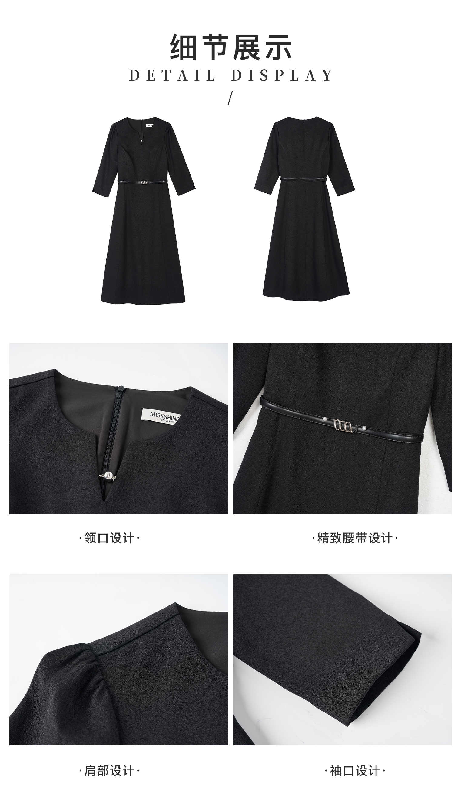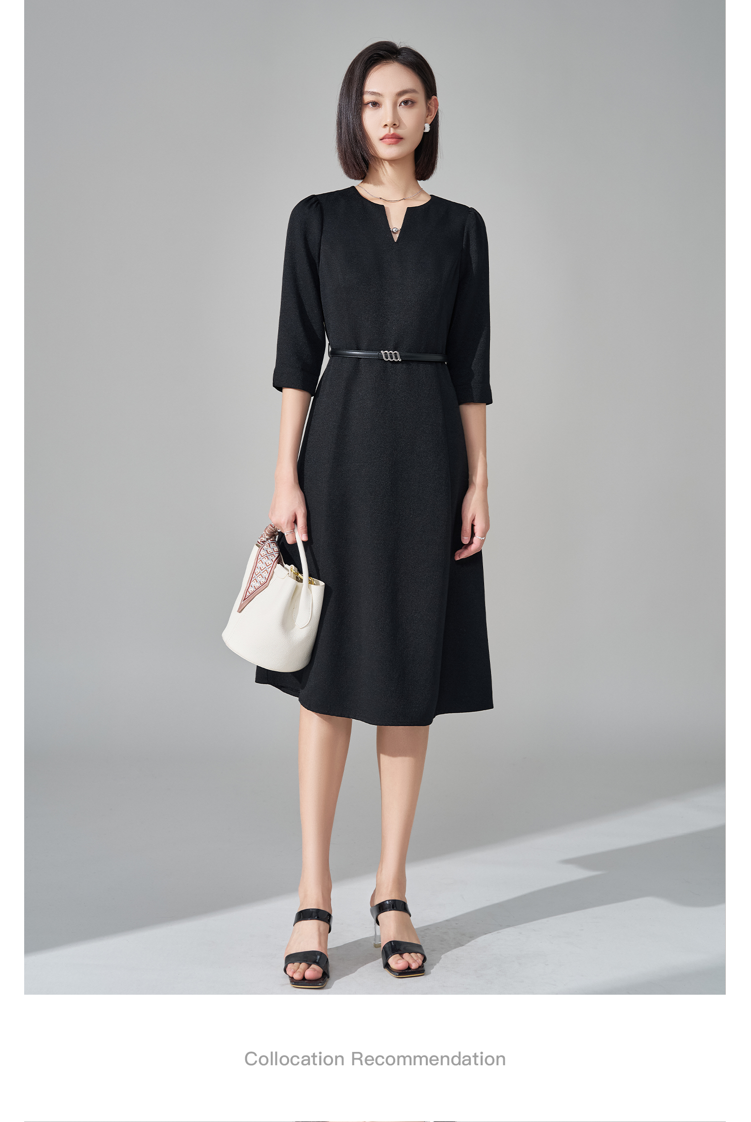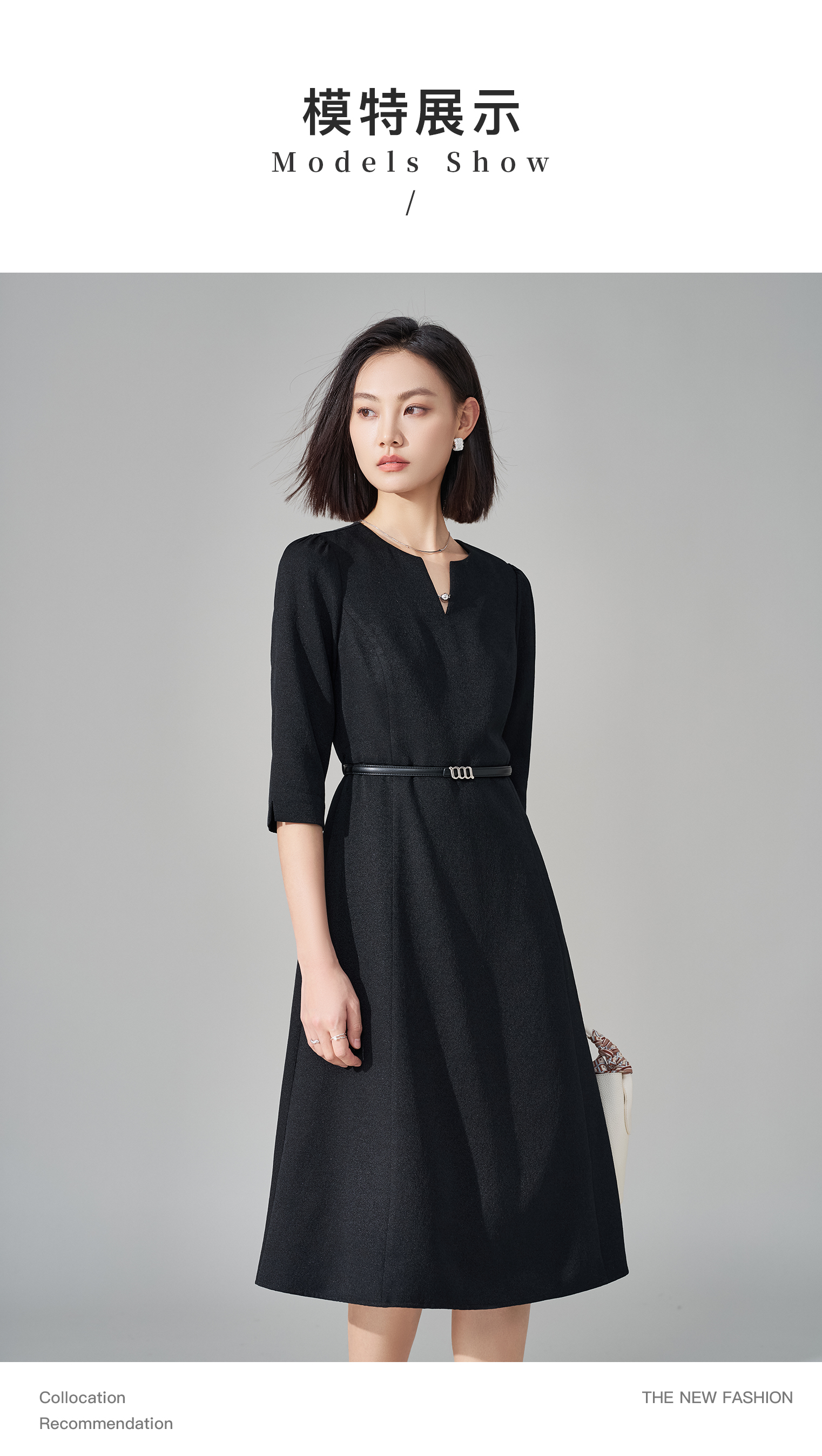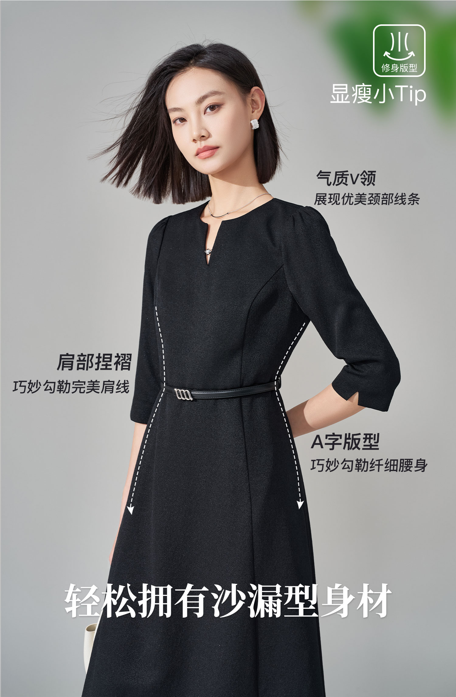 剩S/M/L/XL 米思阳2026春季气质V领七分袖小黑裙收腰显瘦A字连衣裙5058
