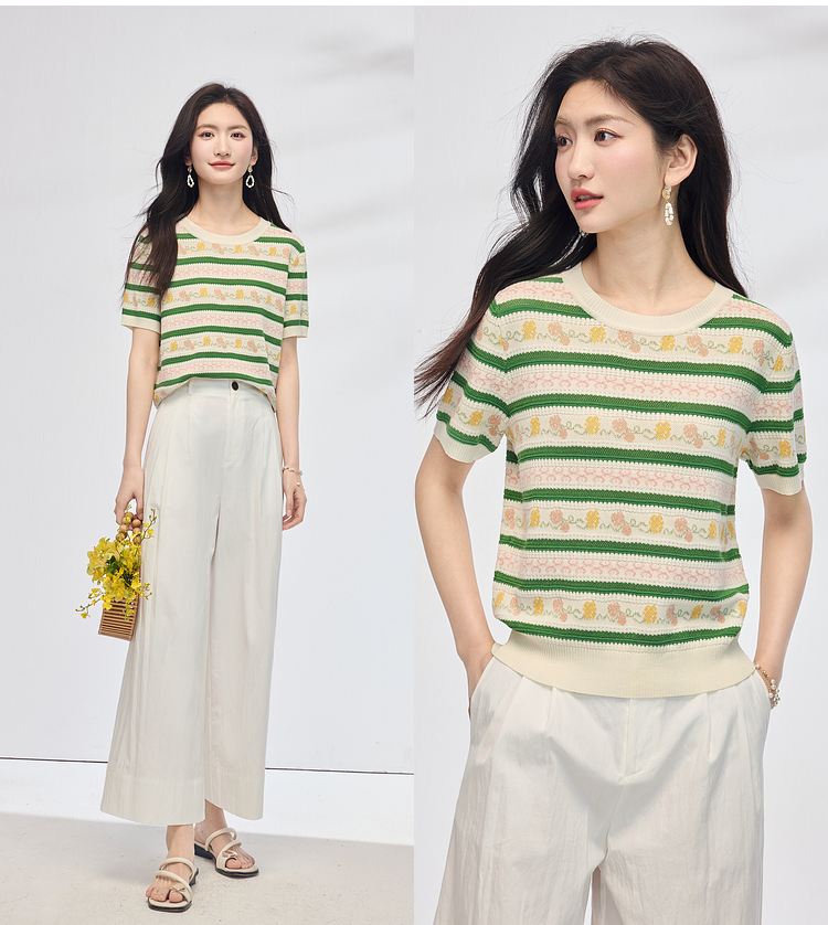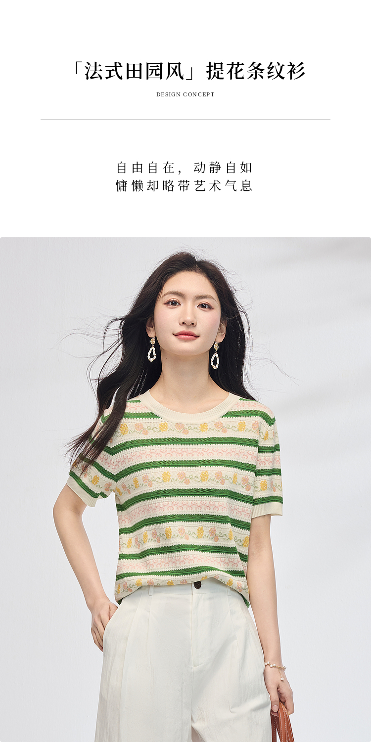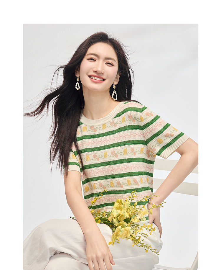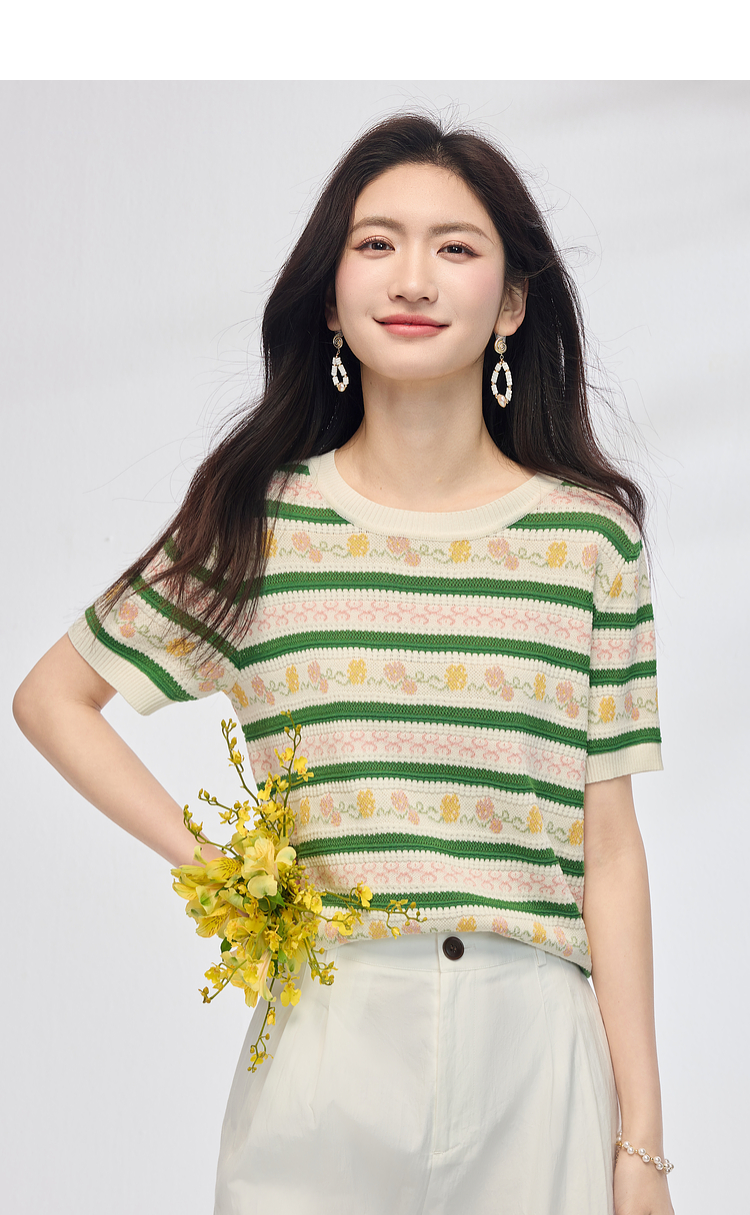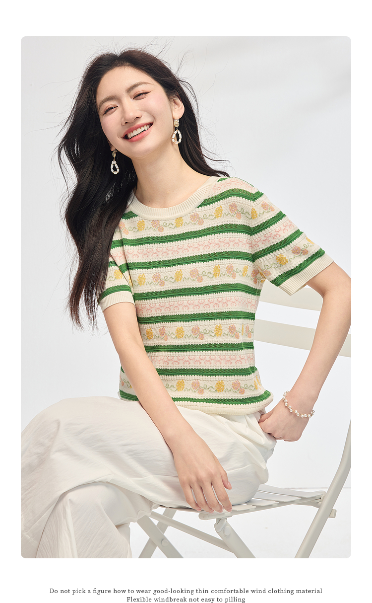 熙世界甜美风提花条纹针织衫女夏季薄款短袖亚麻冰丝上衣夏日穿搭