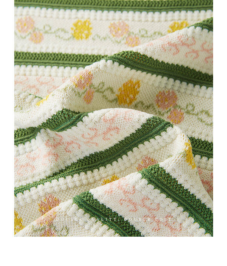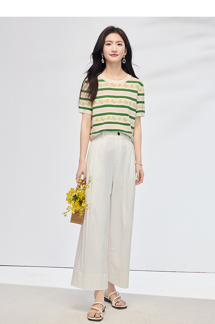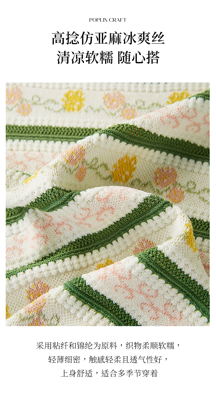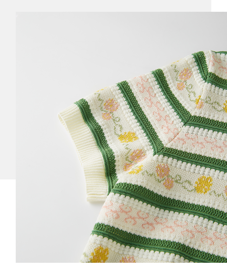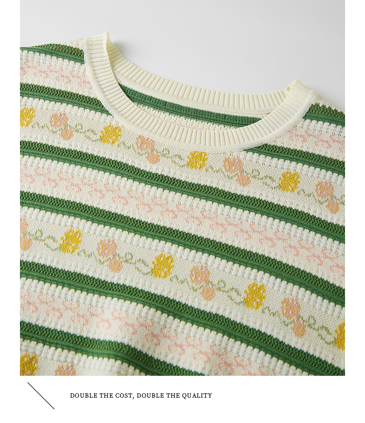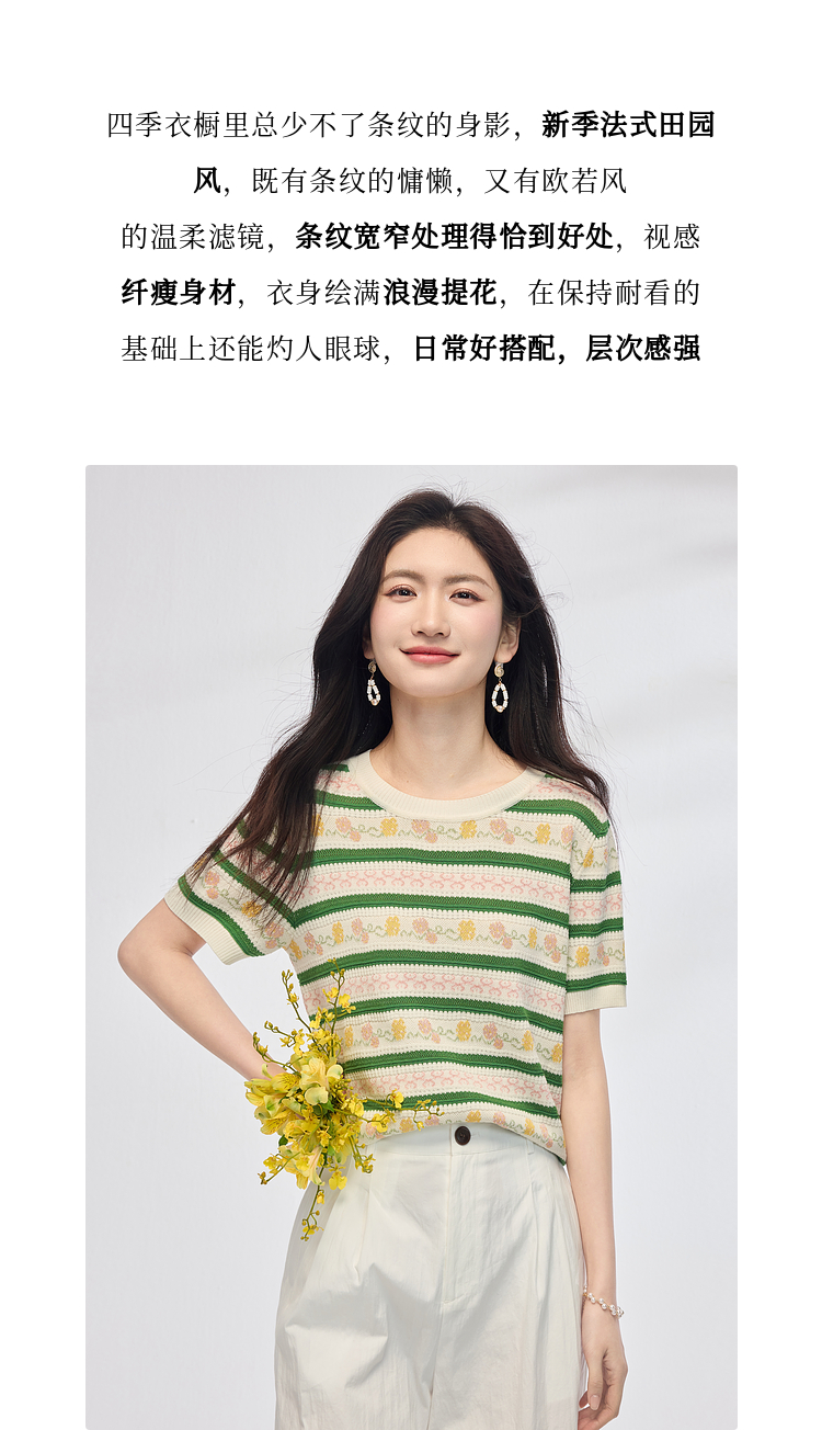 熙世界甜美风提花条纹针织衫女夏季薄款短袖亚麻冰丝上衣夏日穿搭
