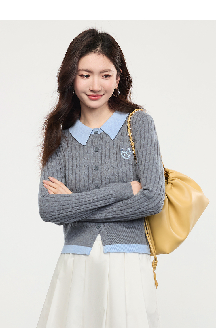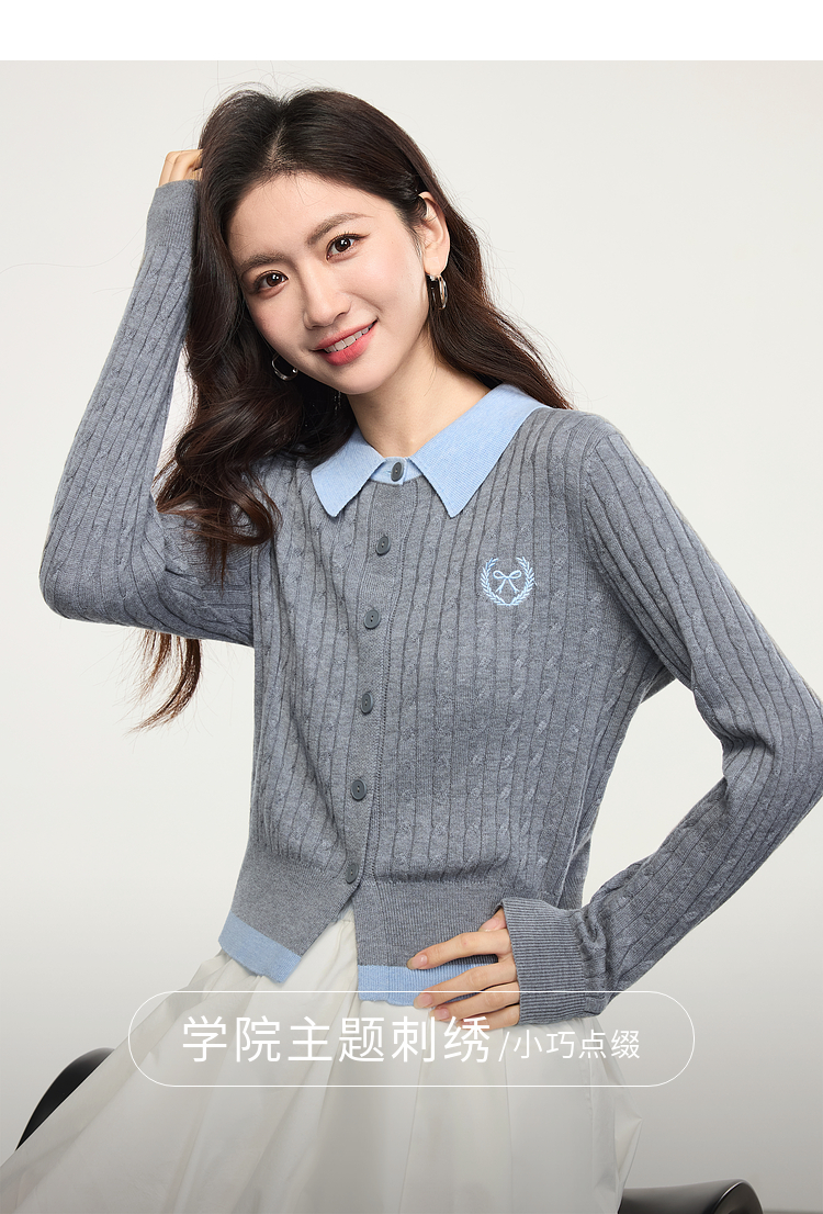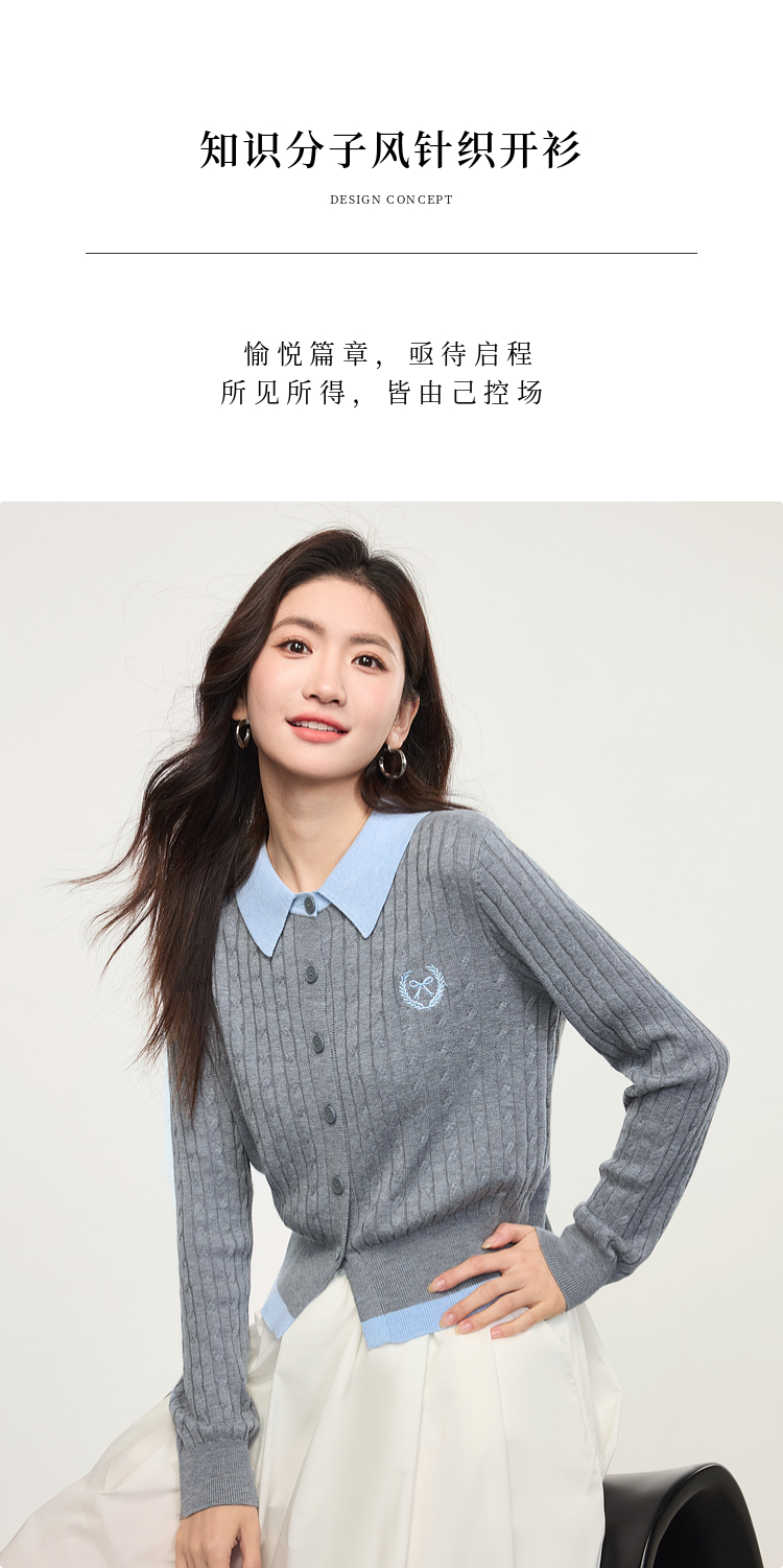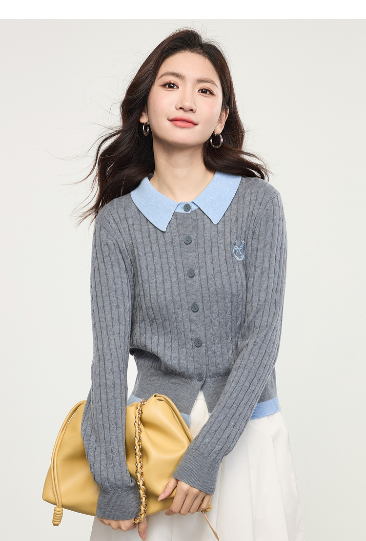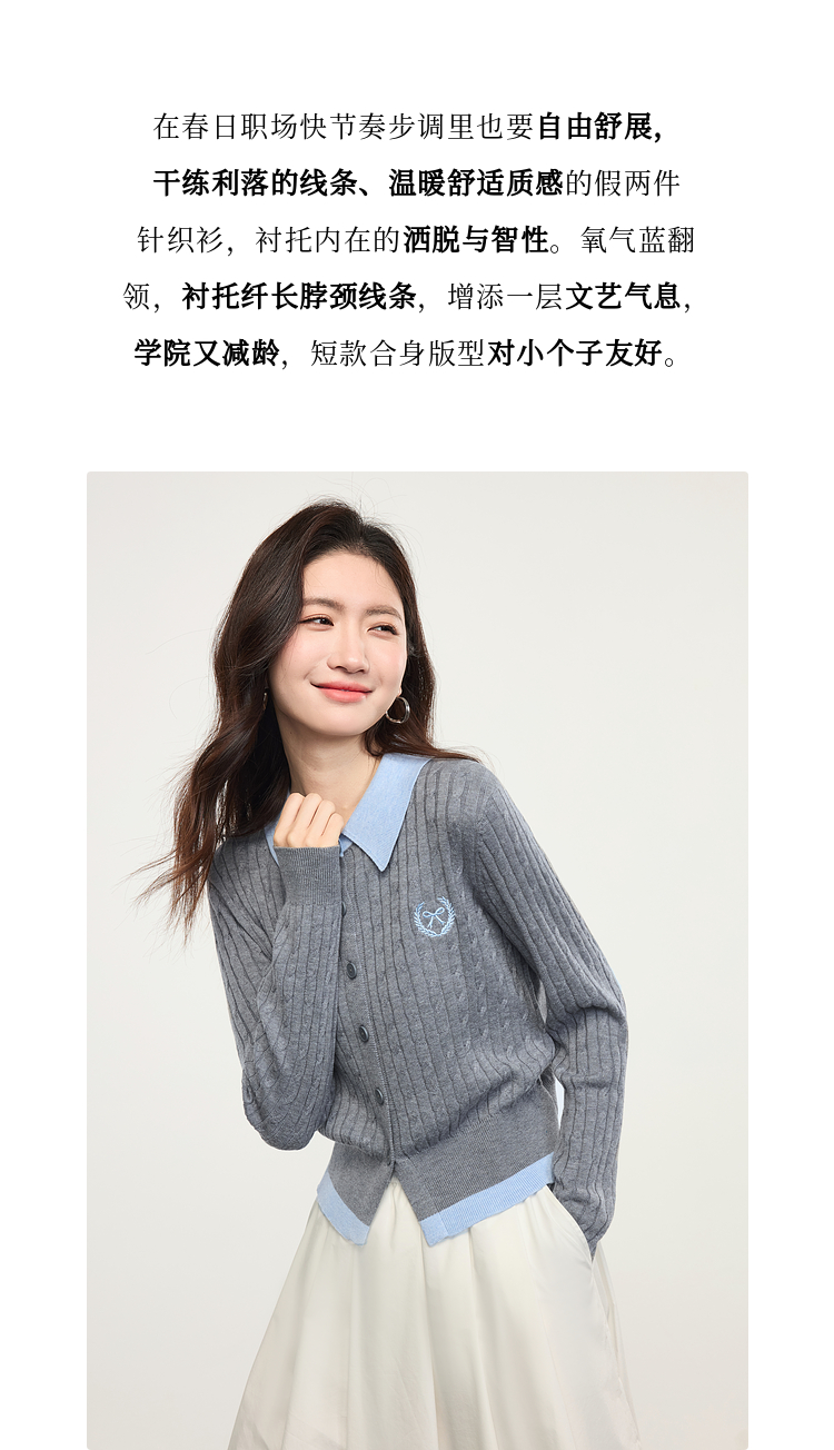 【专属特价】熙世界假两件灰色绞花针织开衫女2025早春新款学院风polo翻领上衣