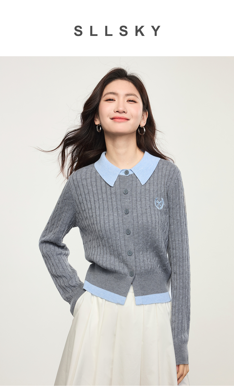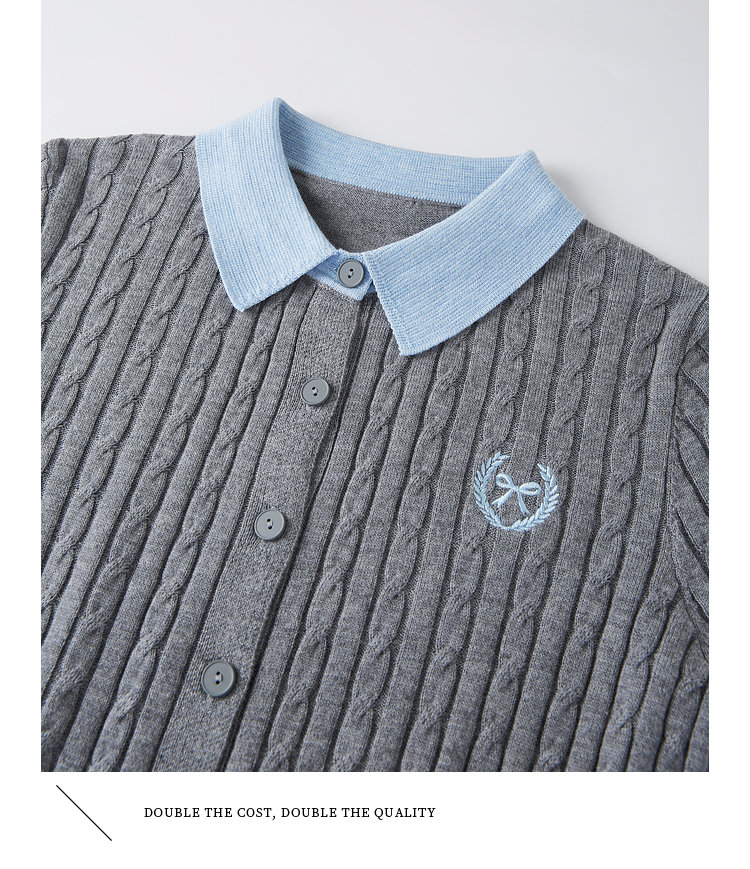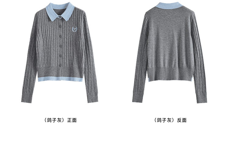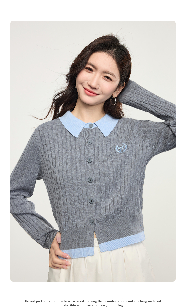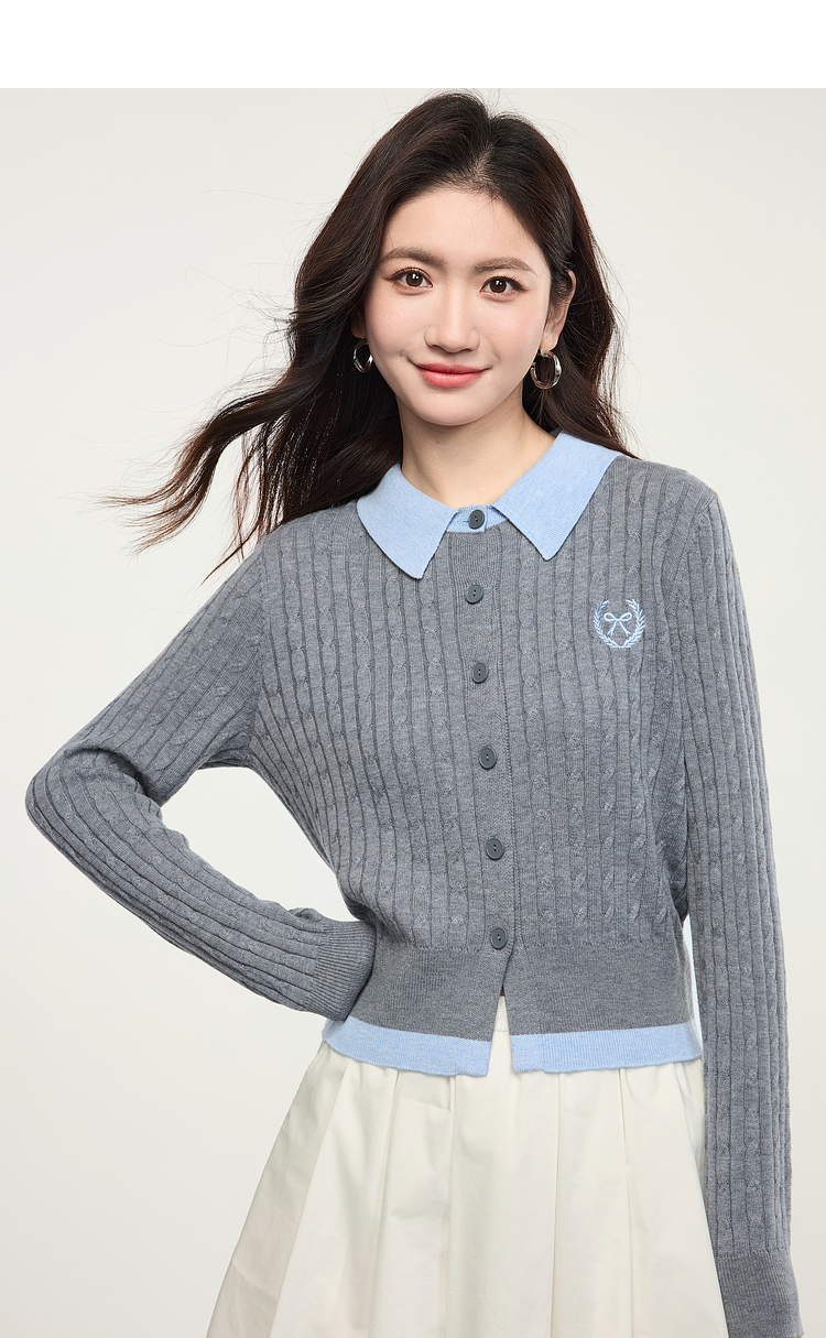 【专属特价】熙世界假两件灰色绞花针织开衫女2025早春新款学院风polo翻领上衣