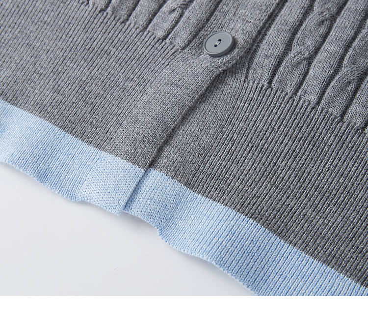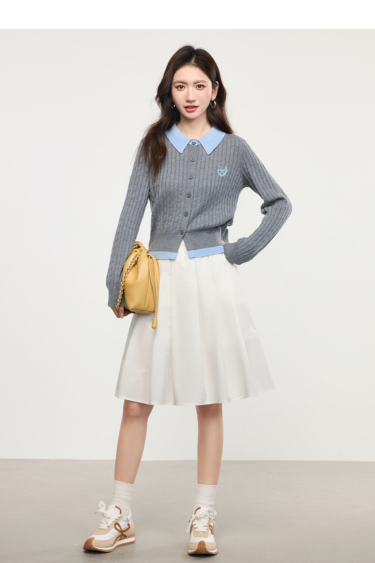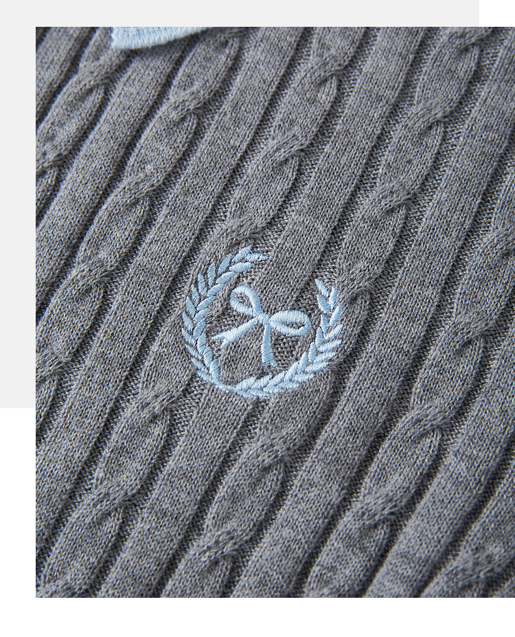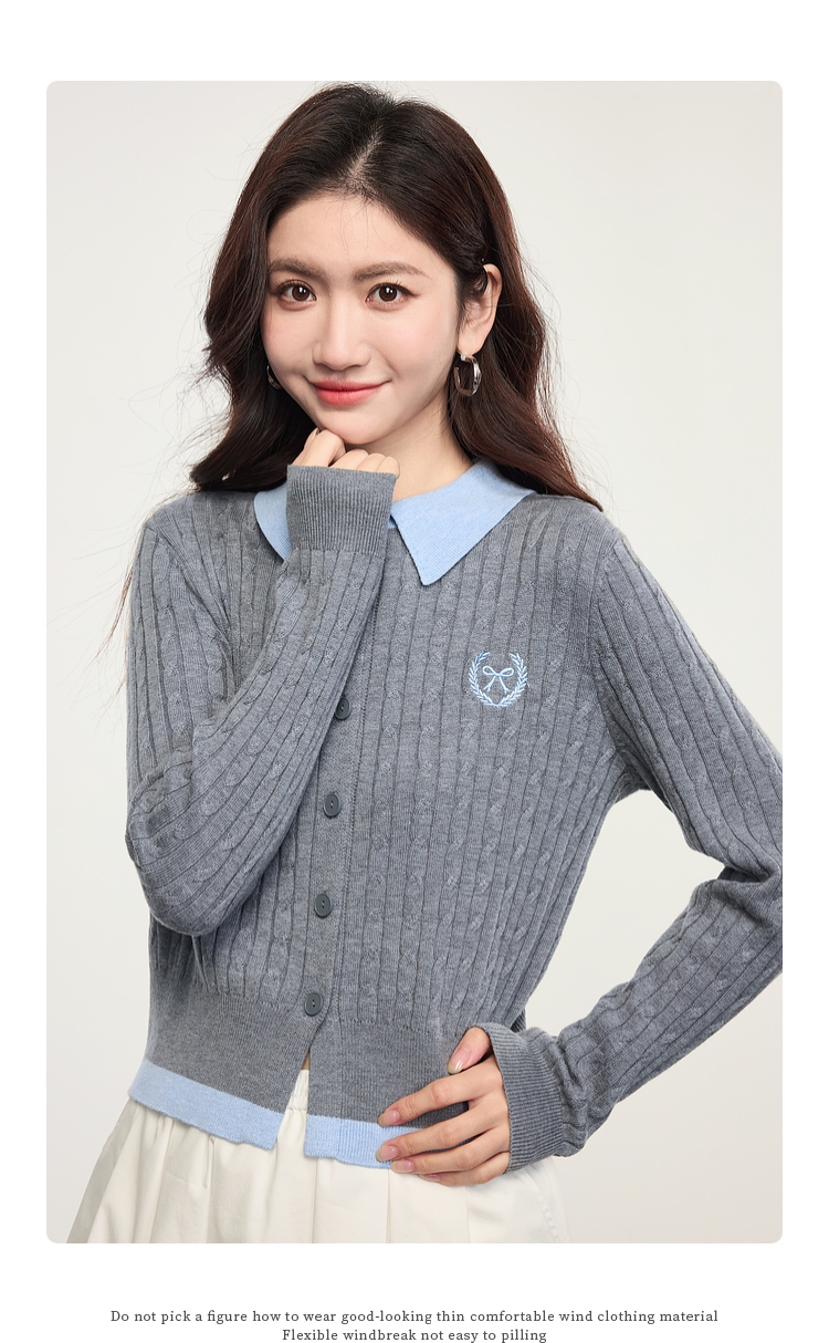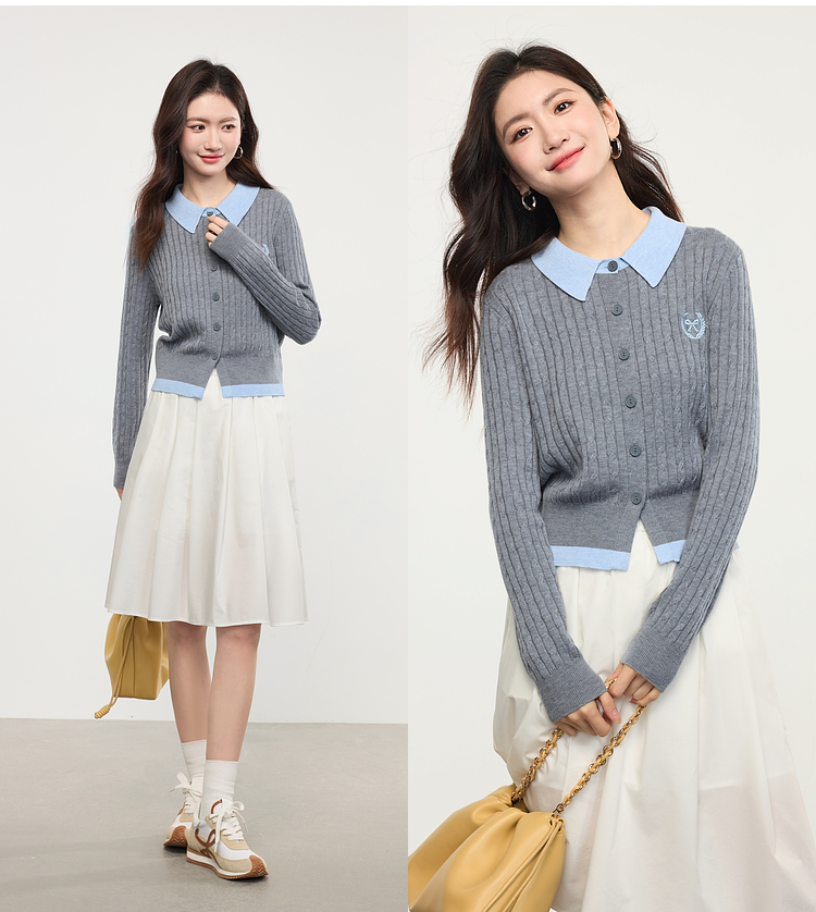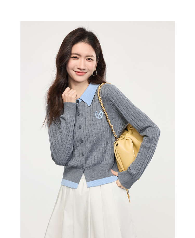 【专属特价】熙世界假两件灰色绞花针织开衫女2025早春新款学院风polo翻领上衣