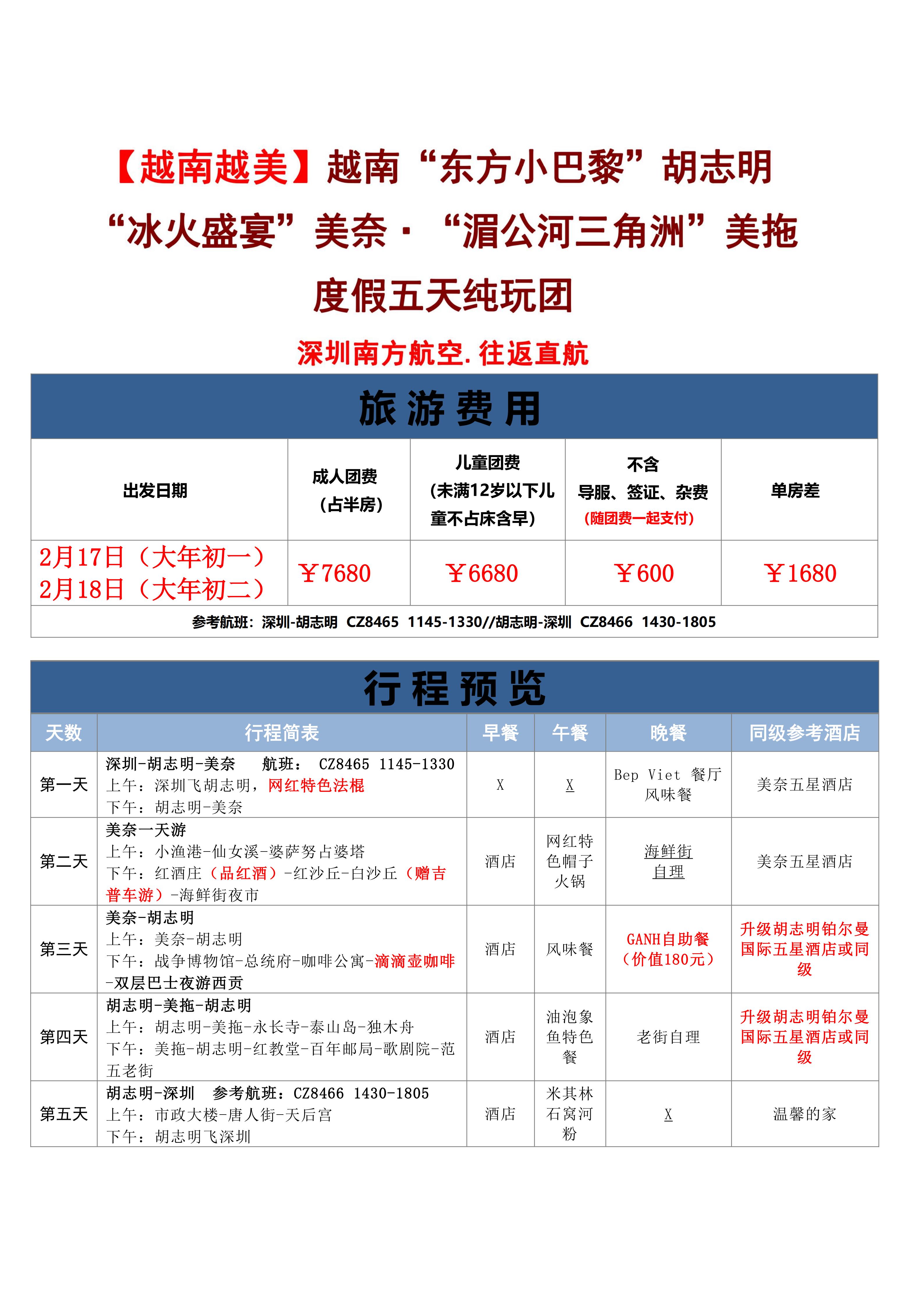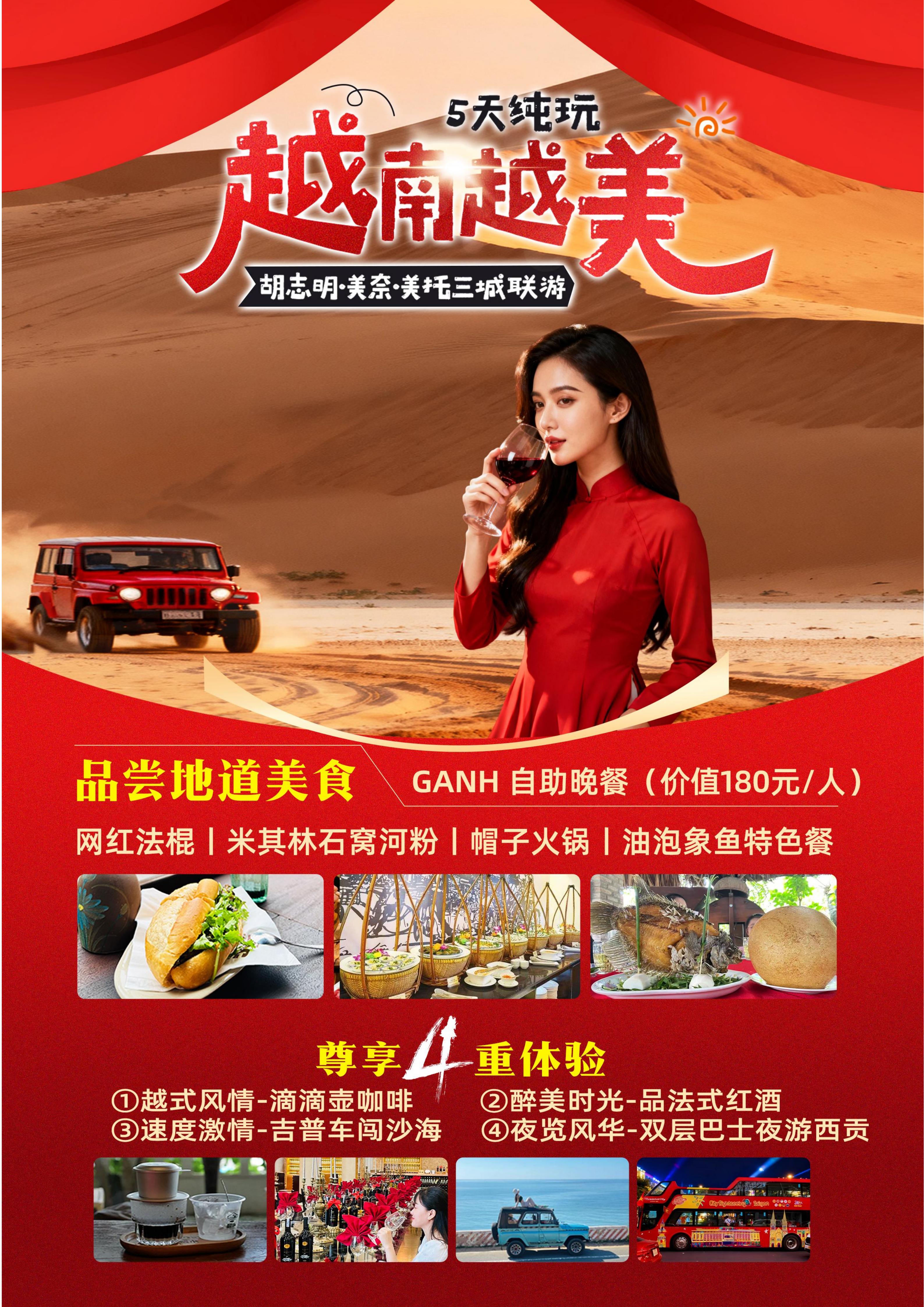 【春节】<越南胡志明+美奈+美托三城联游-深圳直飞往返>全程五星酒店(升级2晚国际五星)、双层巴士夜游西贡、赠送吉普车闯沙海、红酒庄品红酒、泰山岛独木舟、仙女溪、婆萨努占婆塔