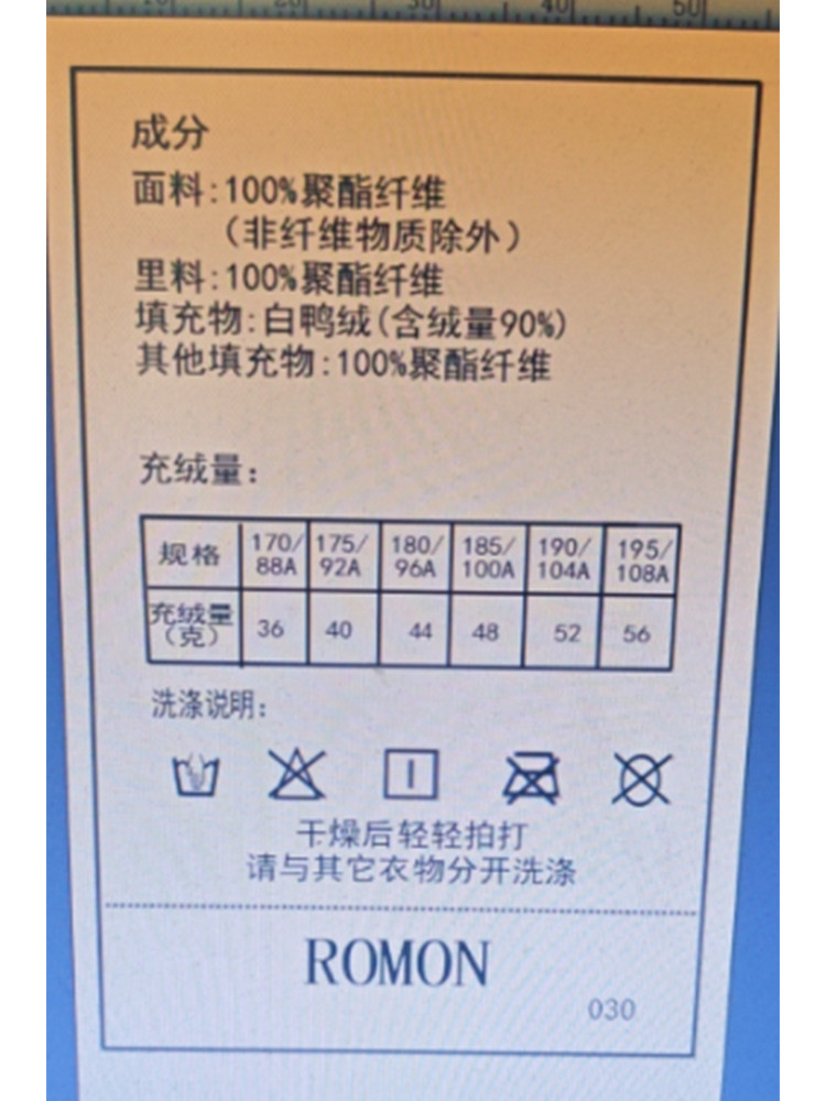 填充物:白鸭绒 (含绒量90%)