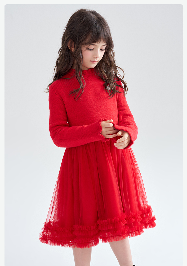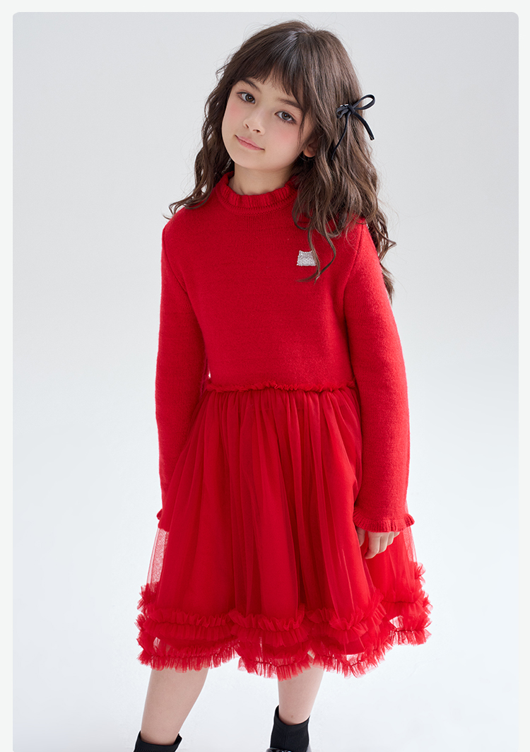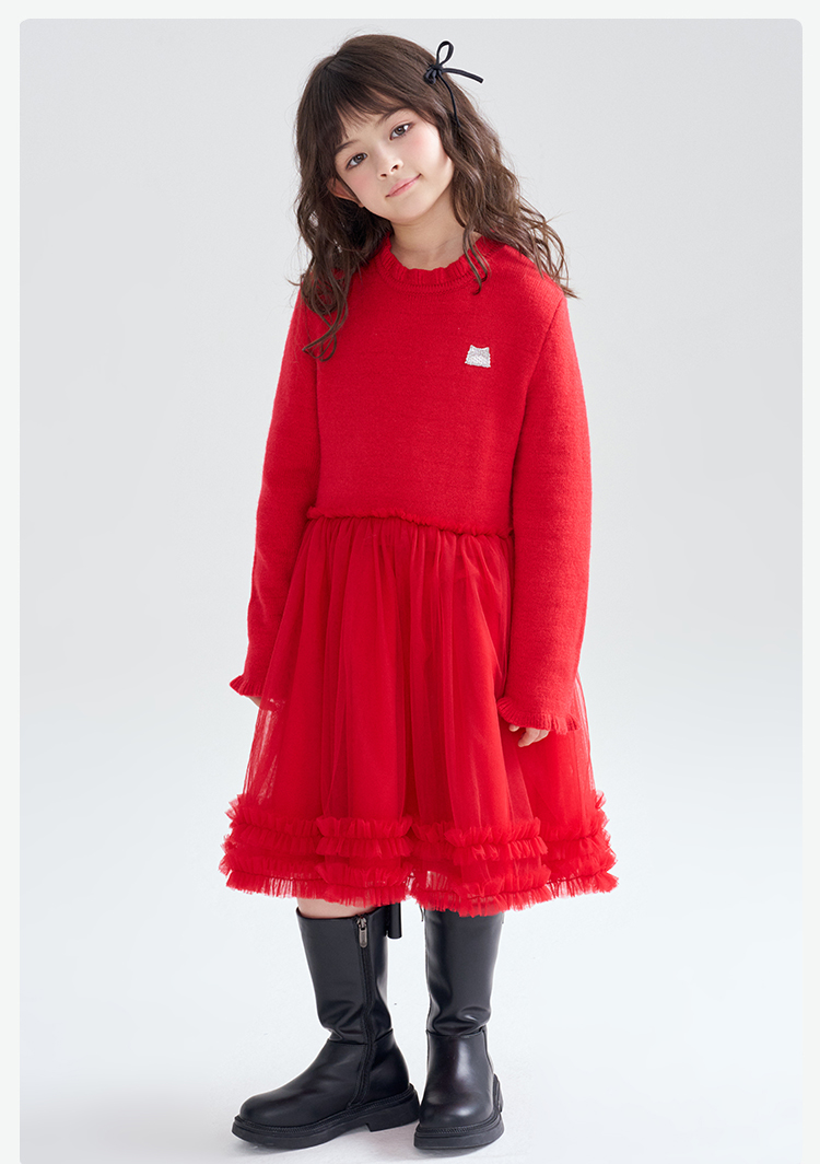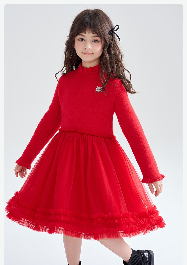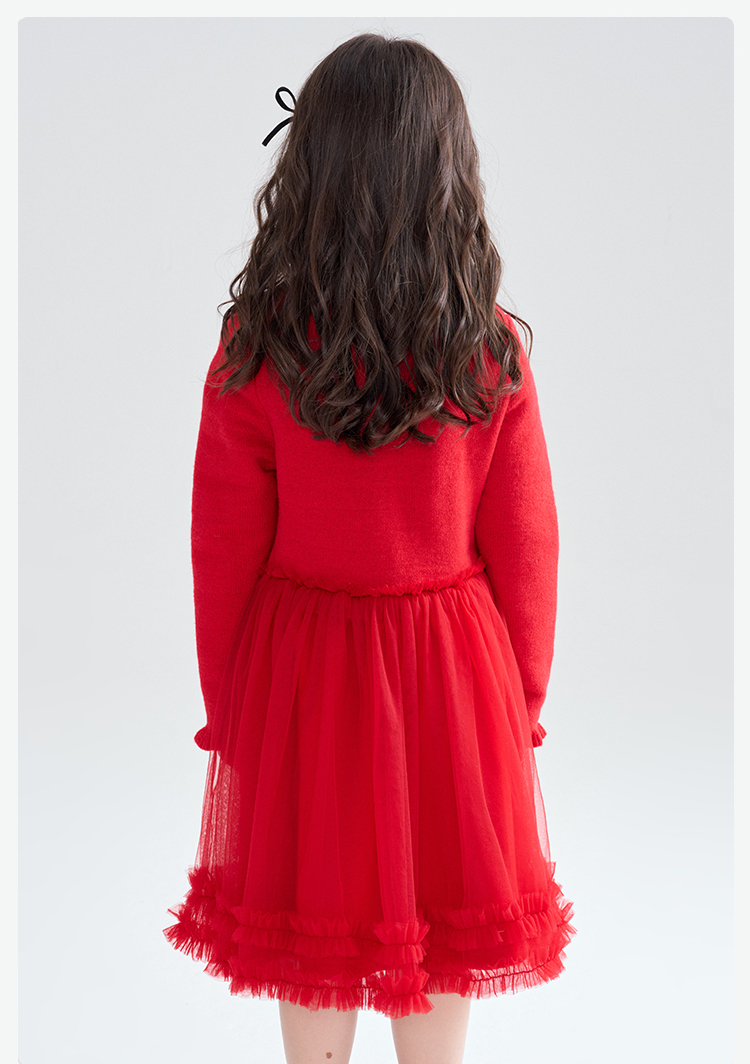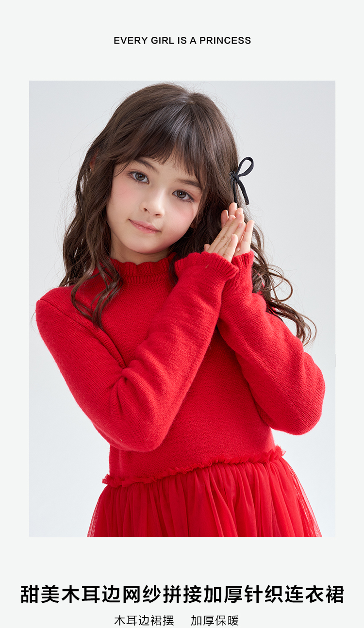 笛莎Deesha 2025冬季女童甜美木耳边网纱拼接加厚针织连衣裙