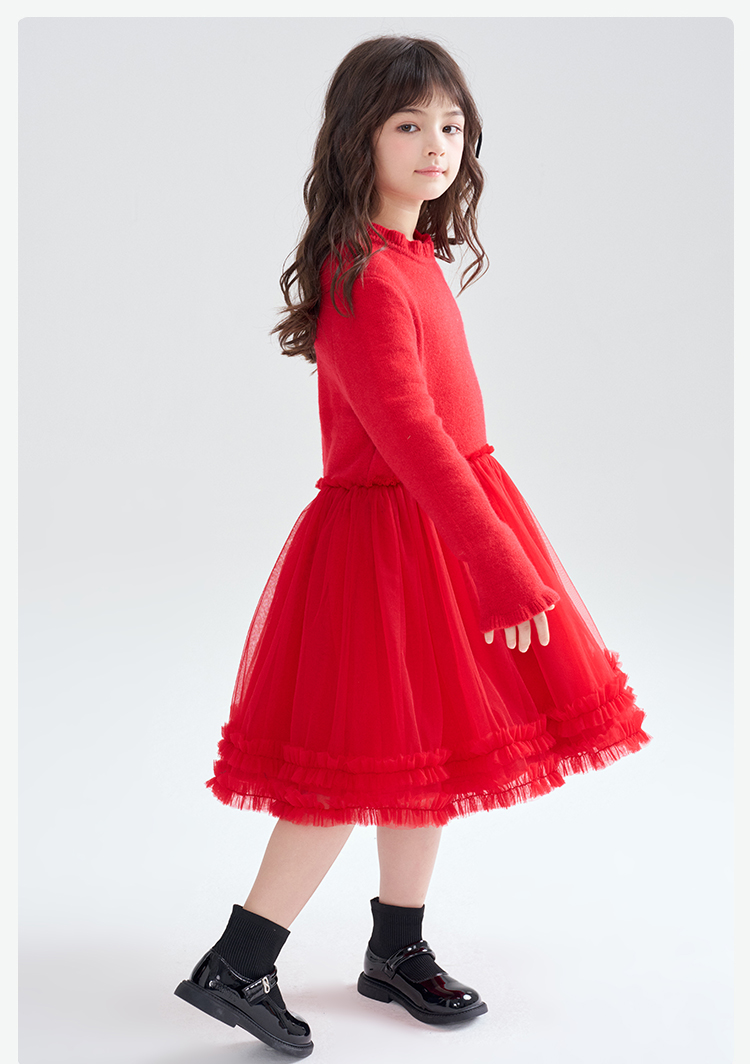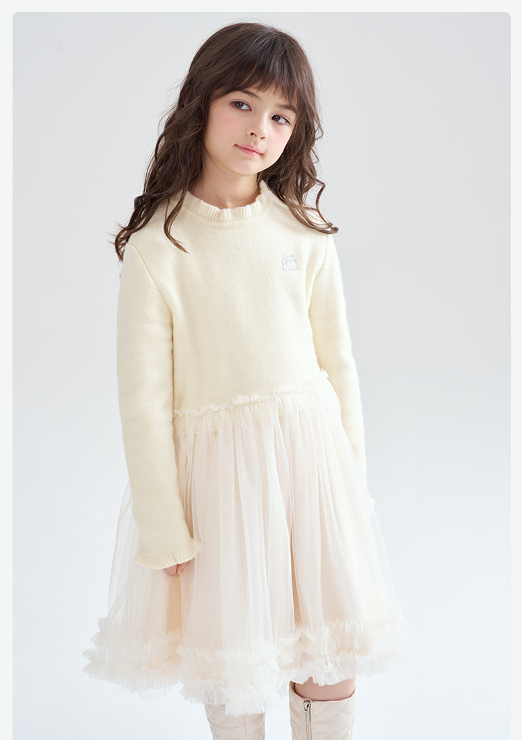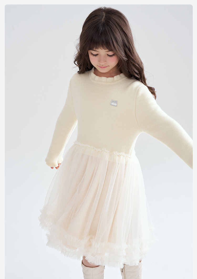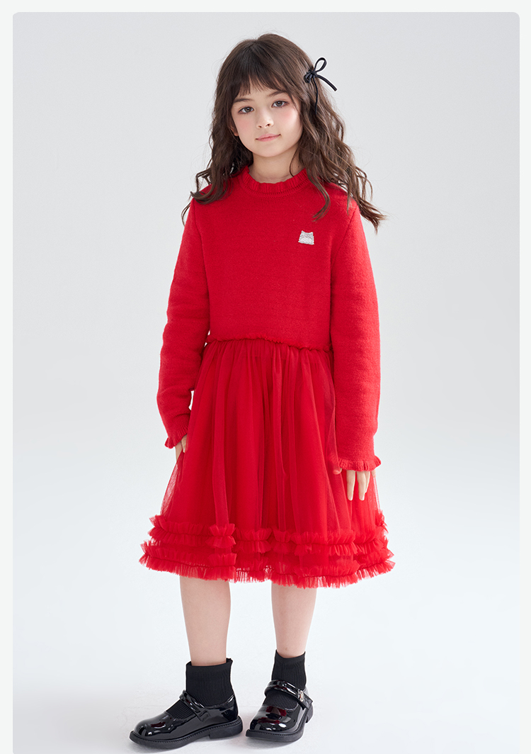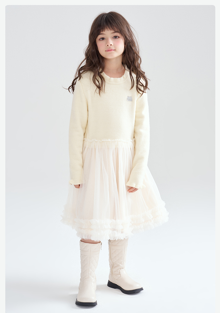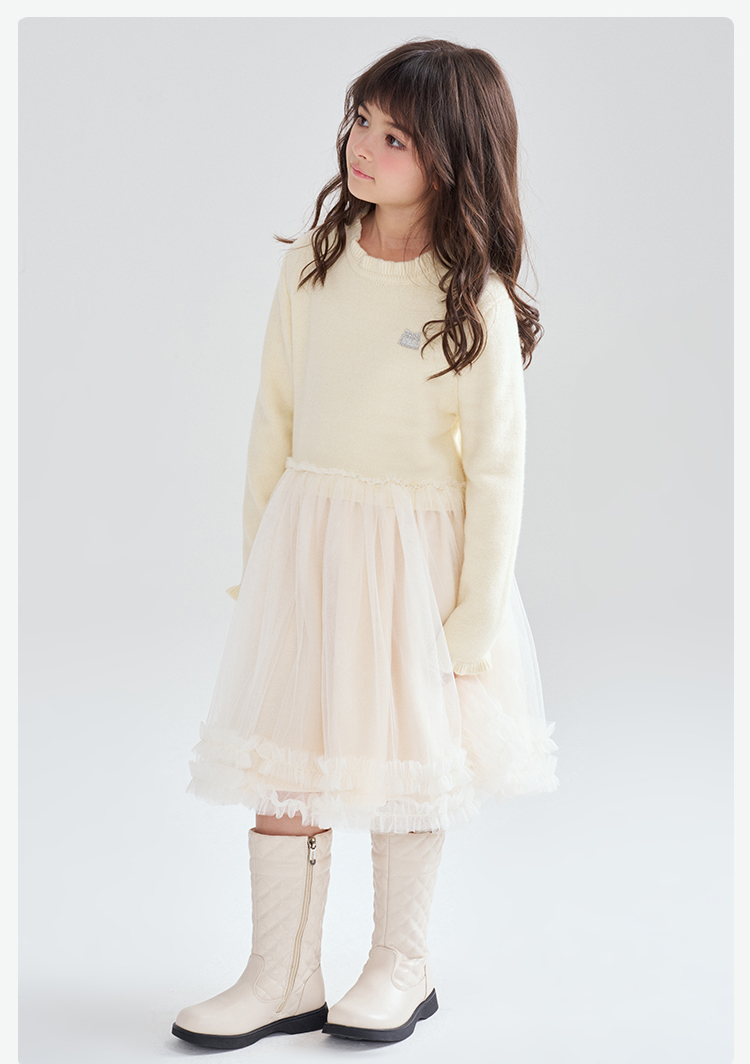 笛莎Deesha 2025冬季女童甜美木耳边网纱拼接加厚针织连衣裙