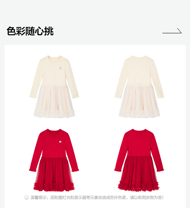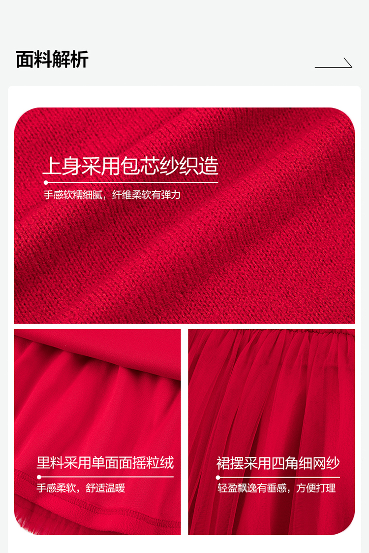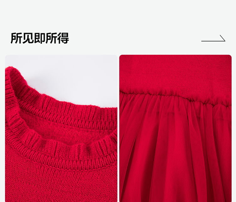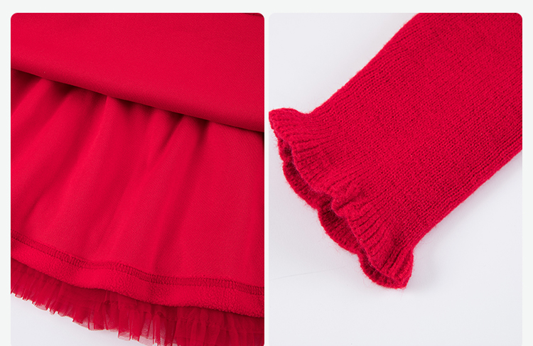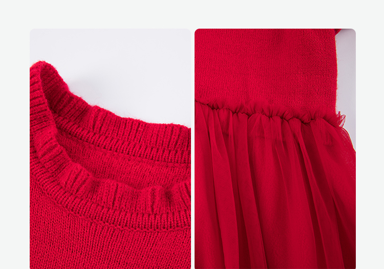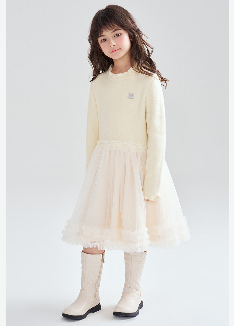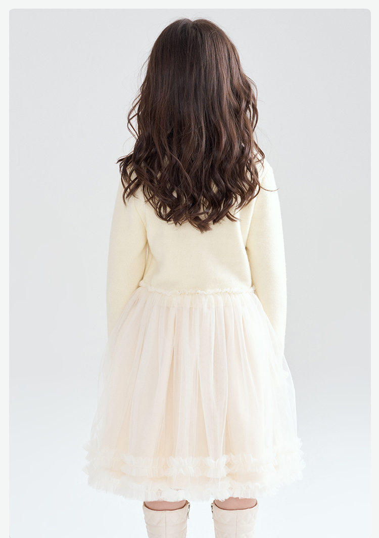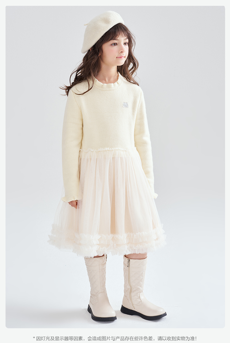 笛莎Deesha 2025冬季女童甜美木耳边网纱拼接加厚针织连衣裙