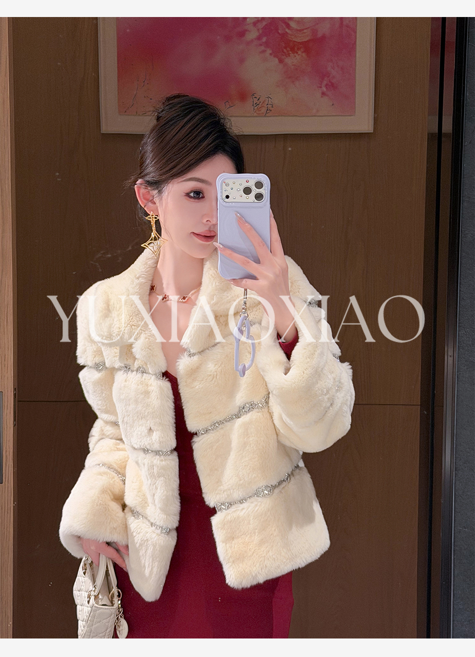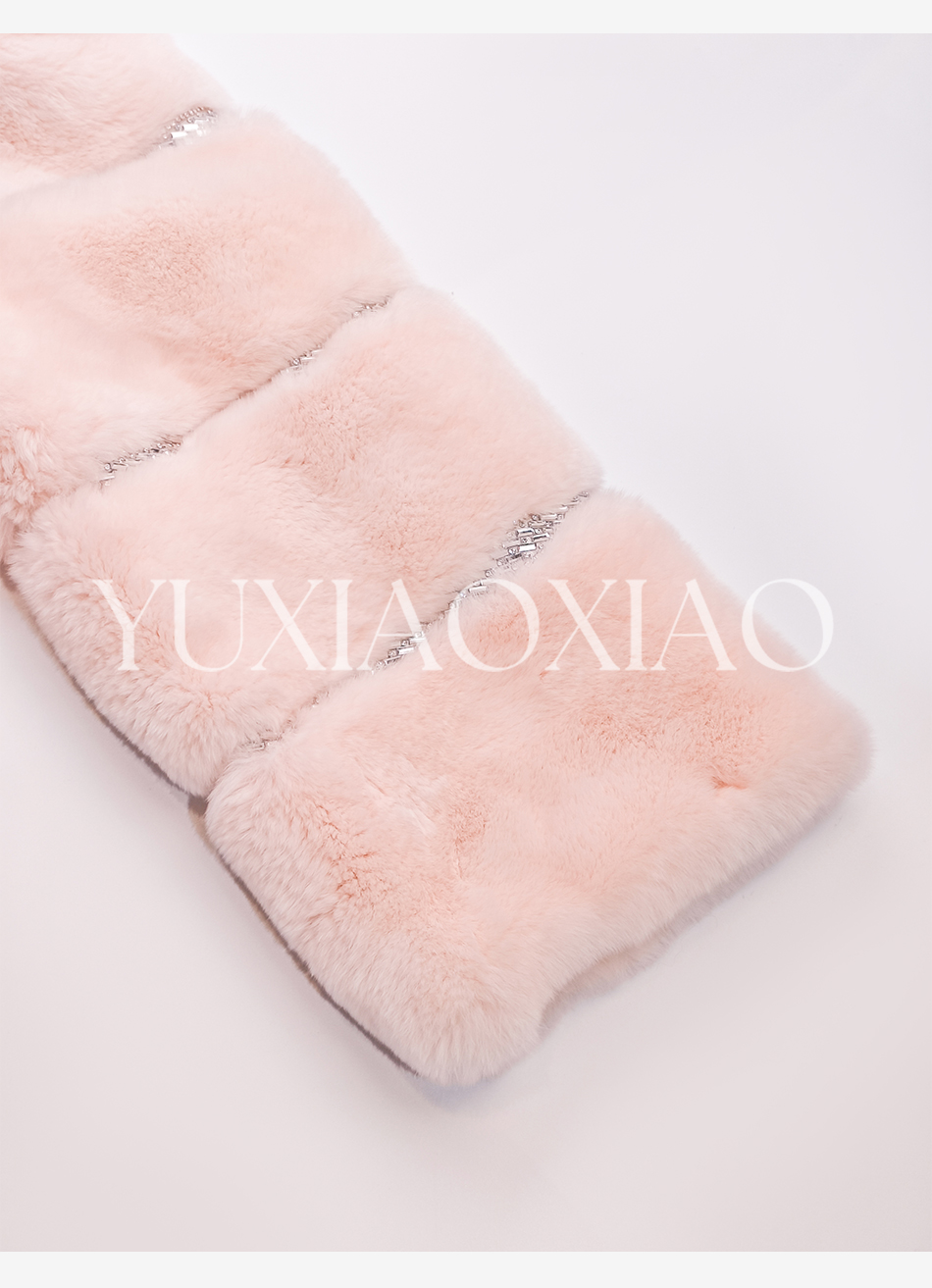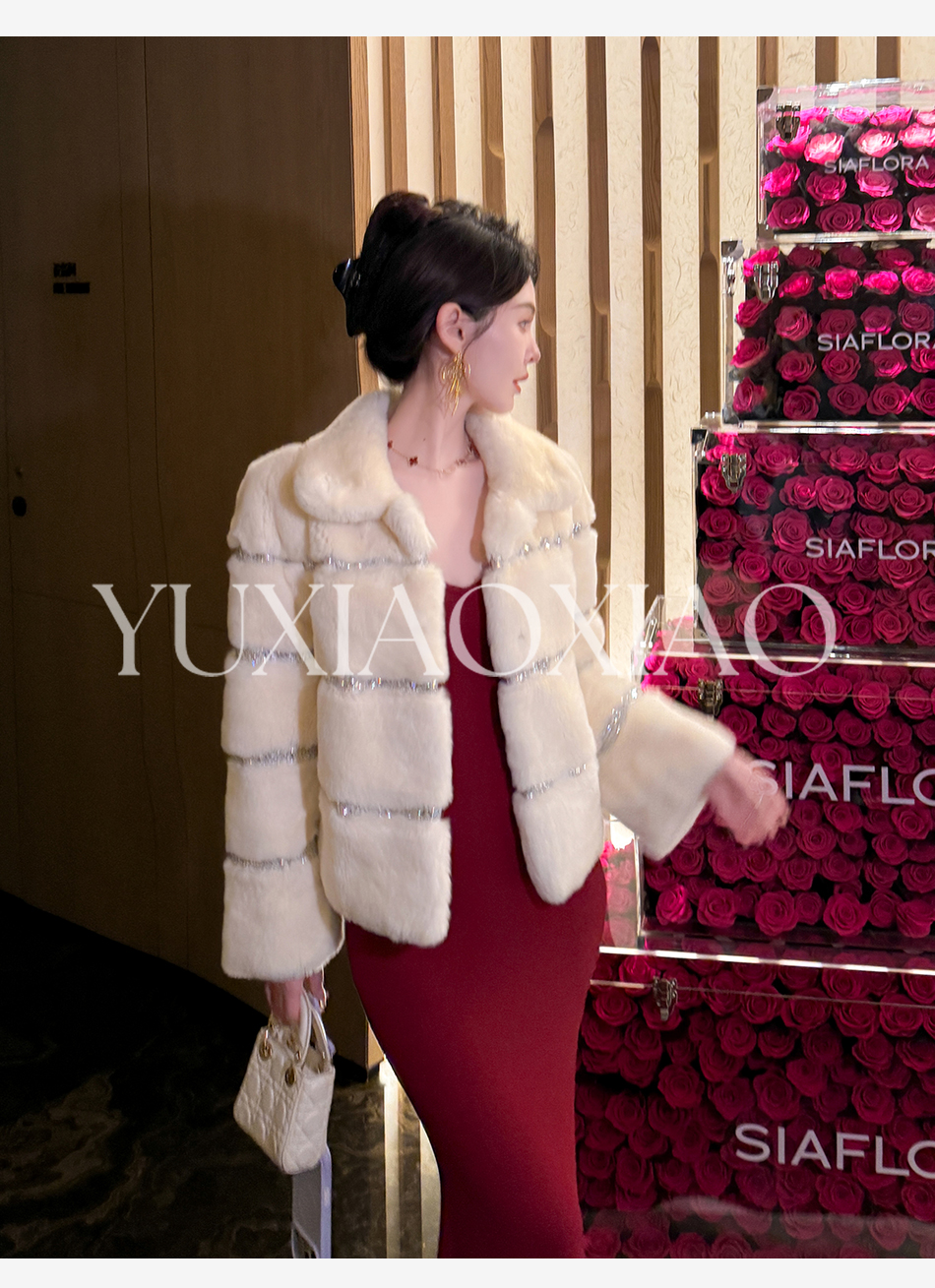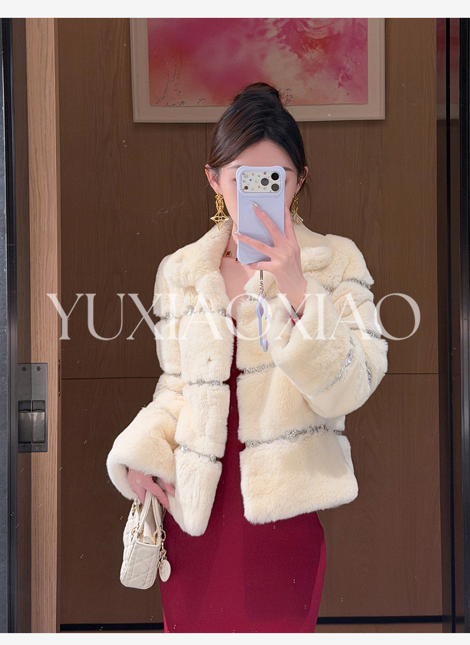 余潇潇【灵感缪斯】100雷克斯獭兔毛内里夹棉水钻织带气质翻领皮草