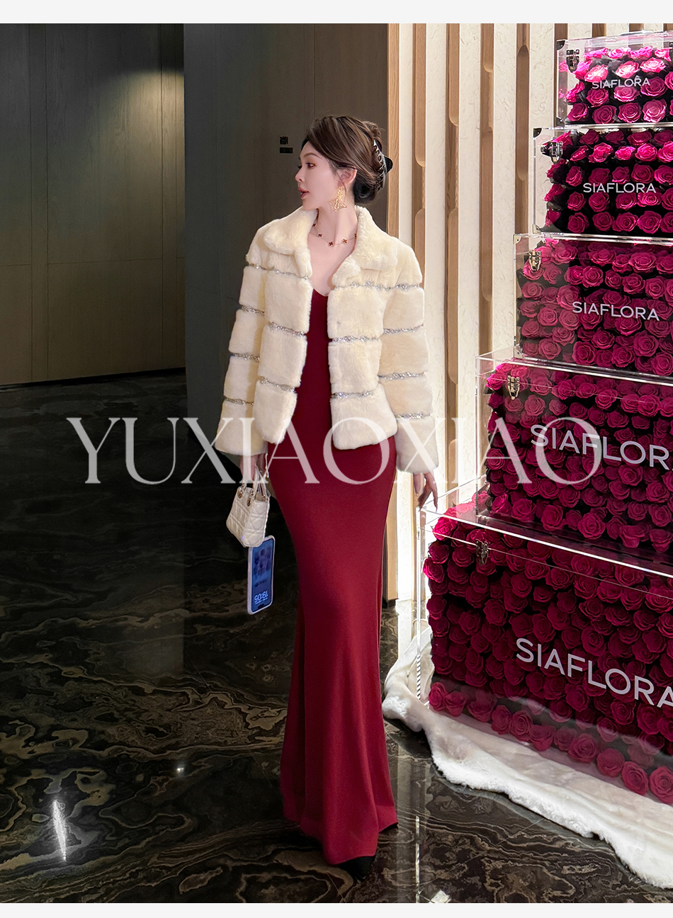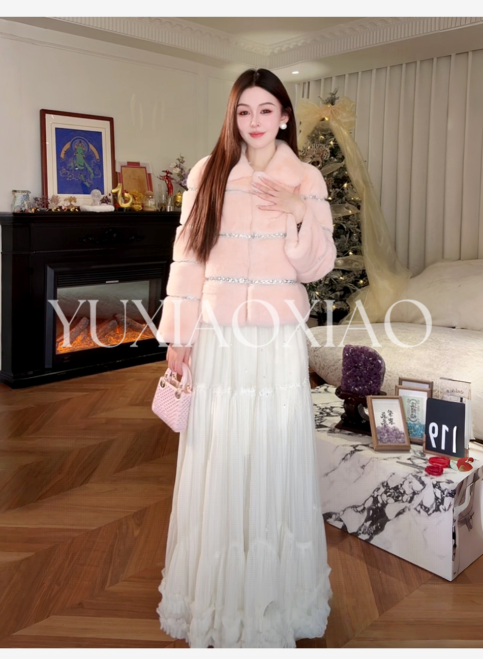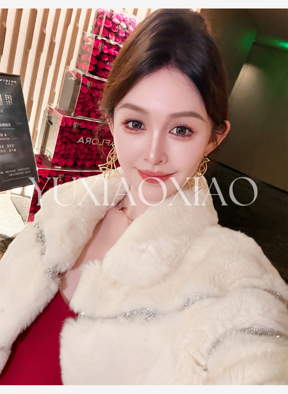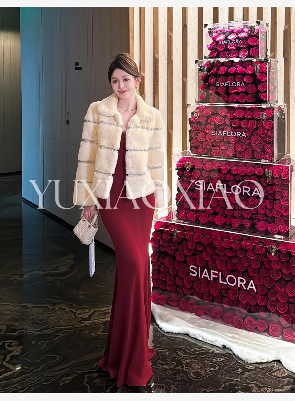 余潇潇【灵感缪斯】100雷克斯獭兔毛内里夹棉水钻织带气质翻领皮草