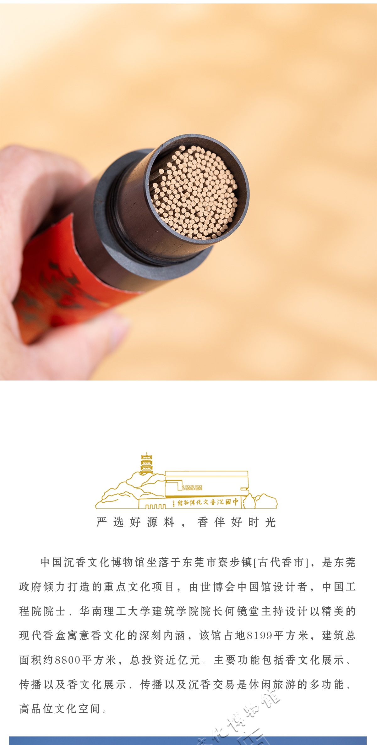 中国沉香文化博物馆坐落于古代[香市]东莞市寮步镇,是东莞政府倾力打造的重点文化项目,由世博会中国馆设计者,中国工程院院士、华南理工大学建筑学院院长何镜堂主持设计,以精美的现代[香盒]寓意香文化的深刻内