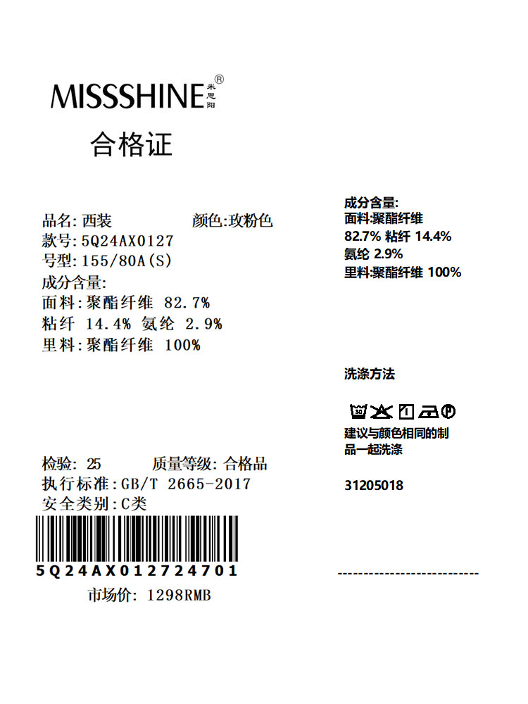 | 面料 | 聚酯纤维 82.7% 粘纤 14.4% 氨纶 2.9% |