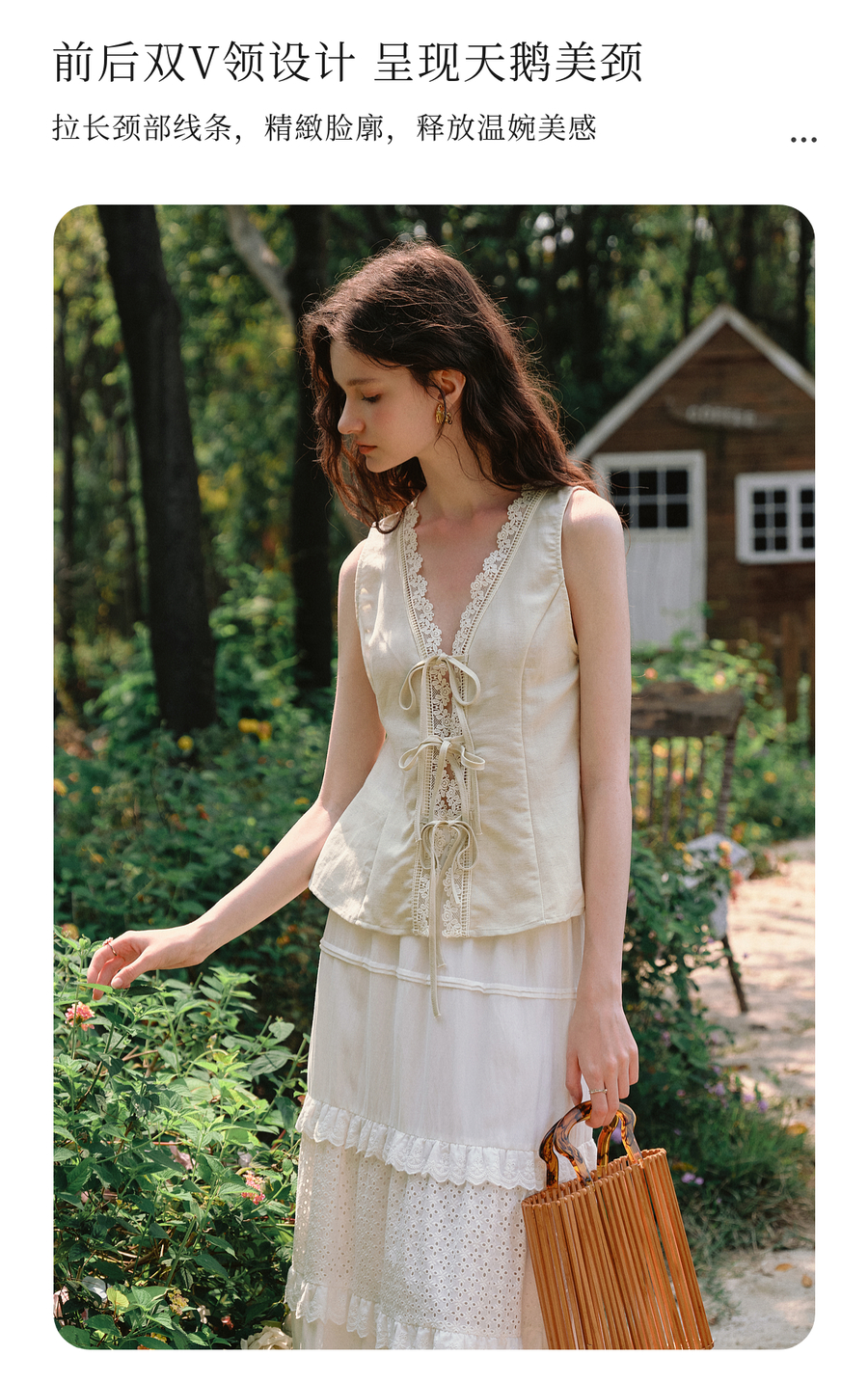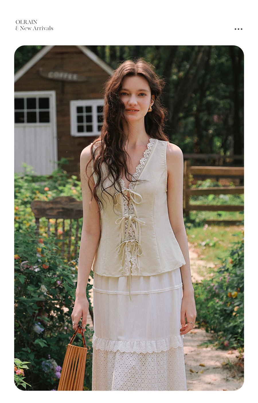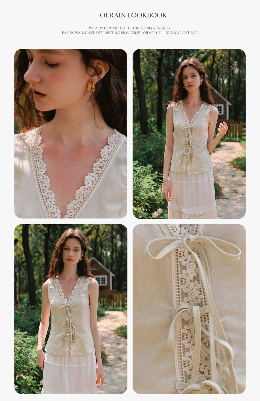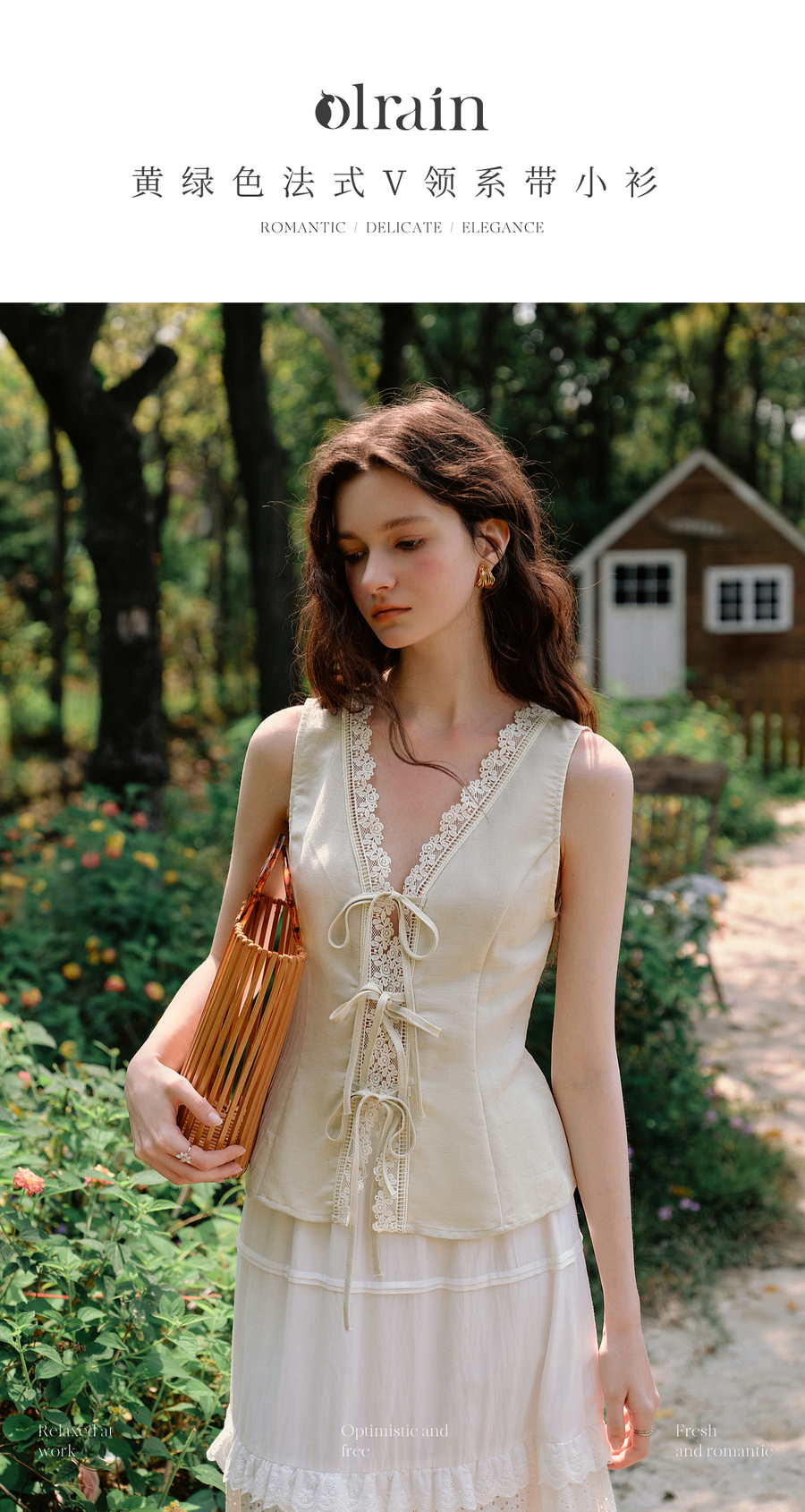 OLrain欧芮儿法式V领小衫夏季2025新款甜美纯欲蕾丝拼接系带背心
